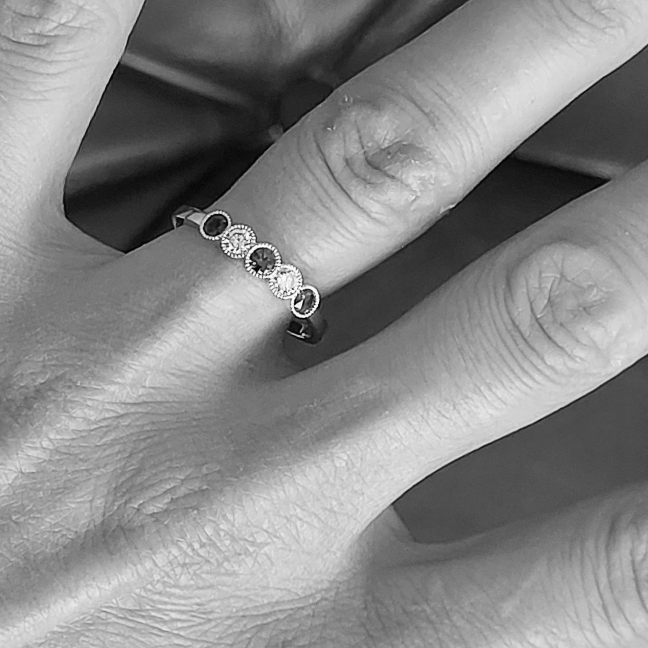 This Half Eternity Ring is currently a Size O and be sized or, if necessary ordered o suit. It is also available to order in a variety of sizes and gemstones.