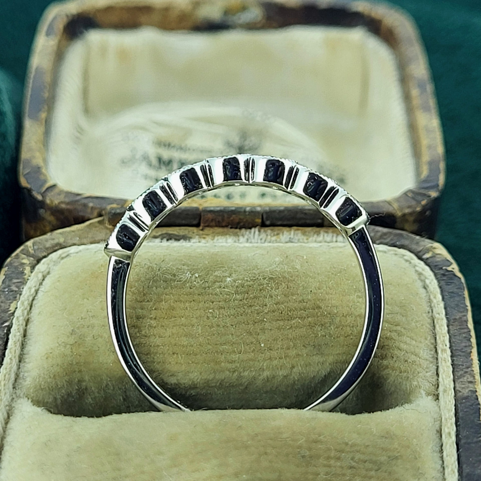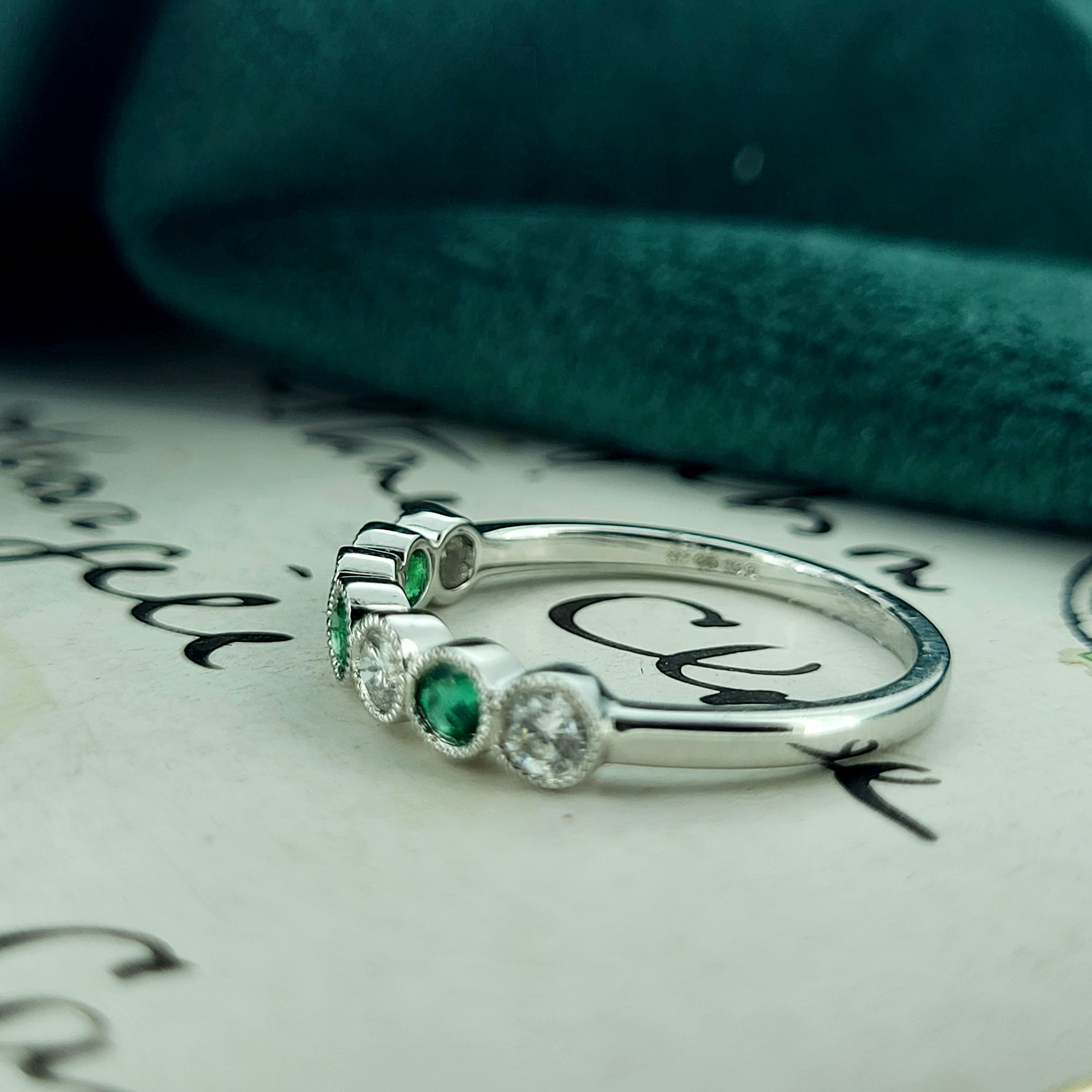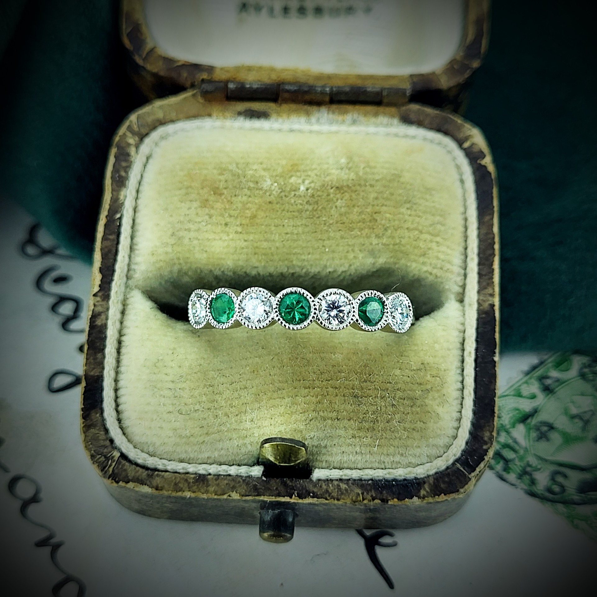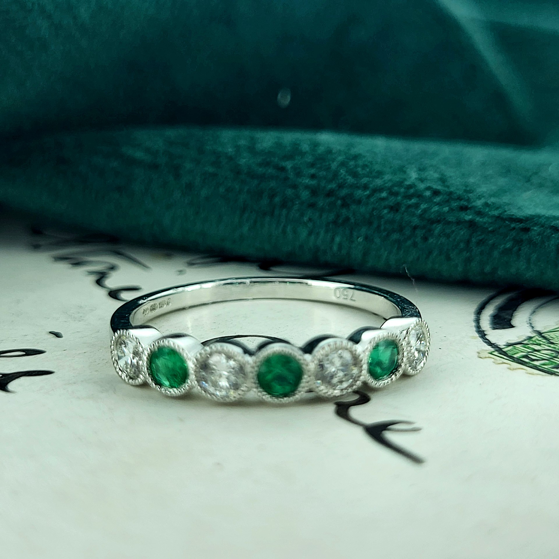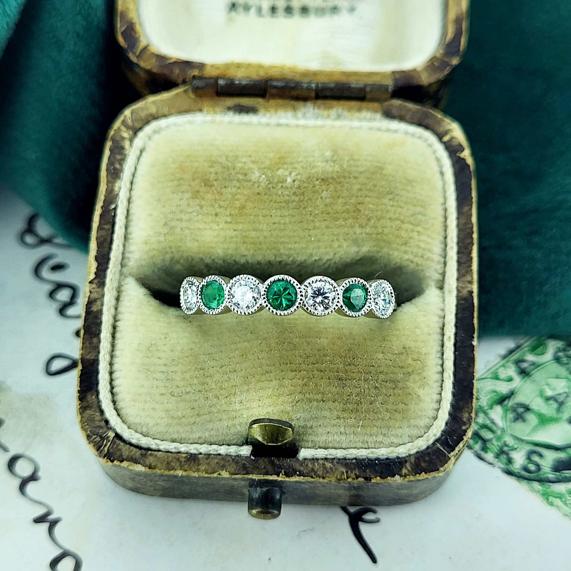 A touch of vintage appeal graces this Half Eternity Ring that is set with Round Brilliant Emeralds and Diamonds with a wonderful contrast between the two.