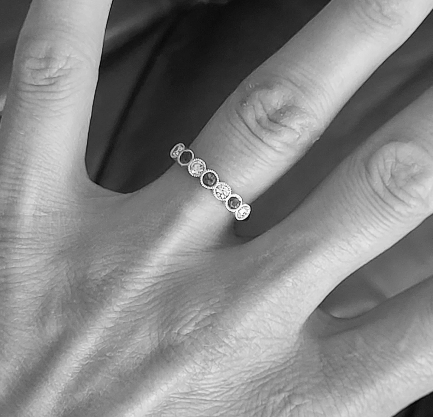 his ring is crafted from 18ct white gold and is currently a size O but can easily be resized or ordered to fit. It is also available in Ruby, Blue Sapphire and Pink Sapphire.