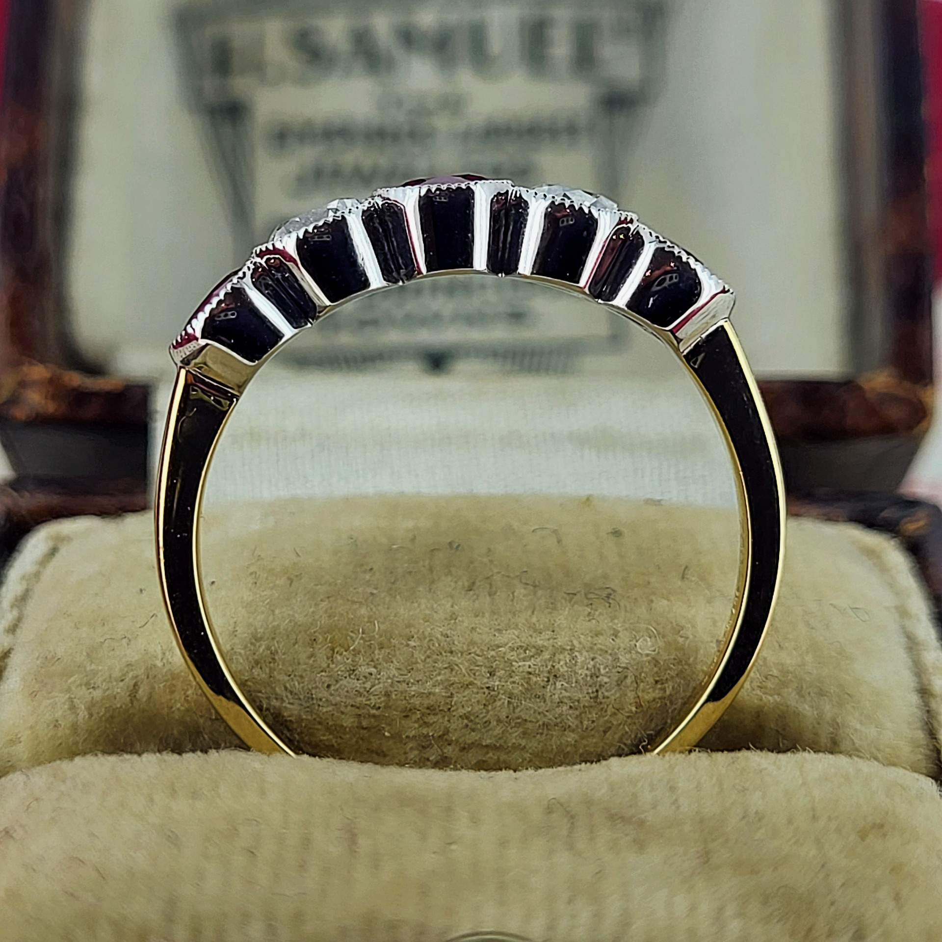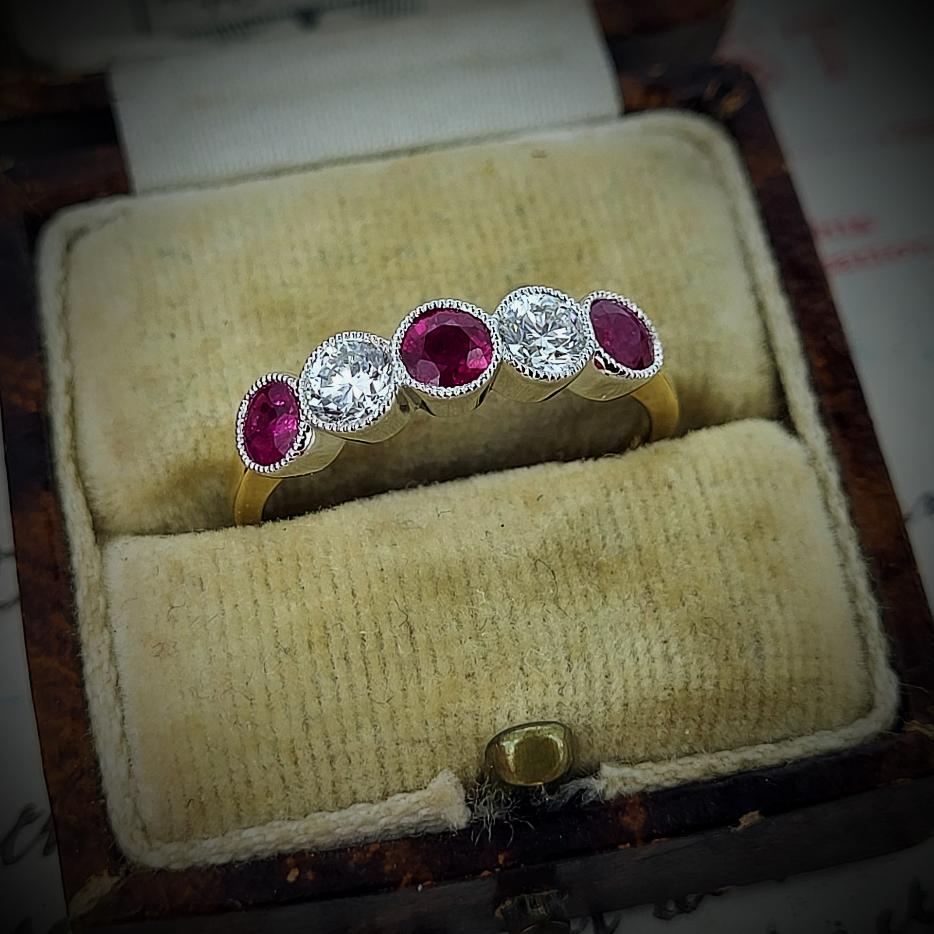 A beautiful Eternity Ring which is set with alternating Rubies and Diamonds in a wonderfully smooth rub-over setting.