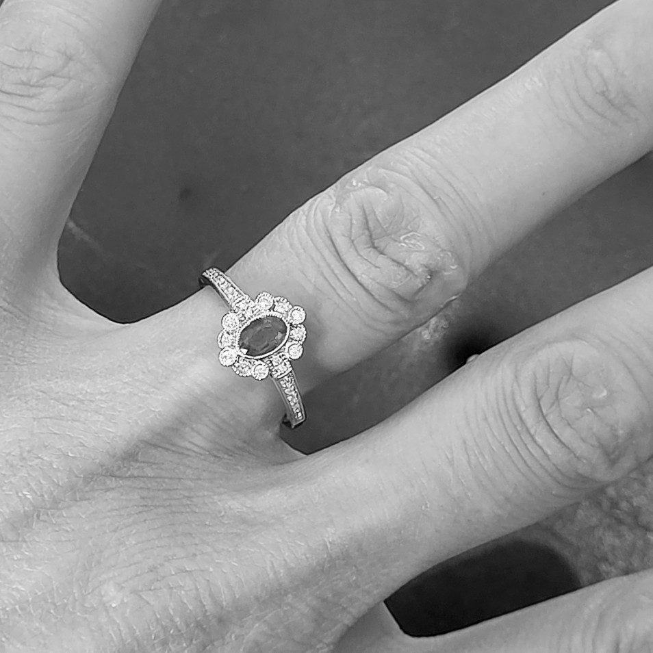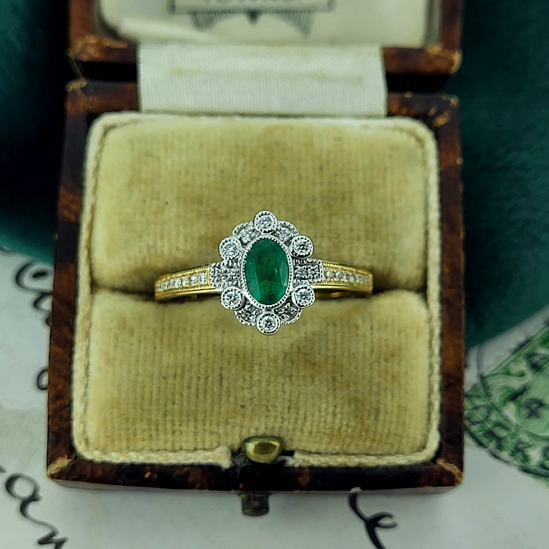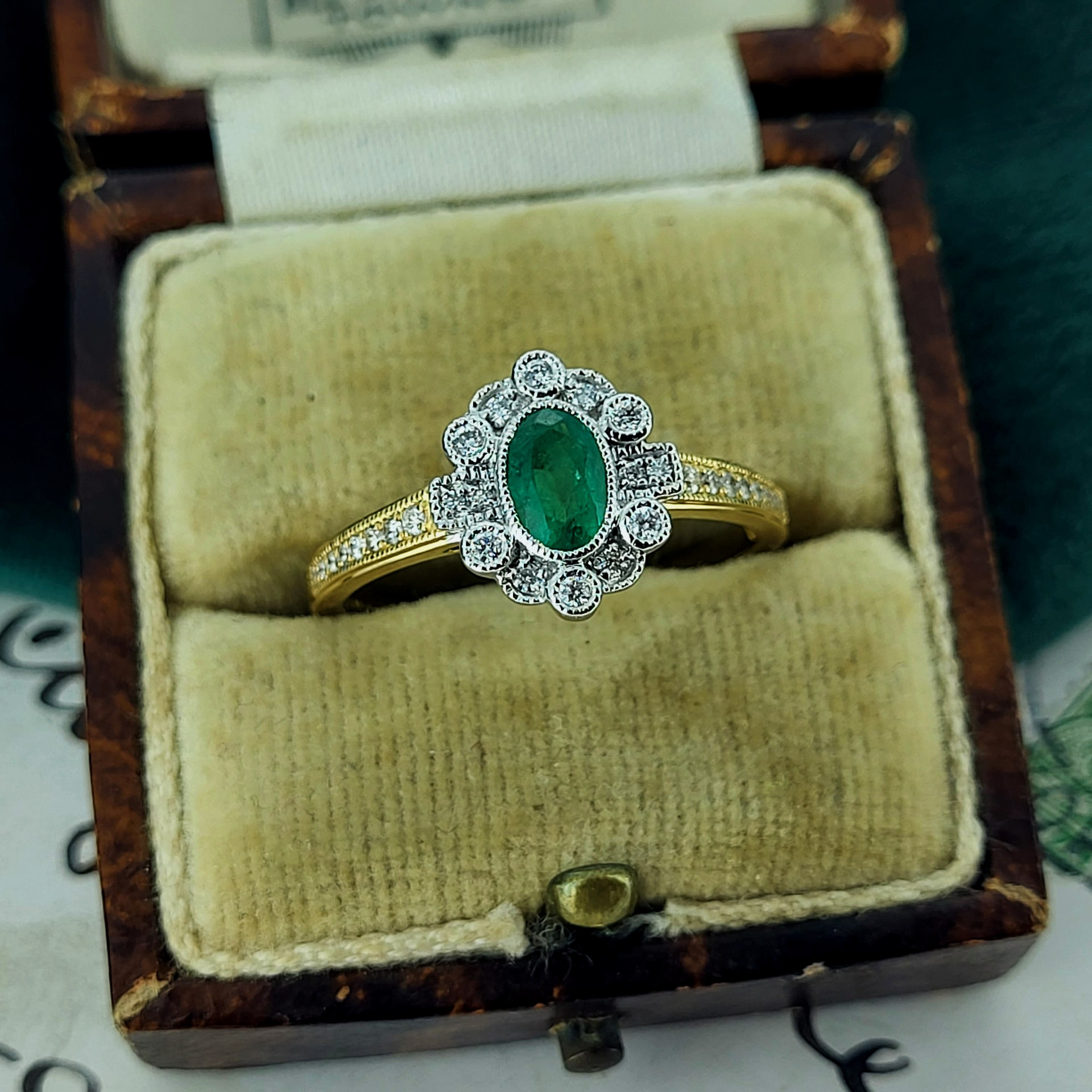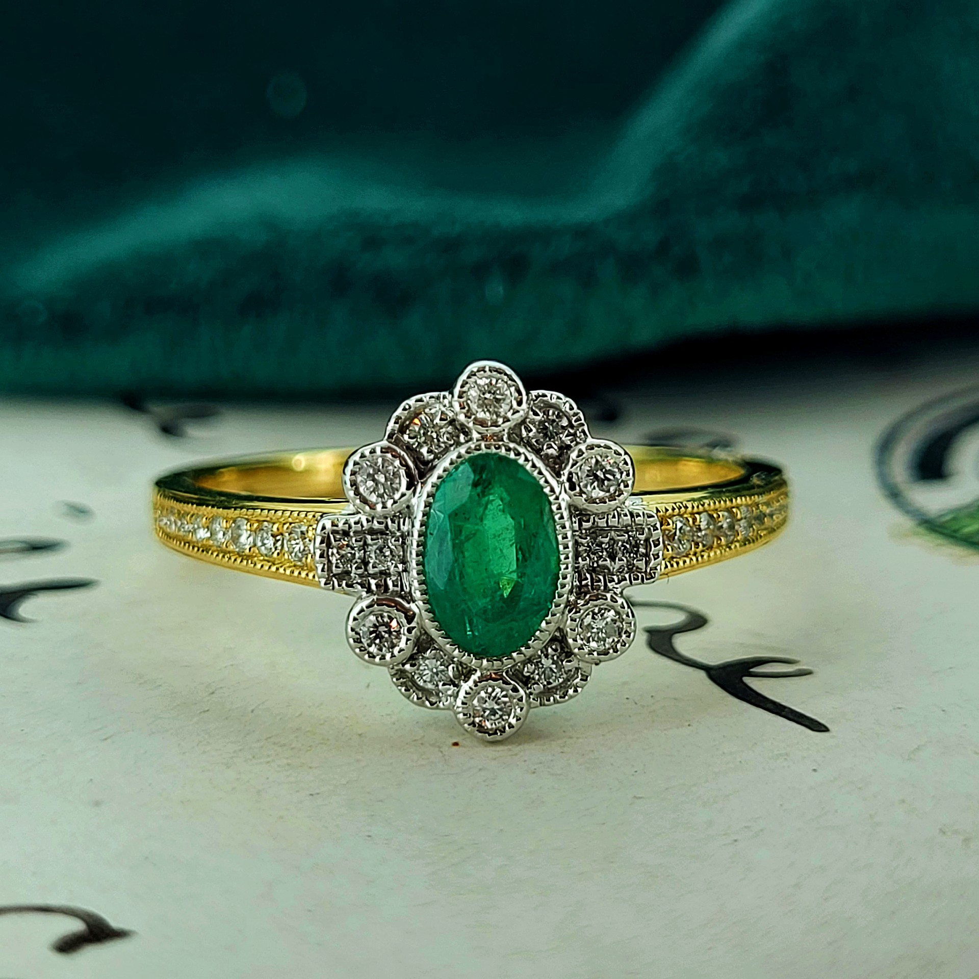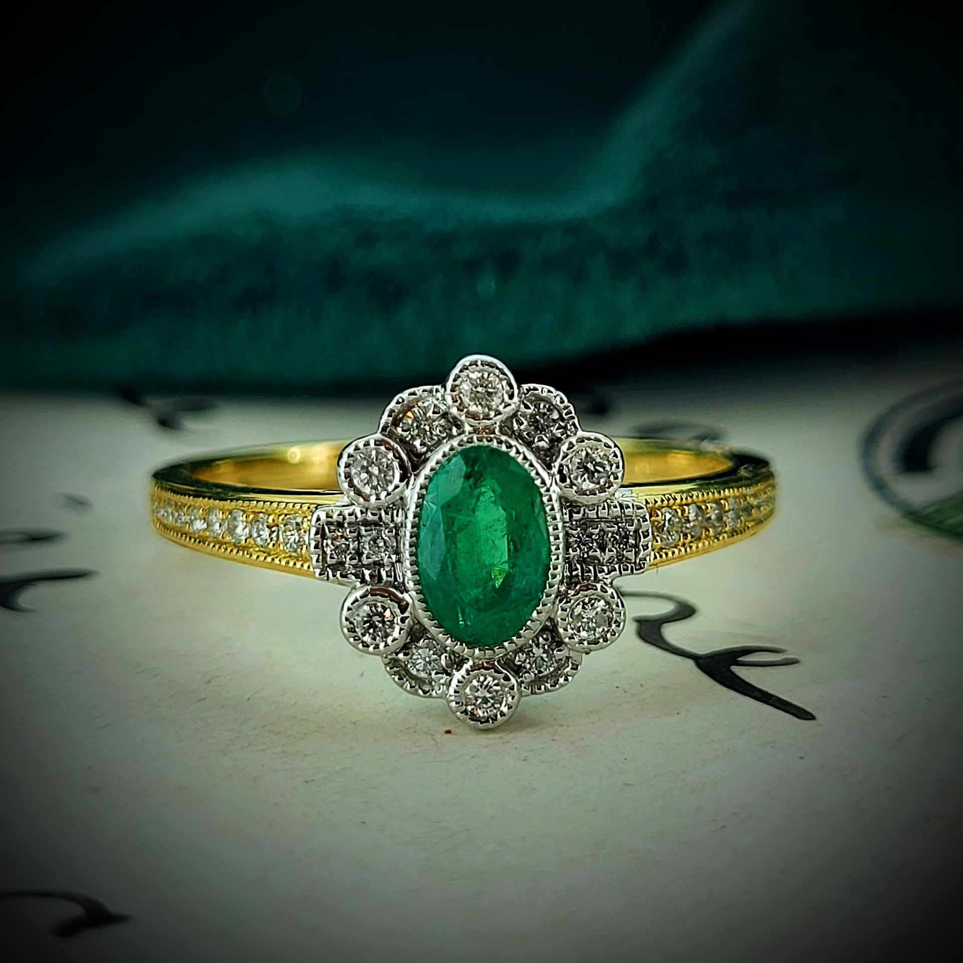 A traditional emerald and diamond cluster ring featuring a step a step up, step down design. The 6mm by 4mm oval emerald is a beautiful bright green and is surrounded by round brilliant diamonds that are set in a distinctive design of alternate heights.