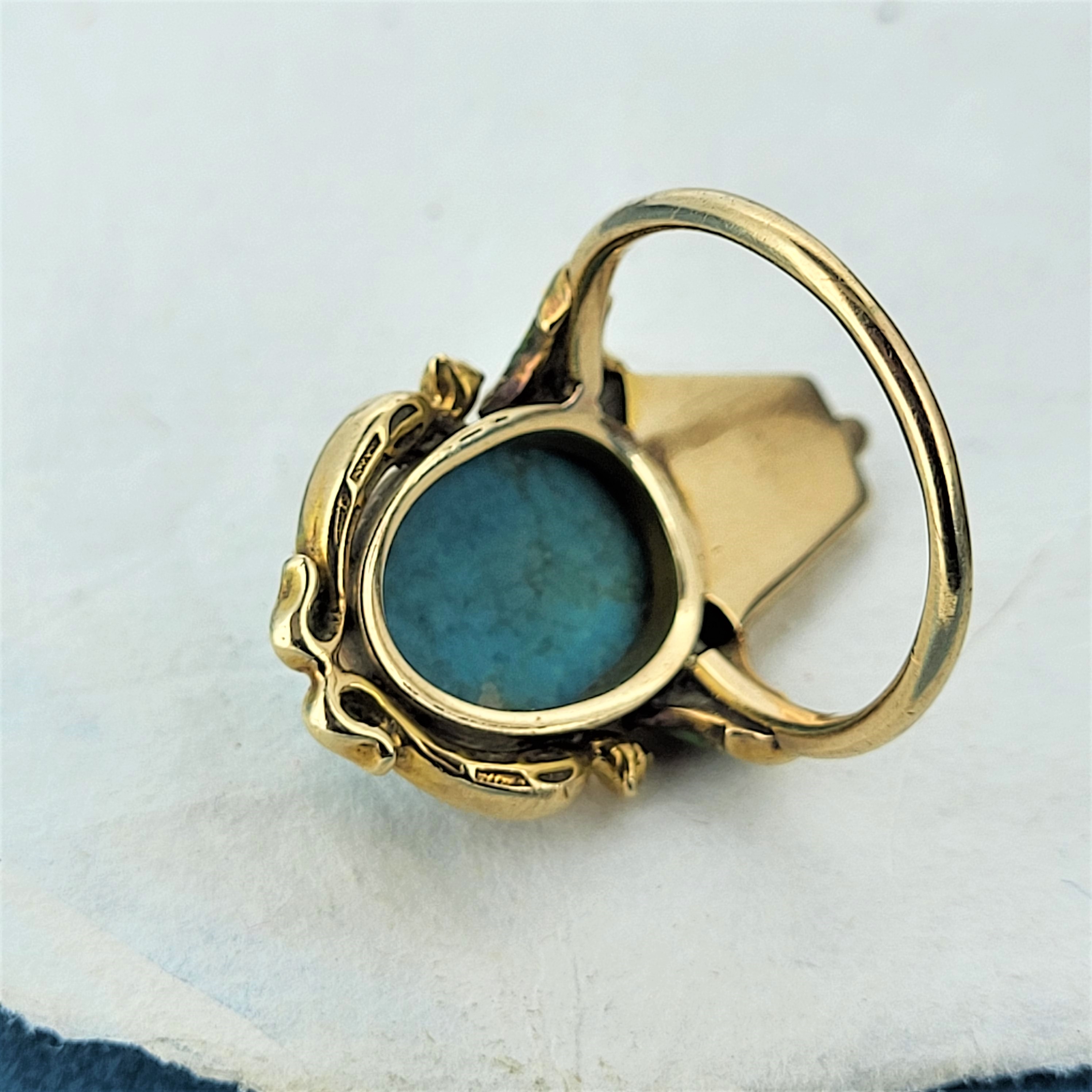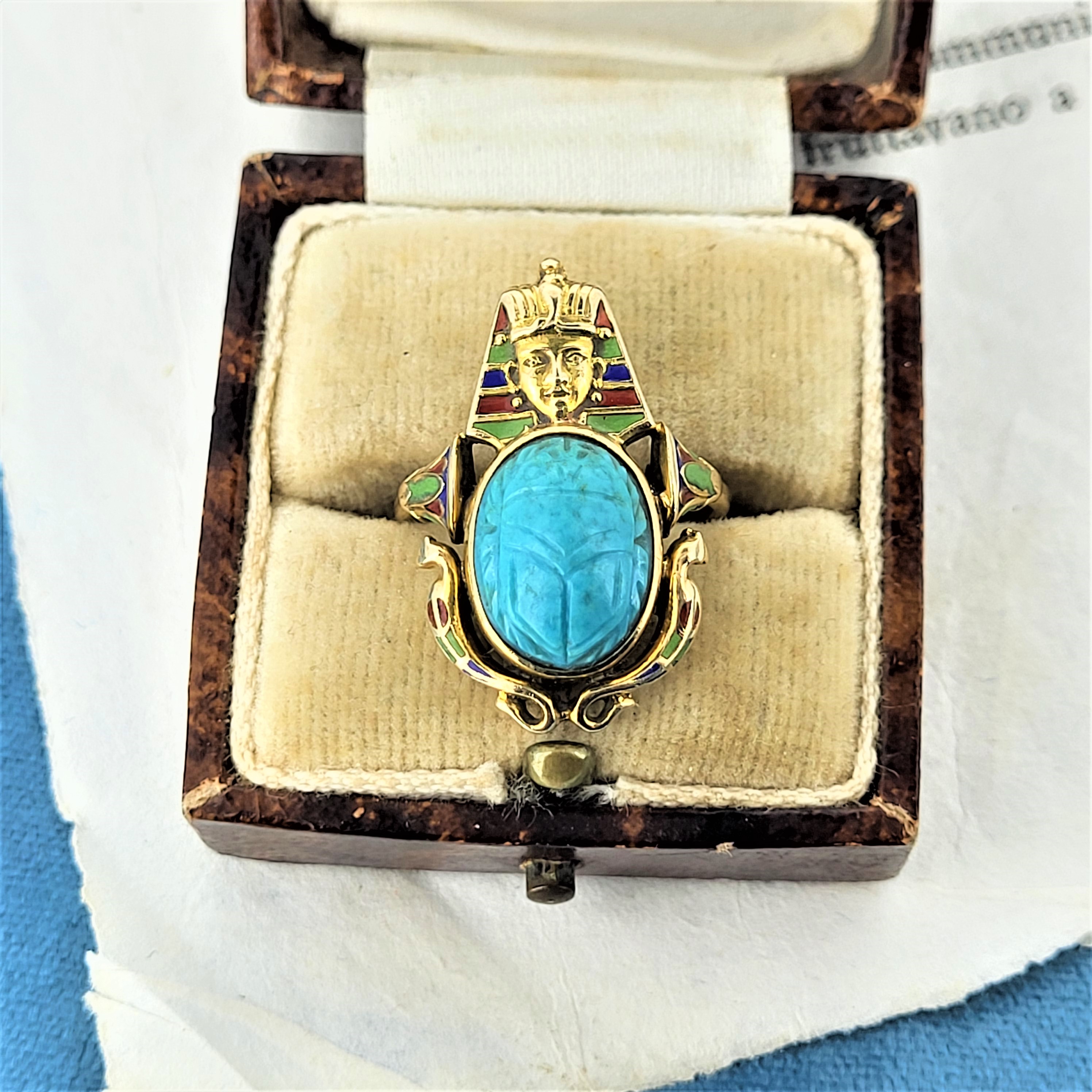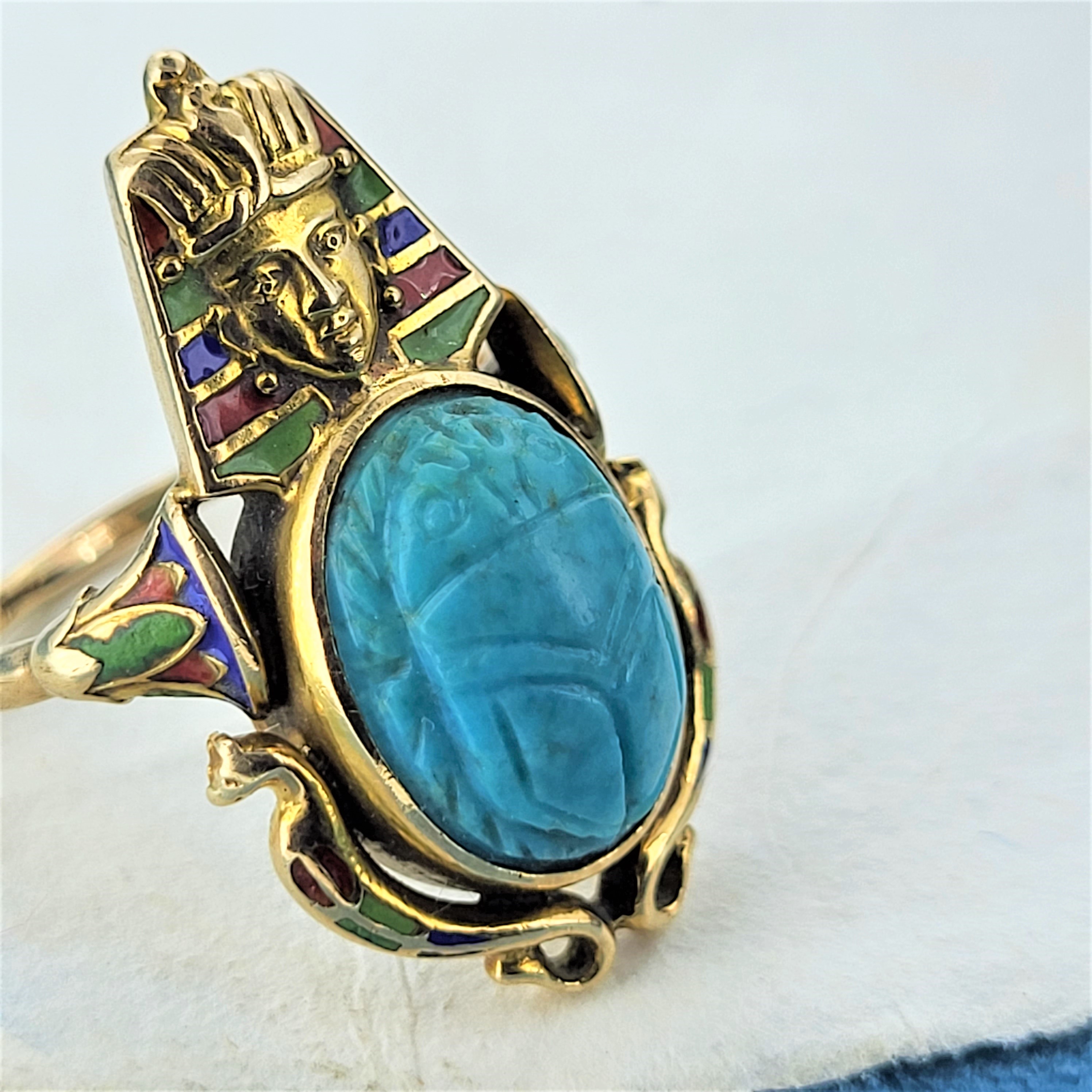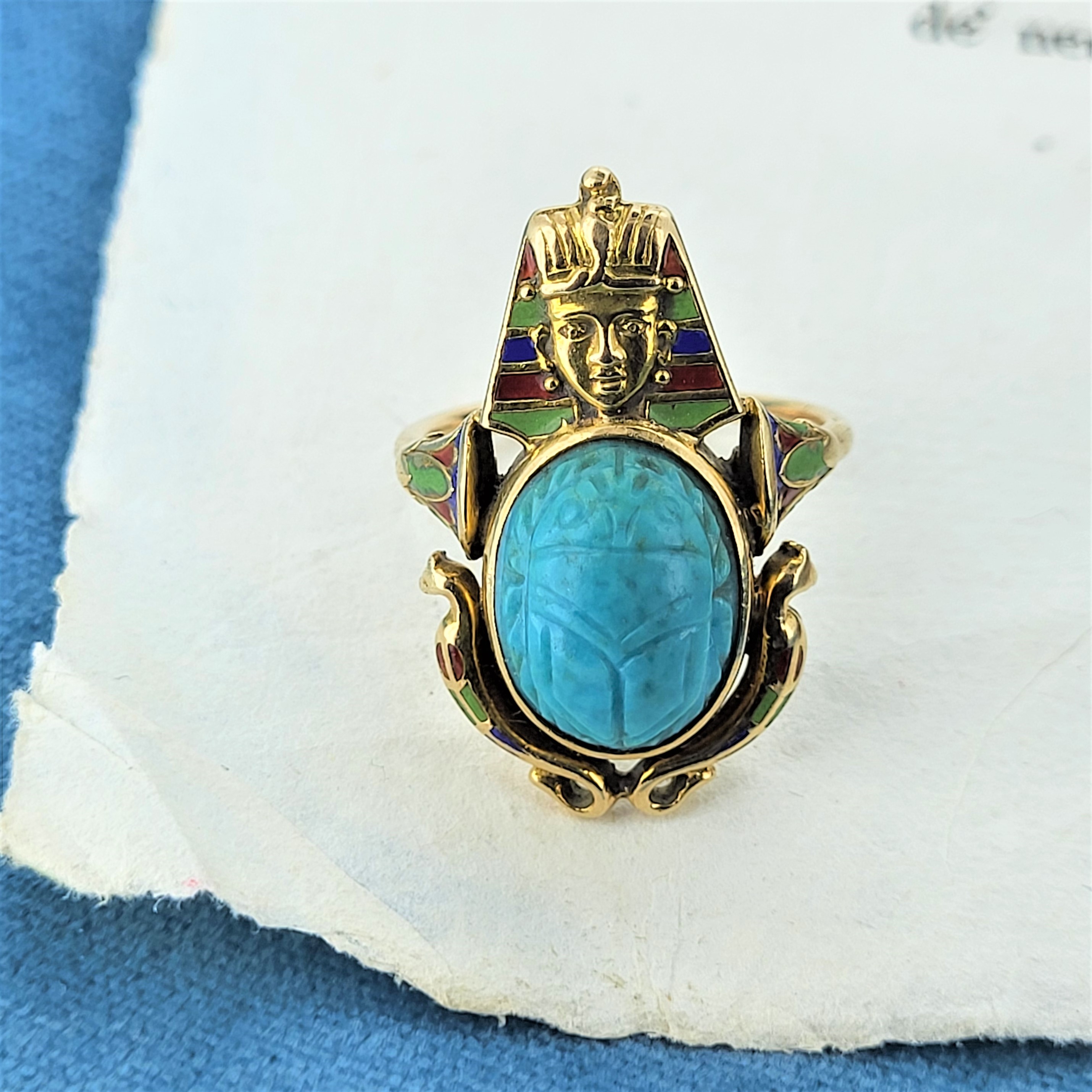 The Scarabs were usually carved from stone or Egyptian Faience and were used as an impression seal and were usually inscribed with designs or hieroglyphs. This ring features a lovely Turquoise Blue Scarab that measures 13mm by 9mm.