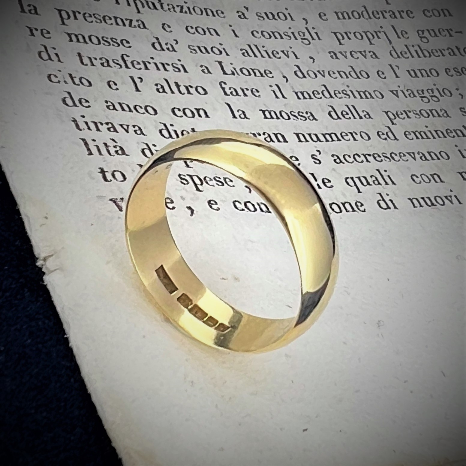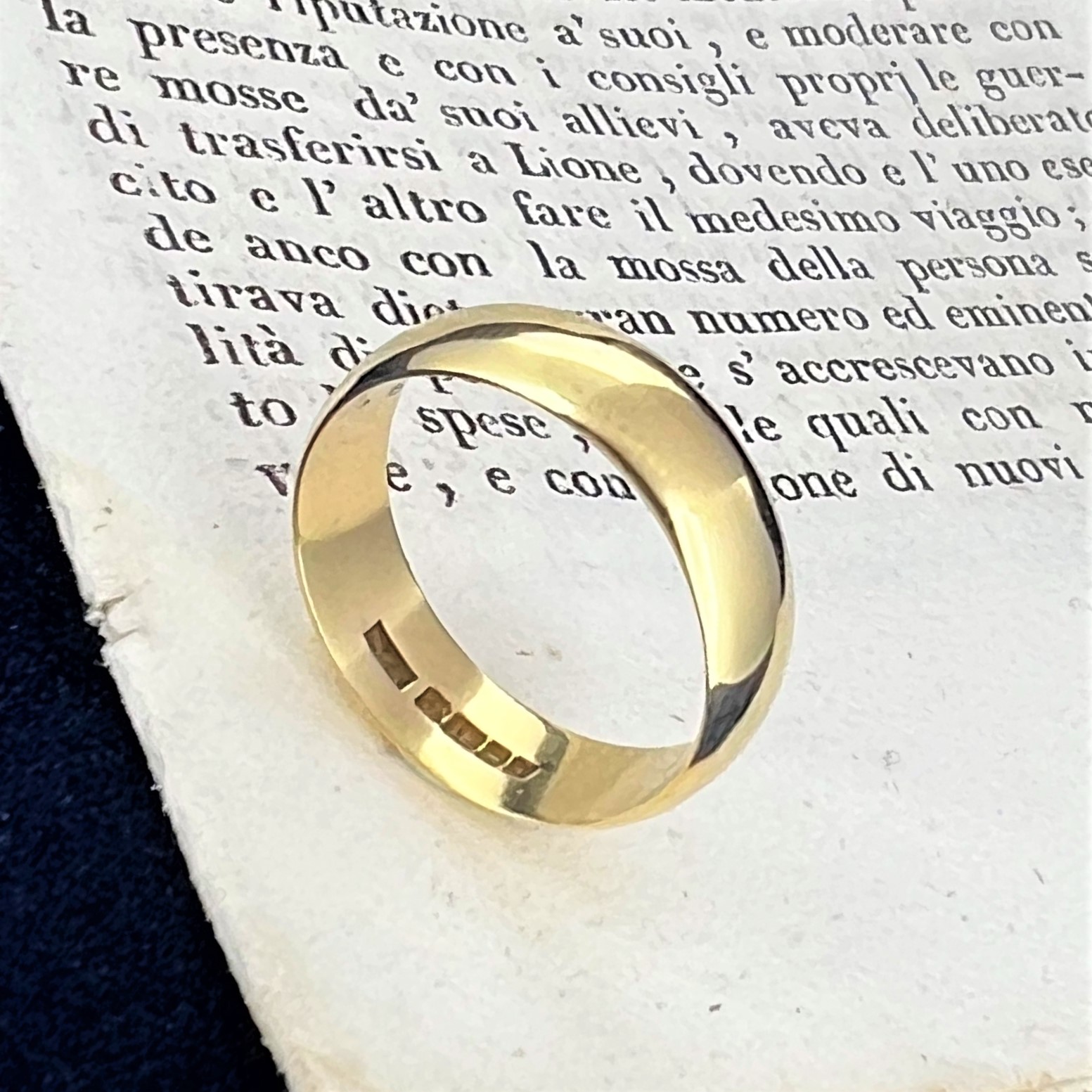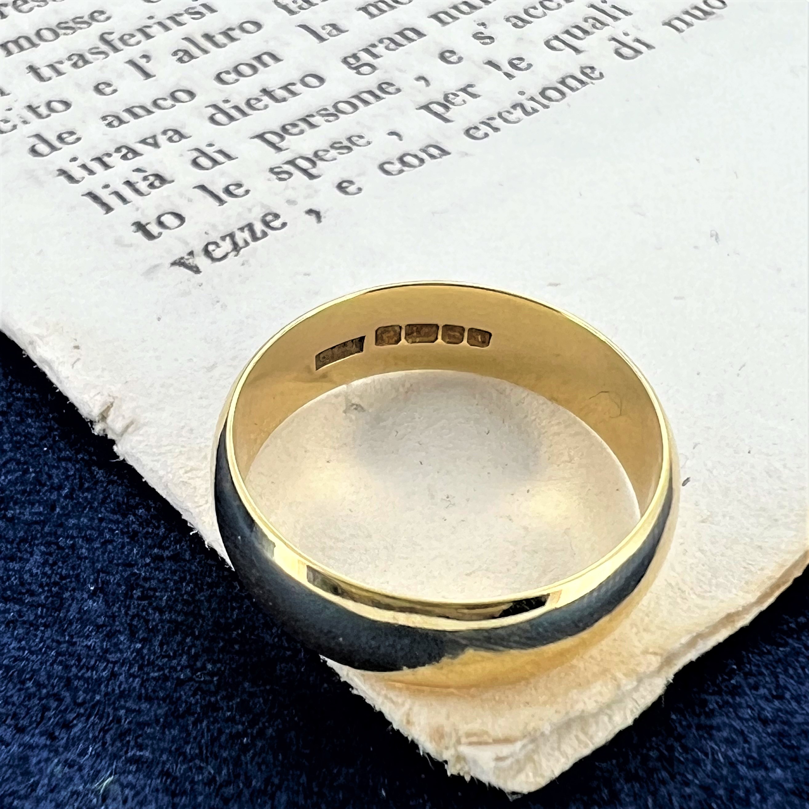 Does a 6mm wedding ring look too wide and a 5mm wedding ring look to narrow? This ring is an unusual width at 5.5mm and could be the the happy medium you've been looking for! The ring was hallmarked in Birmingham in 1971 by C.G.J. The D-Shape profile has a traditional look and feel and sits close to the finger. It weighs 4.5 grams, is currently a Size M and can be sized. It also has a polished finish.