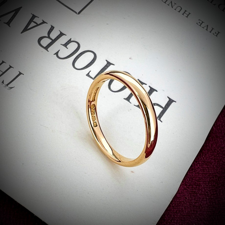 It is a court profile, meaning it is a traditional style of wedding ring featuring gentle curves on the inside and out. This makes this profile popular and most importantly very comfortable to wear. The ring is 2.5mm width making it the perfect width to accompany most engagement rings.