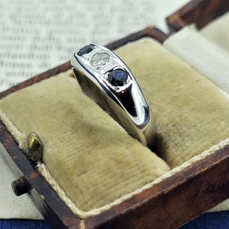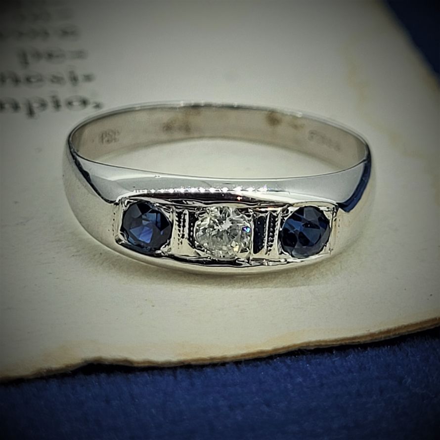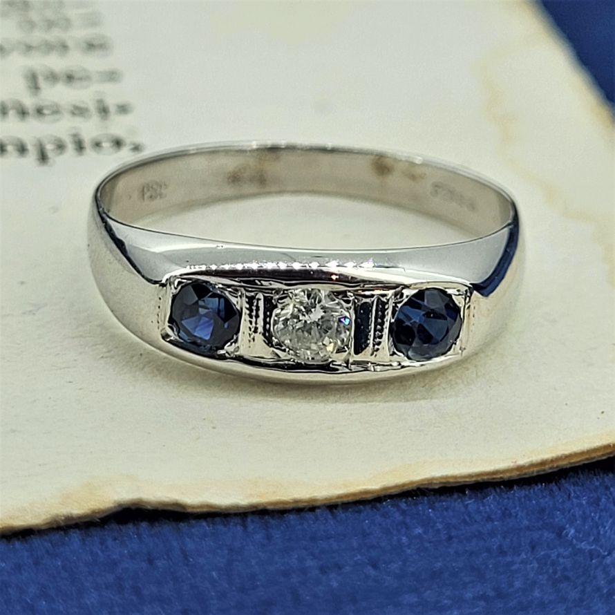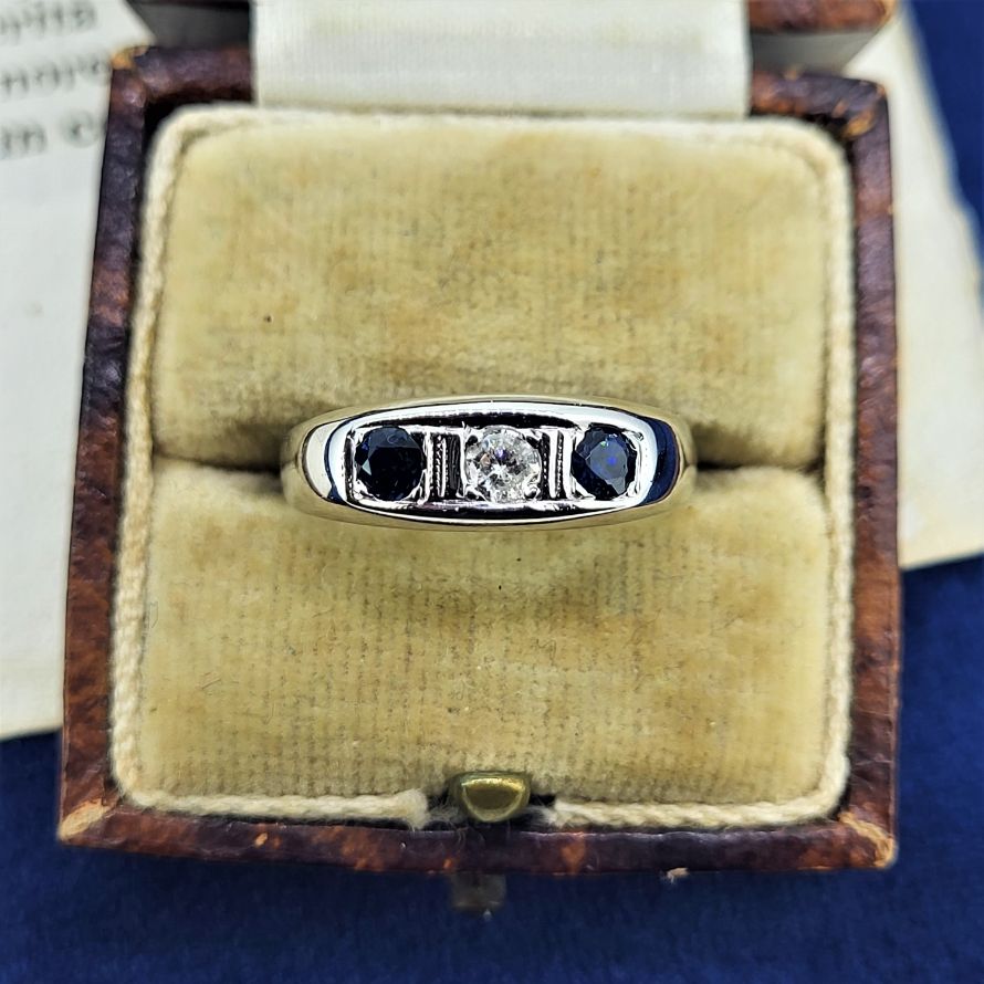 A beautiful Sapphire and Diamond Trilogy Ring which is hallmarked 18ct.The central diamond measures 3mm and weighs approximately 0.10ct. It is currently a Size N and can be sized to suit.