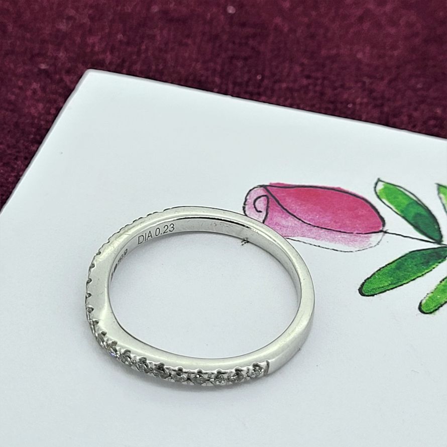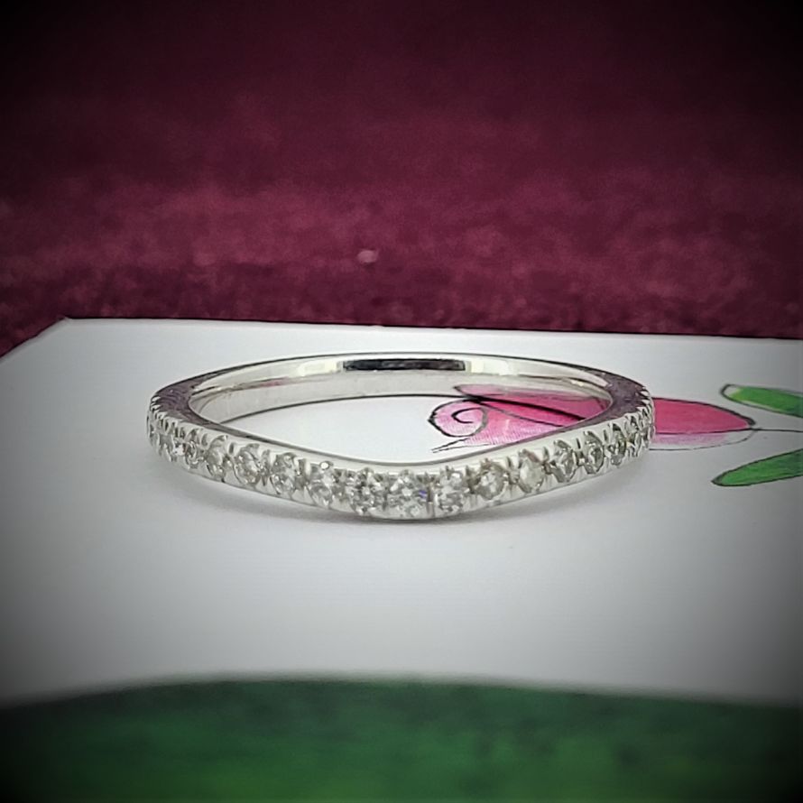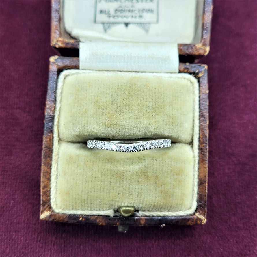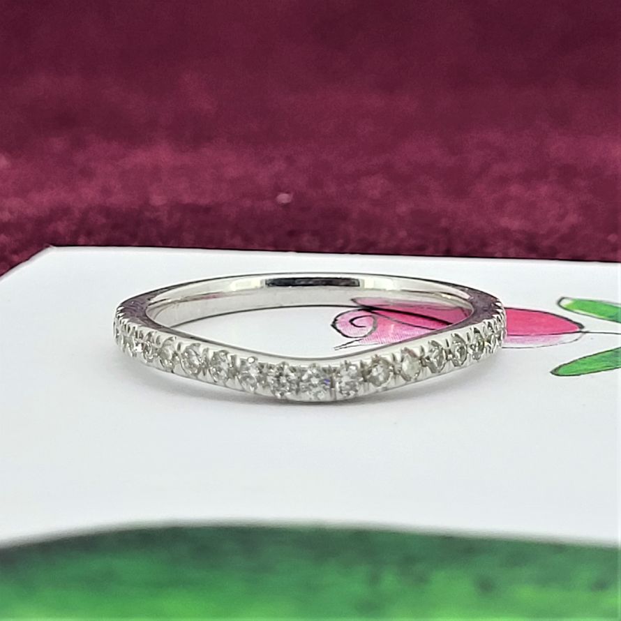 An elegant shaped claw set half eternity ring weighing 0.23cts. The ring has shaped to wrap around an engagement ring. It was hallmarked 18ct in London and weighs 2.5 grams. The ring measures at 1.8mm, is currently a Size K and can be sized a small amount.