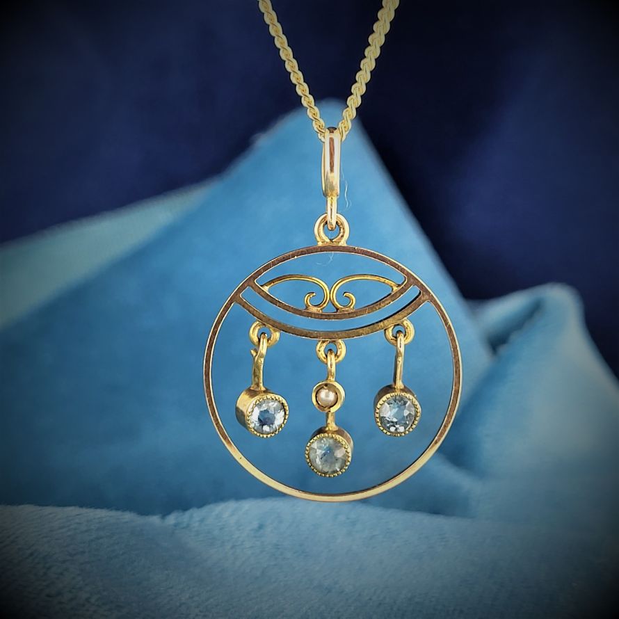 A 9ct gold round pendant, measuring 20mm by 20mm with three aquamarine drops suspended on gold bars, the central also featuring a seed pearl.
