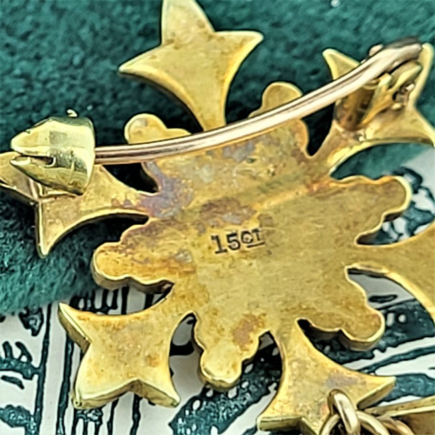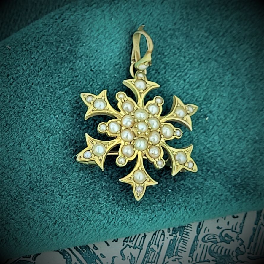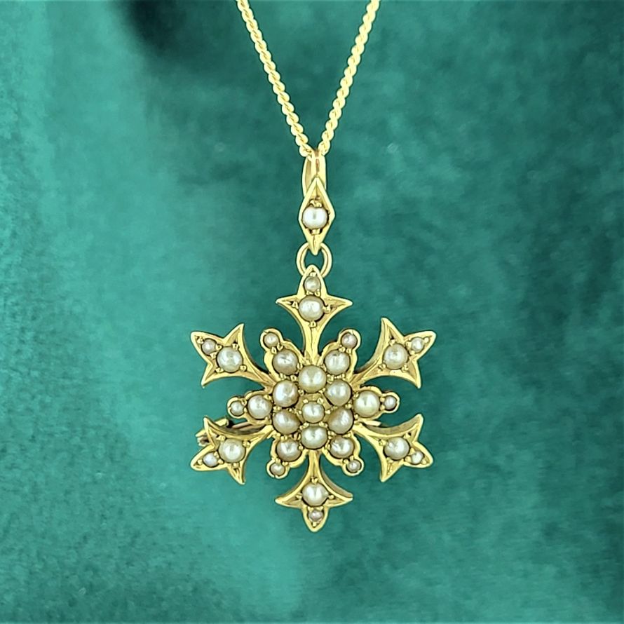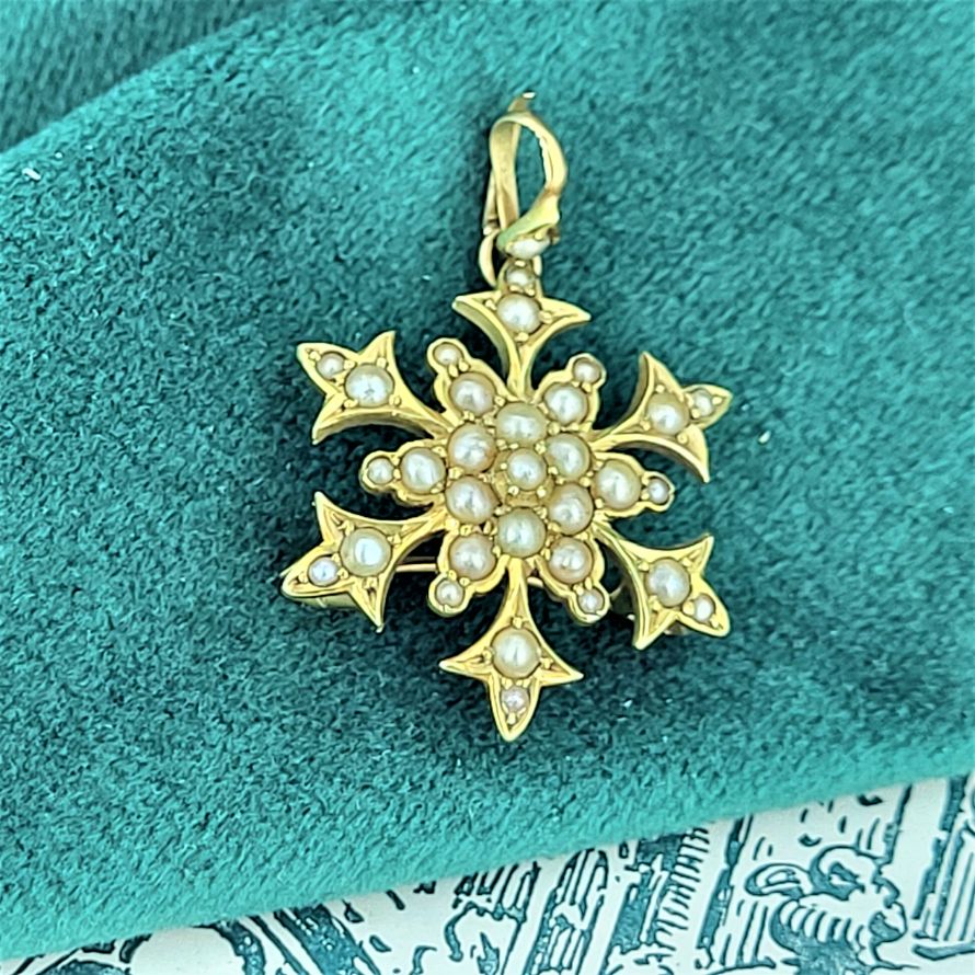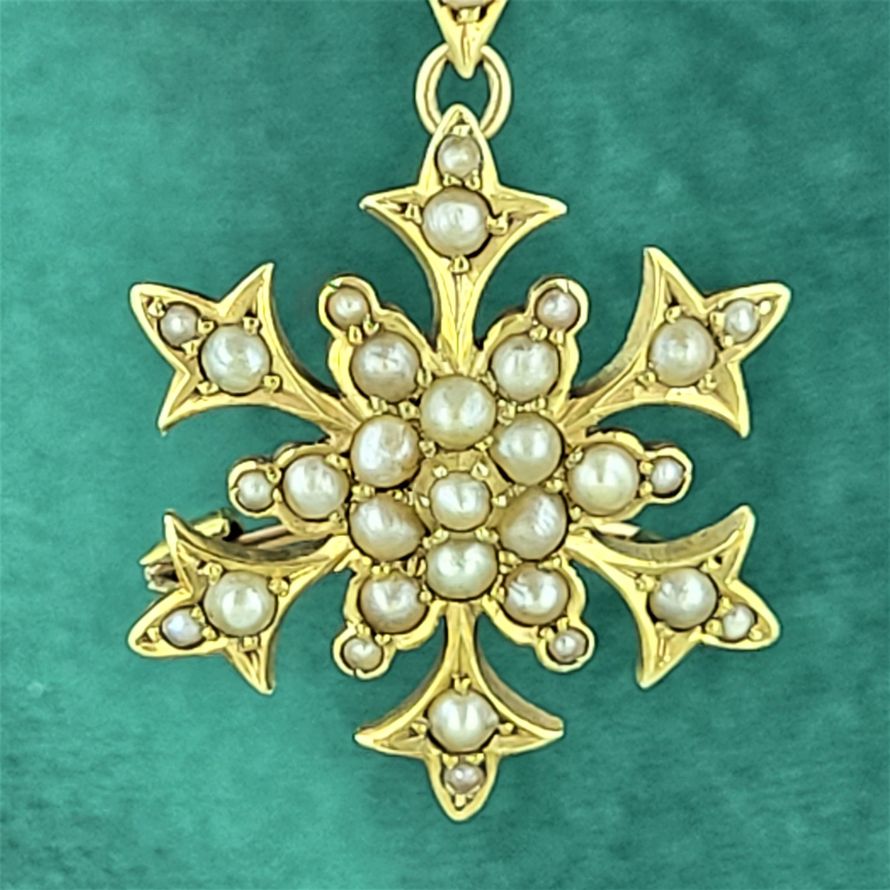 This beautiful Victorian Seed Pearl Brooch is crafted from 15ct Gold. The design is typical of the Victorian era with all pearls fully in tact. The brooch is stamped 15ct, measures 25mm by 25mm and weighs 4.2 grams.