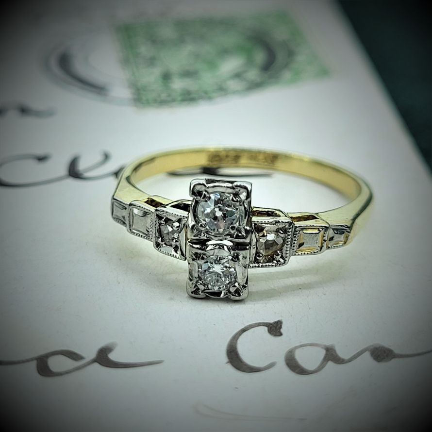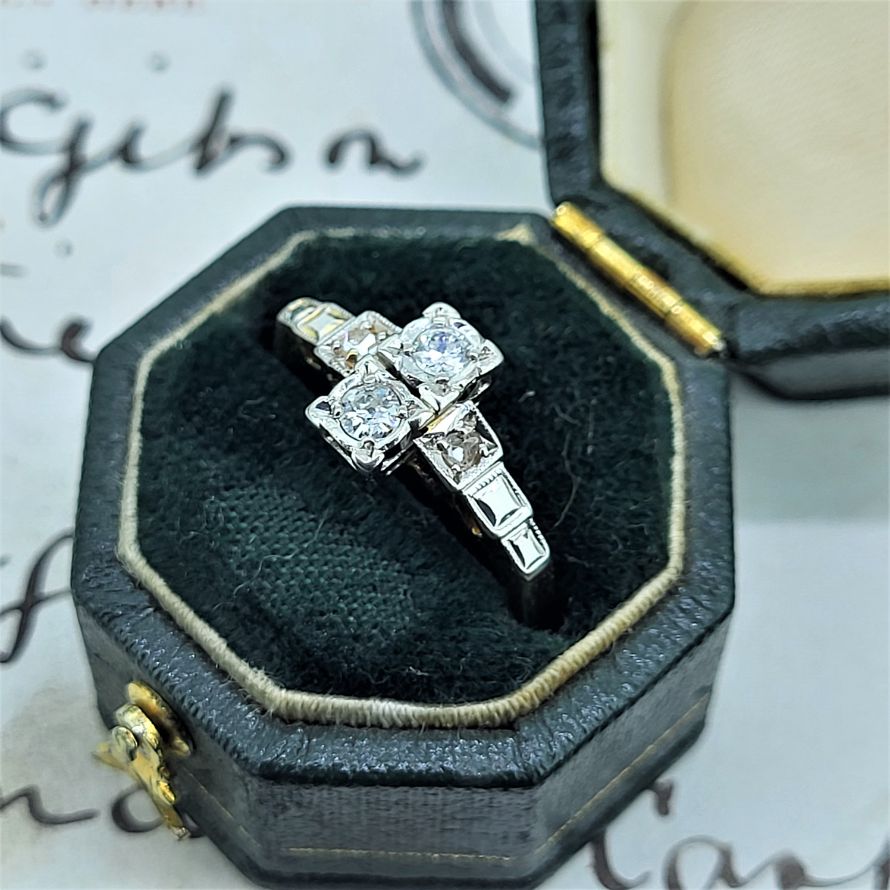 A beautiful Art Deco style Diamond Ring set with Round Brilliant Diamonds weighing approximately 0.15cts. The ring is not hallmarked but is stamped 18ct and Platinum.