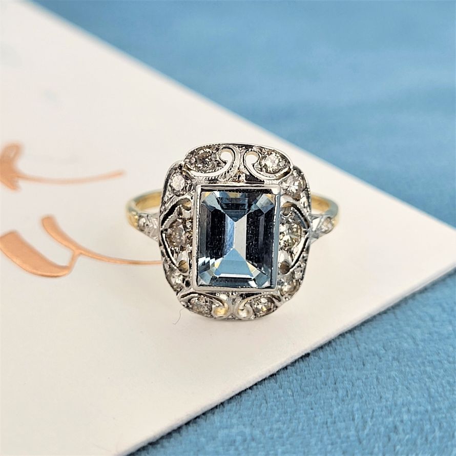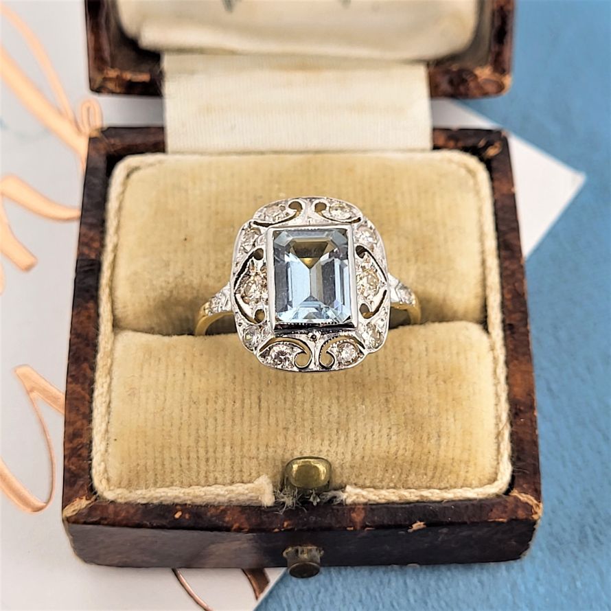 A total of 0.50ct of round brilliant cut diamonds are set amongst fabulous 18ct white gold swirl patterns surrounding the aquamarine. Each side of the shank has a single round brilliant cut diamond.