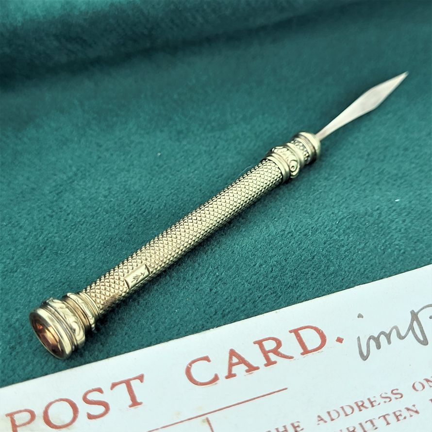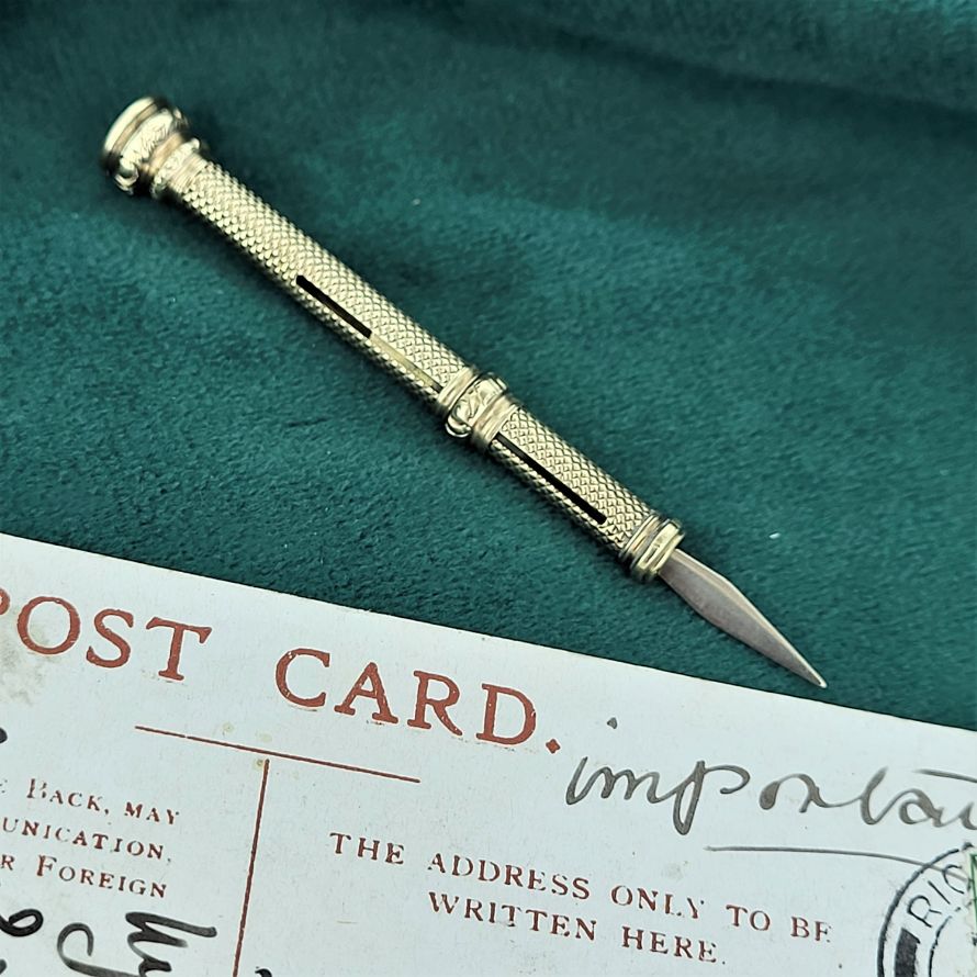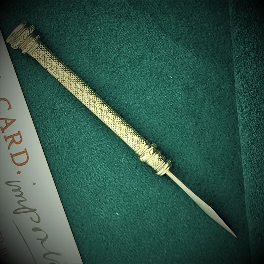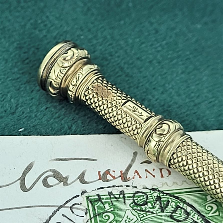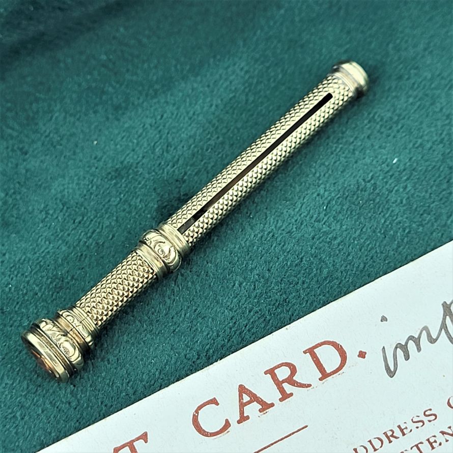 Engine turned engraving adds wonderful detail to the toothpick with a perfectly functioning push mechanism. It extends from 56mm to 83mm and tests as 9ct gold (you can see a slight mark from where this item has been acid tested in the past).