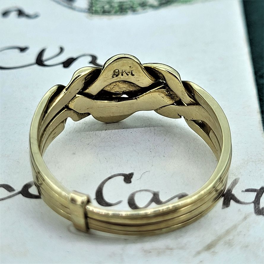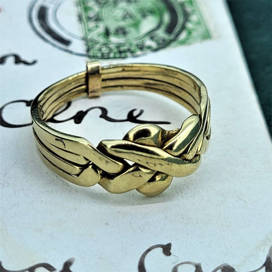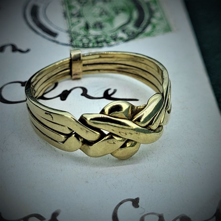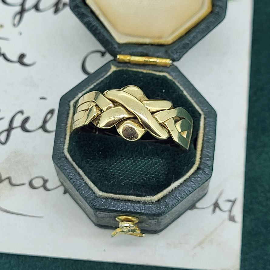 A 9ct Gold Puzzle Ring is crafted using four bands, two pairs each interlinking with its neighbours with a knotted twist at the front.