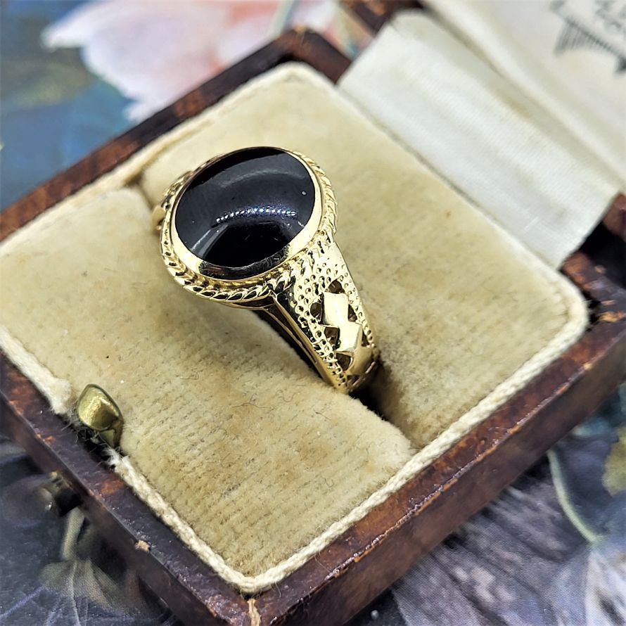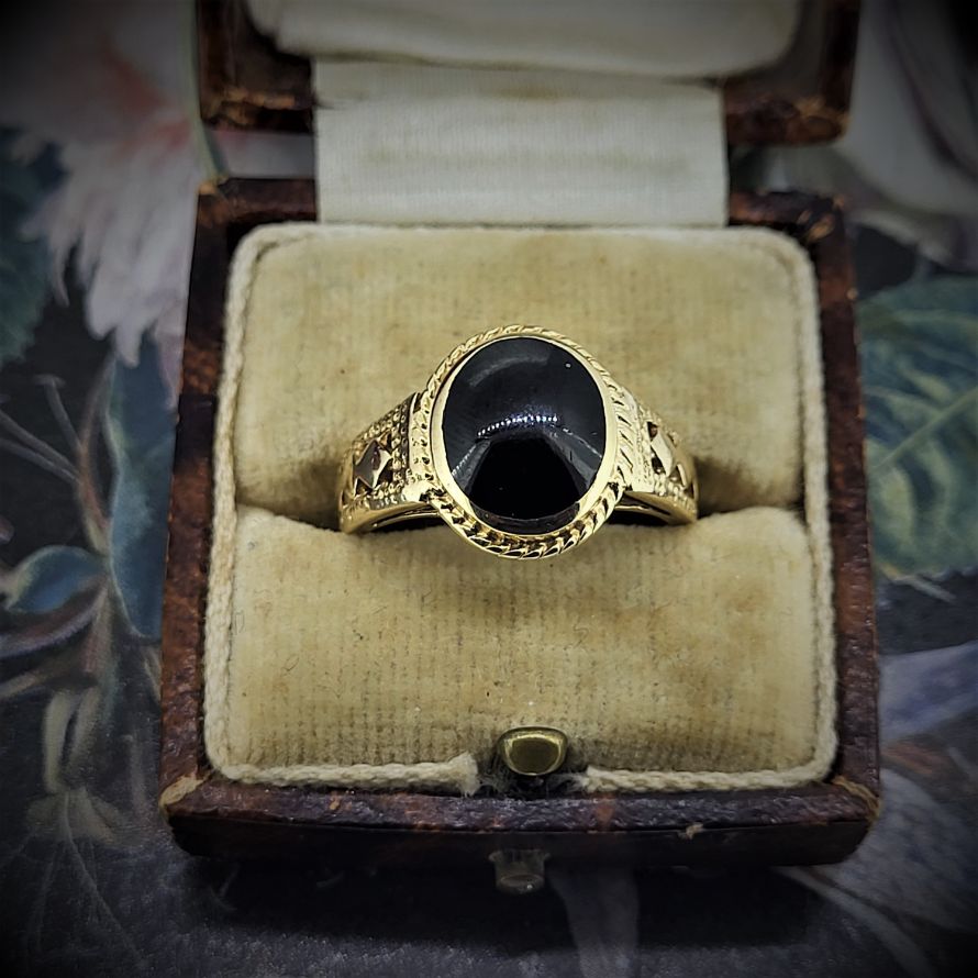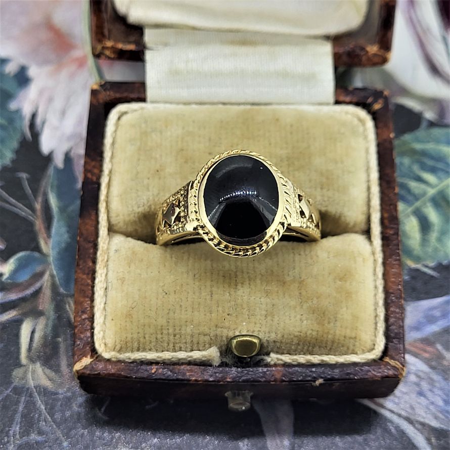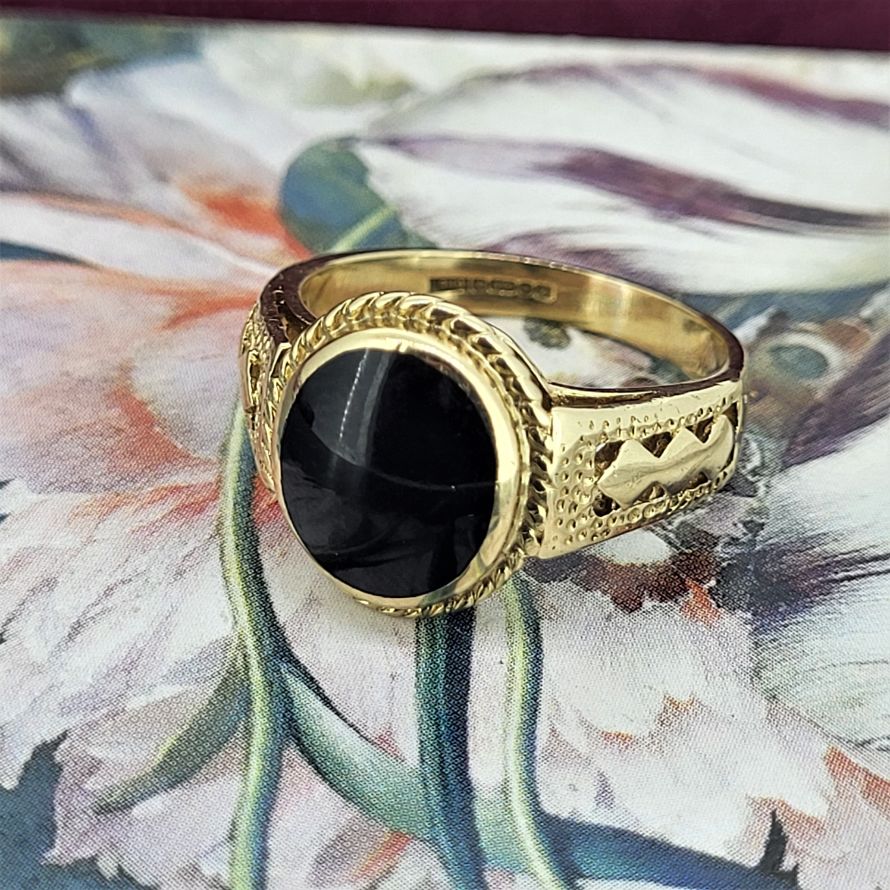 This is a lovely Onyx Ring with detailed shoulders. The ring is crafted from 9ct and is hallmarked.