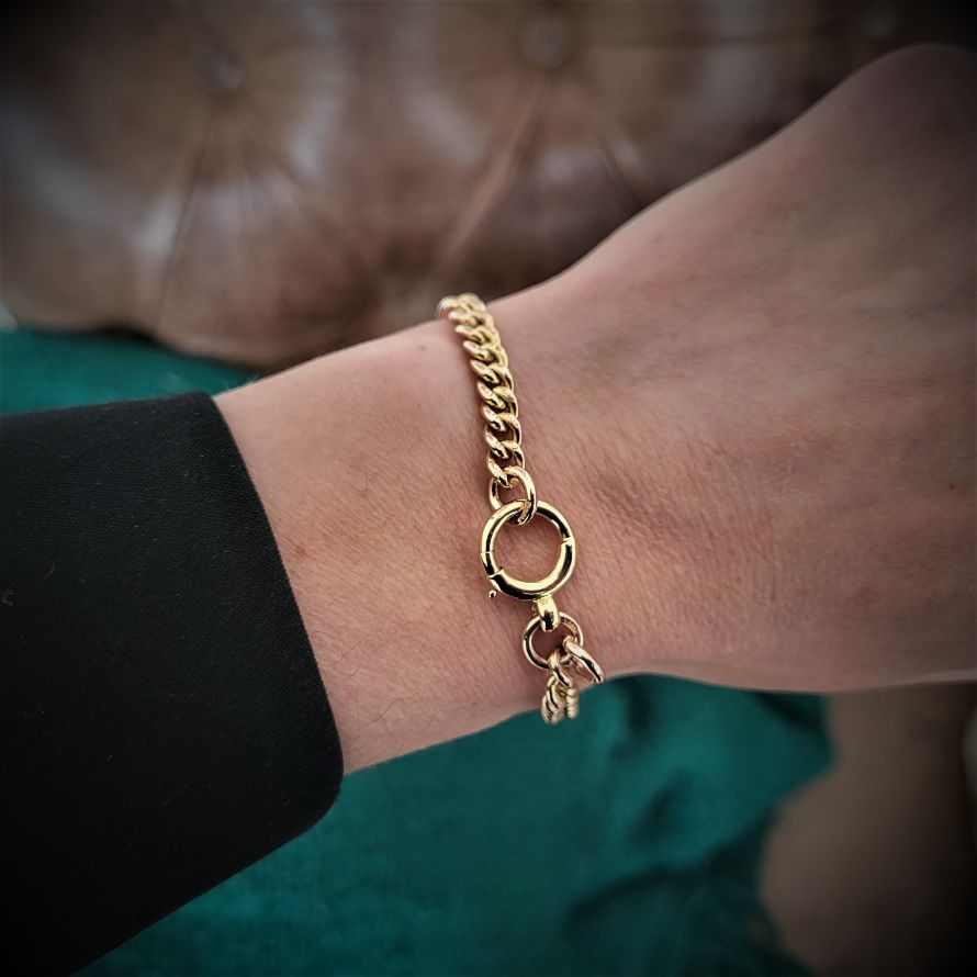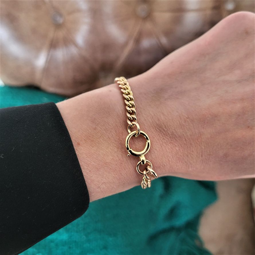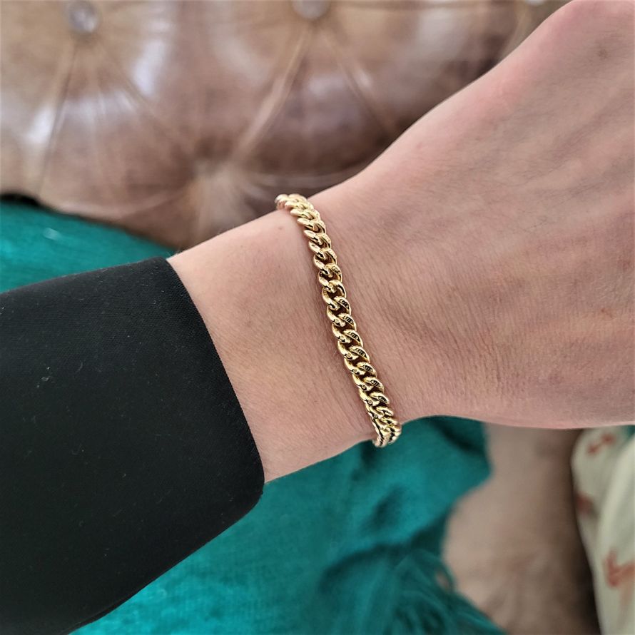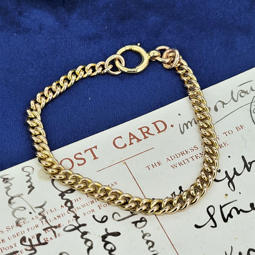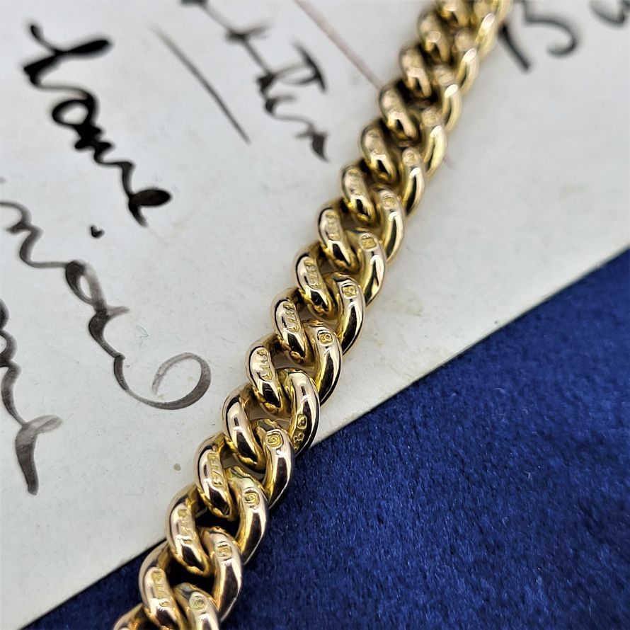 Each link has a 5.5mm diameter and the bracelet will fit a 17cm wrist. It weighs 18grams and is stamped 9ct in all of the right places. The bolt ring has a 12mm diameter. Dates back to the early 1900s.