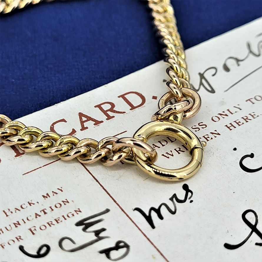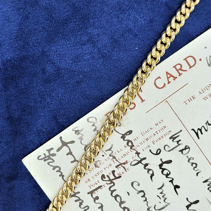 This one ticks all the boxes. Stamped on every link. Solid. Giant bolt ring clasp. Additional bolt ring to hang charms, watches, a toothpick even! Could be worn as was originally intended (in the waistcoat) or as more commonly seen today, as a bracelet.