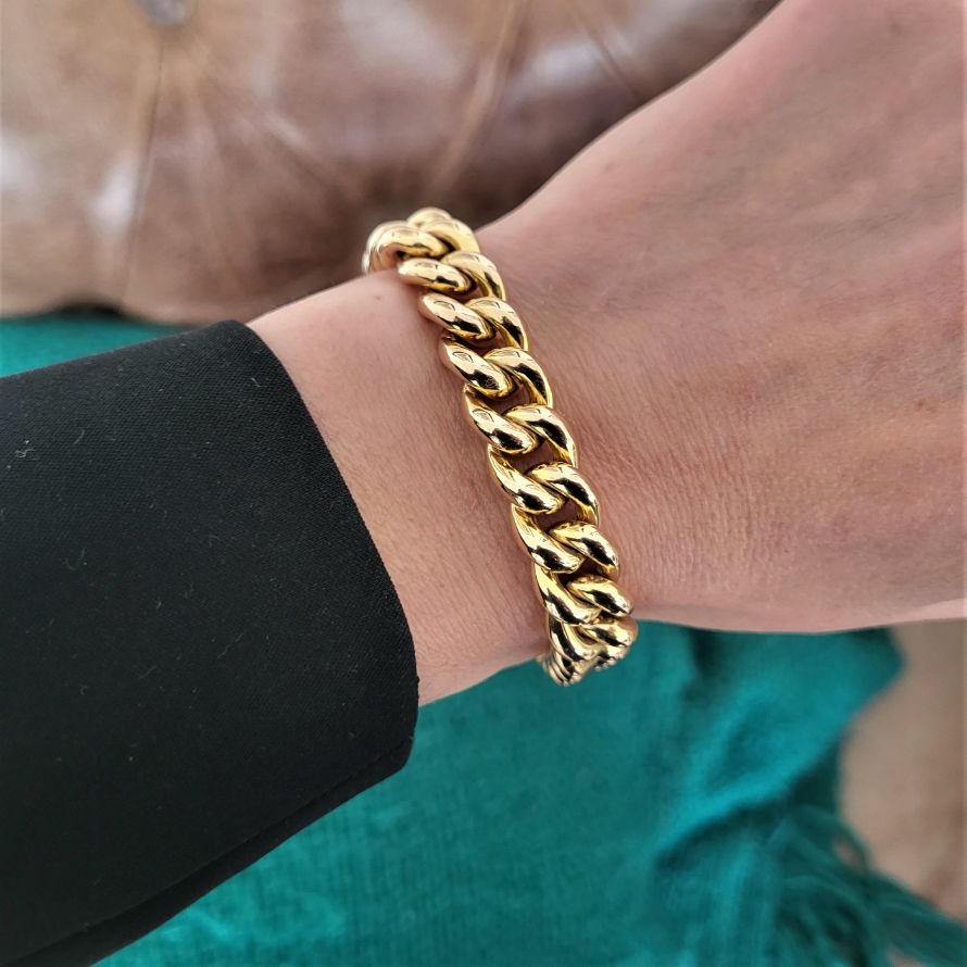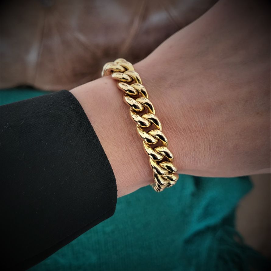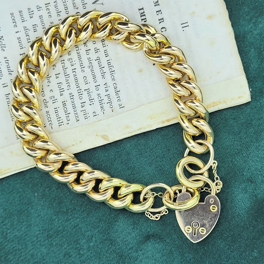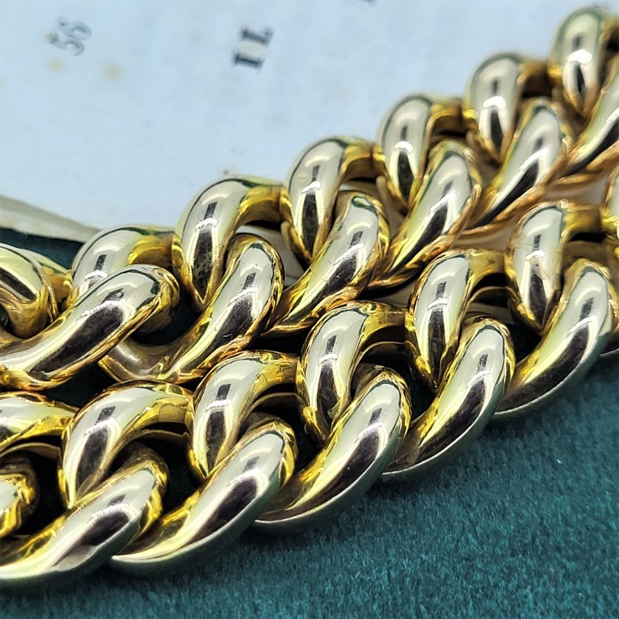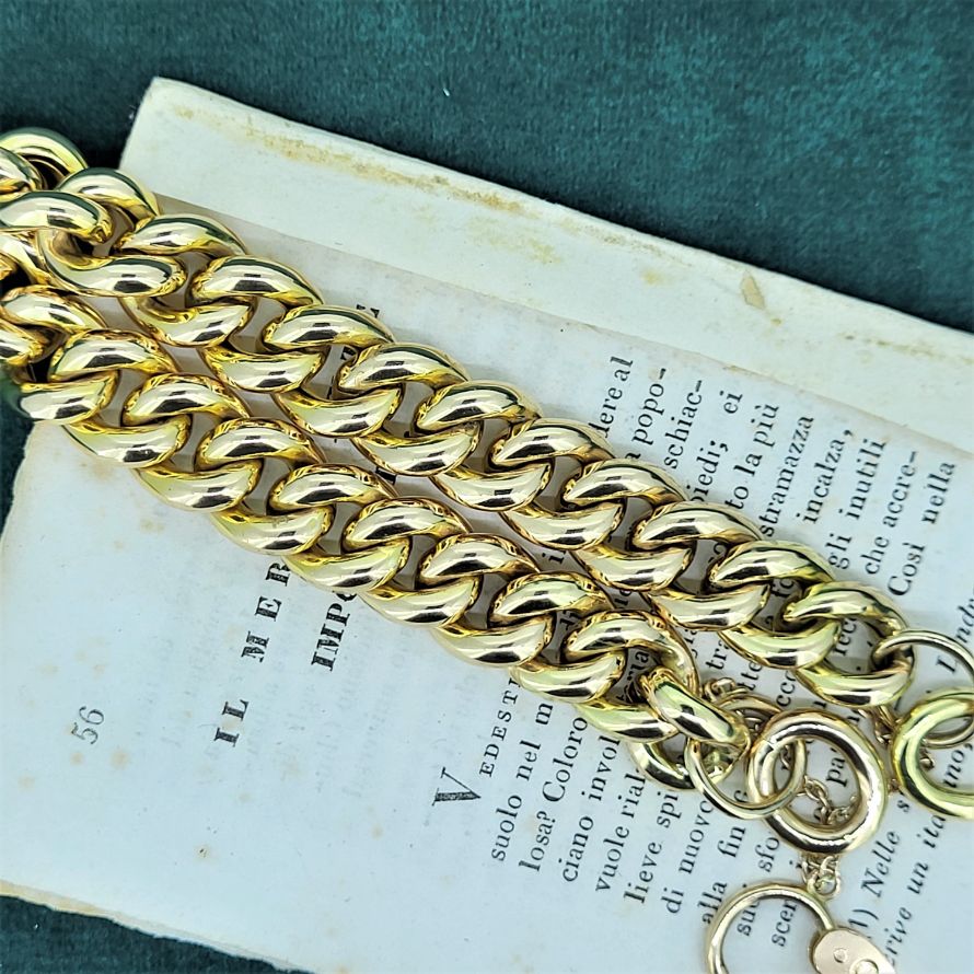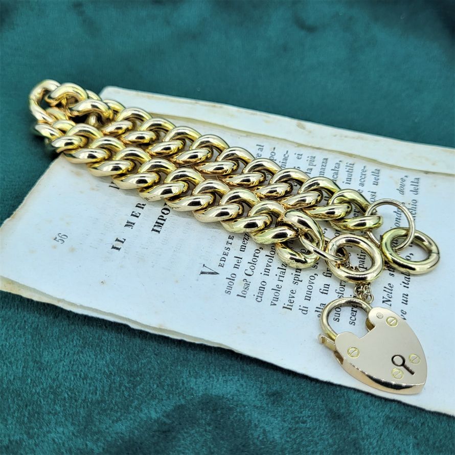 Rich yellow patina, fabulous 17mm padlock, safety clasp, 11mm links, 33.5 grams. The perfect dimensions.