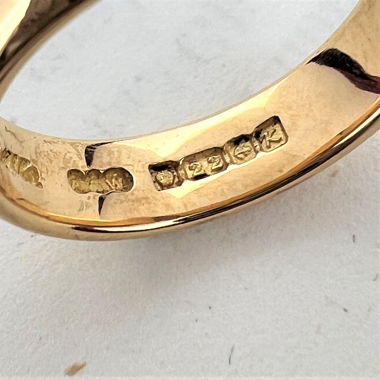 The ring has been polished and was hallmarked in Birmingham in 1984 by A & W which we unfortunately can't find any further information on. The ring is 5mm in width and weighs 7.1 grams. It is currently a Size M and can be sized.