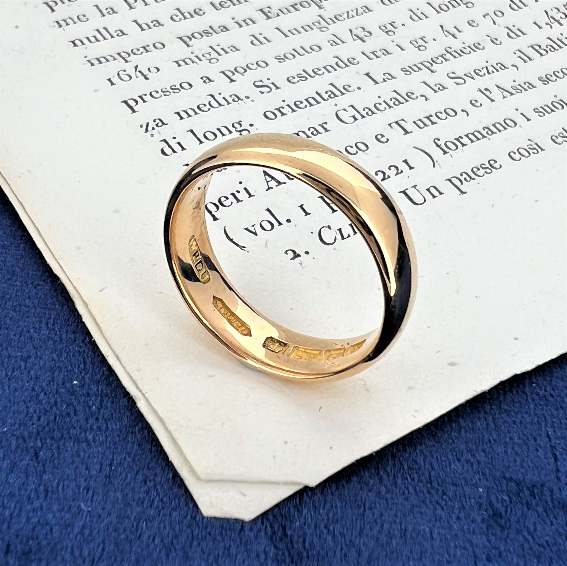 It is domed on the inside and the outside making this ring a Court profile and the smoothness makes it a joy to wear. The ring weighs 8.6 grams, is currently a Size Q and can be sized.All photography is done in-house. These images are not enhanced or airbrushed — what you see is exactly the item you will receive.