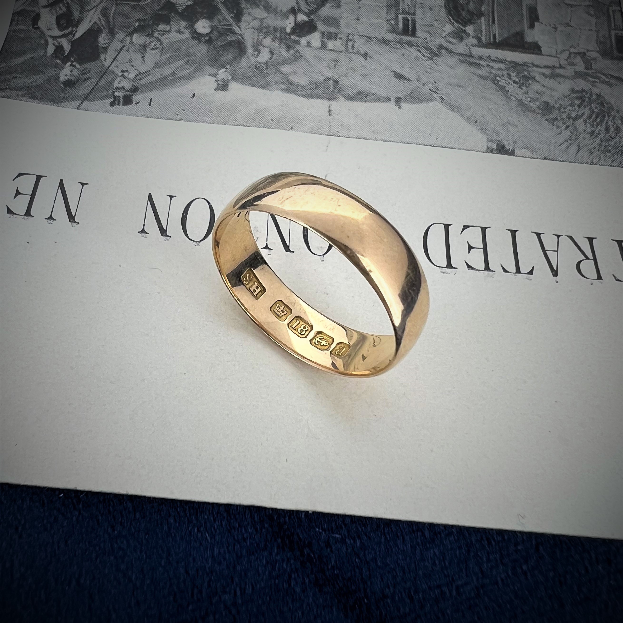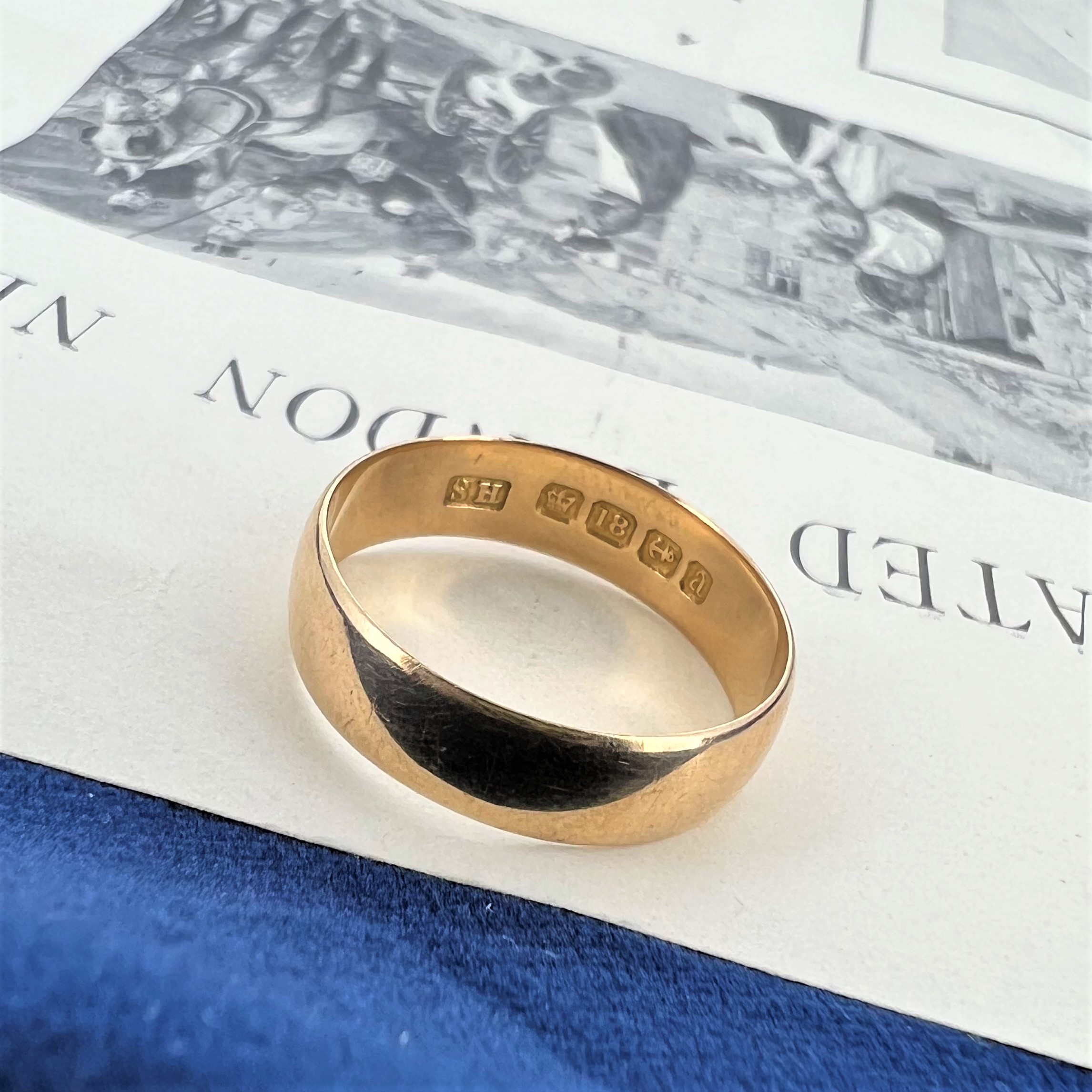 A wonderful 5mm Wedding Ring crafted from 18ct Gold. The ring was hallmarked in Birmingham in 1900 by S.H for Samuel Hope who had premises on Vyse Street in Birmingham's Jewellery Quarter. The ring is an Ultra Light D-Shape profile meaning it sits flush to the finger and is pleasant to wear.