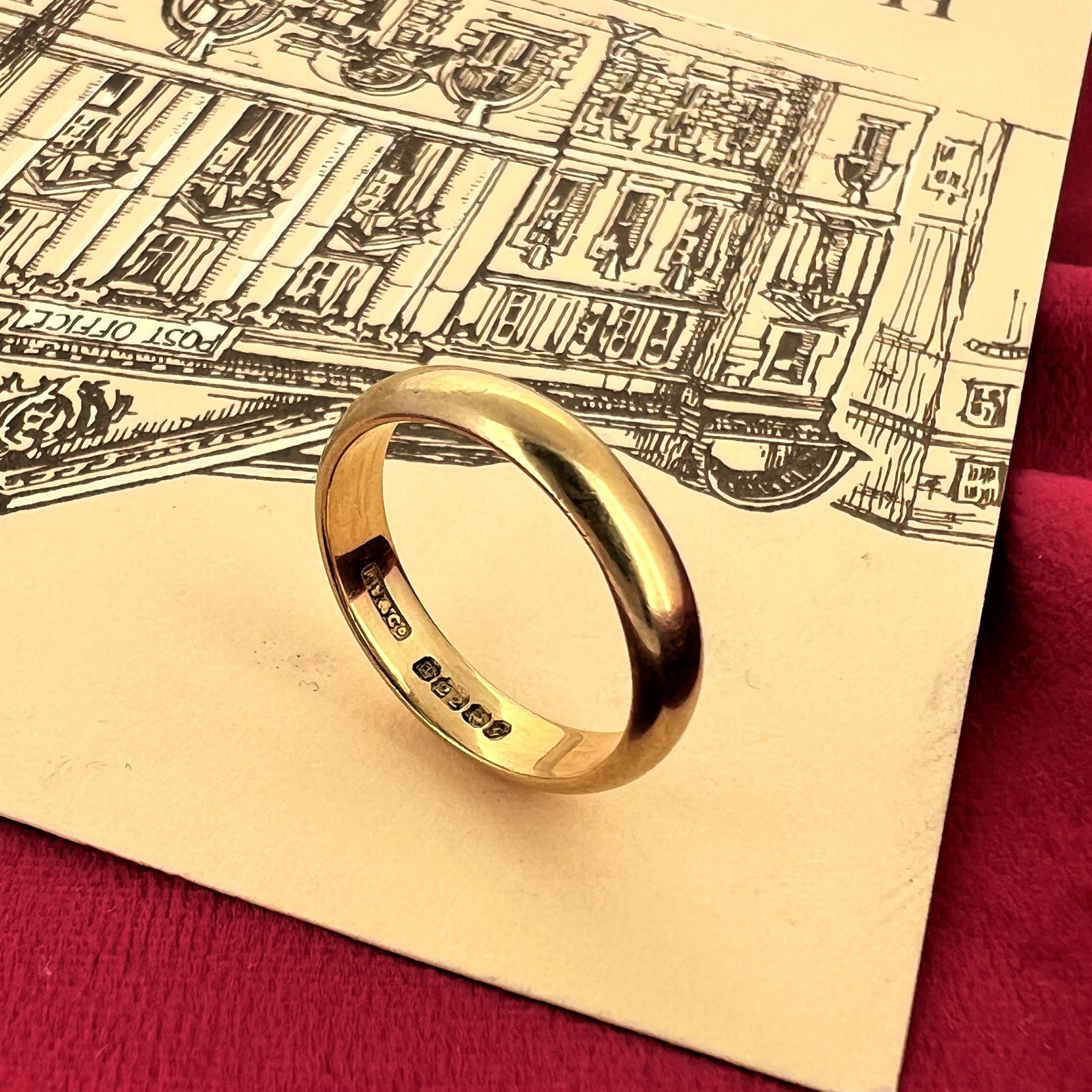 The ring looks traditional with its domed profile and weighs 5.5 grams. It is a Size N and can be sized to fit.