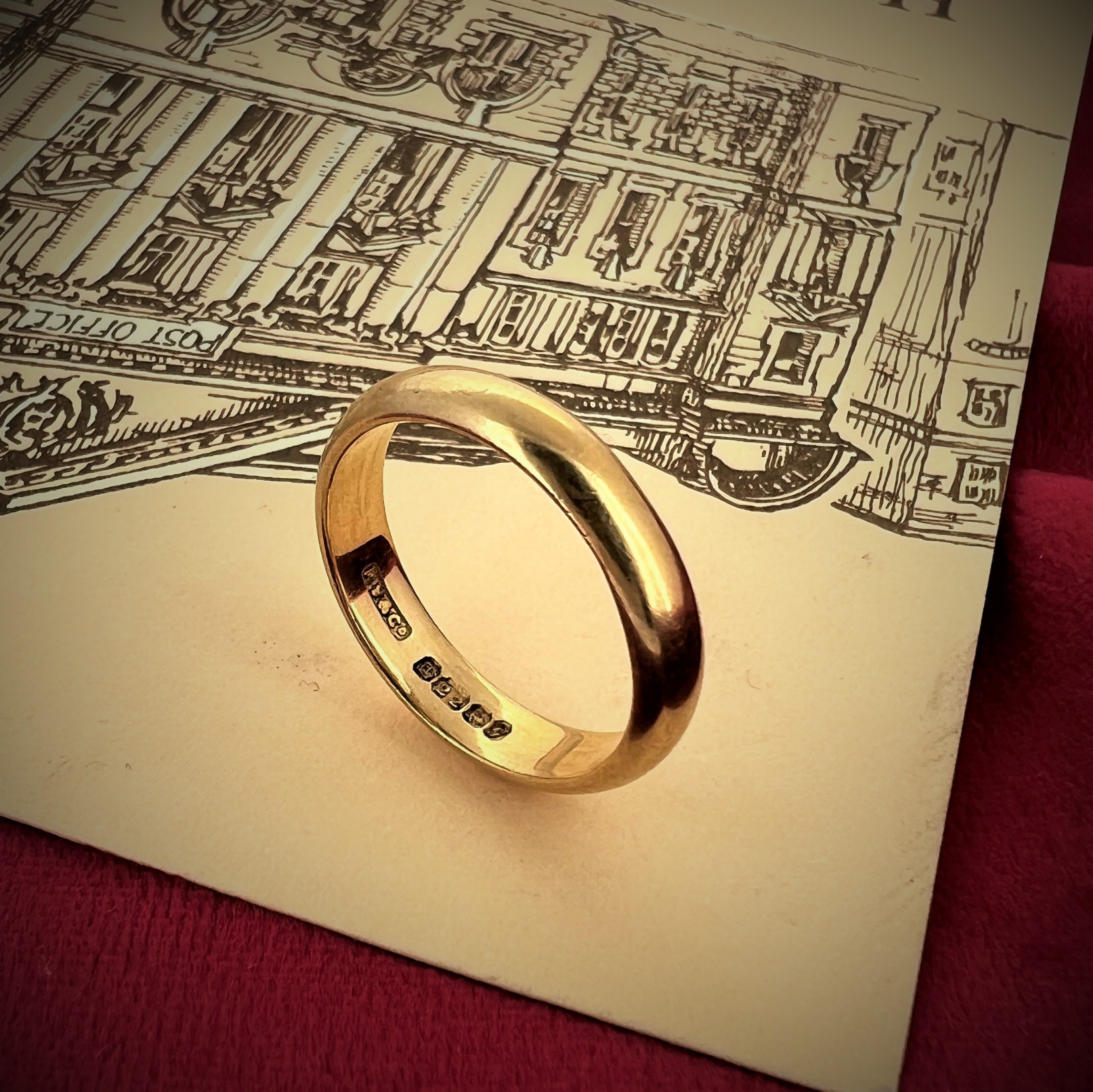 This 4mm Medium Weight D-Shape is crafted from 22ct Gold and was hallmarked in Birmingham in 1981 by R V & Co which we unfortunately can't find any further information on.