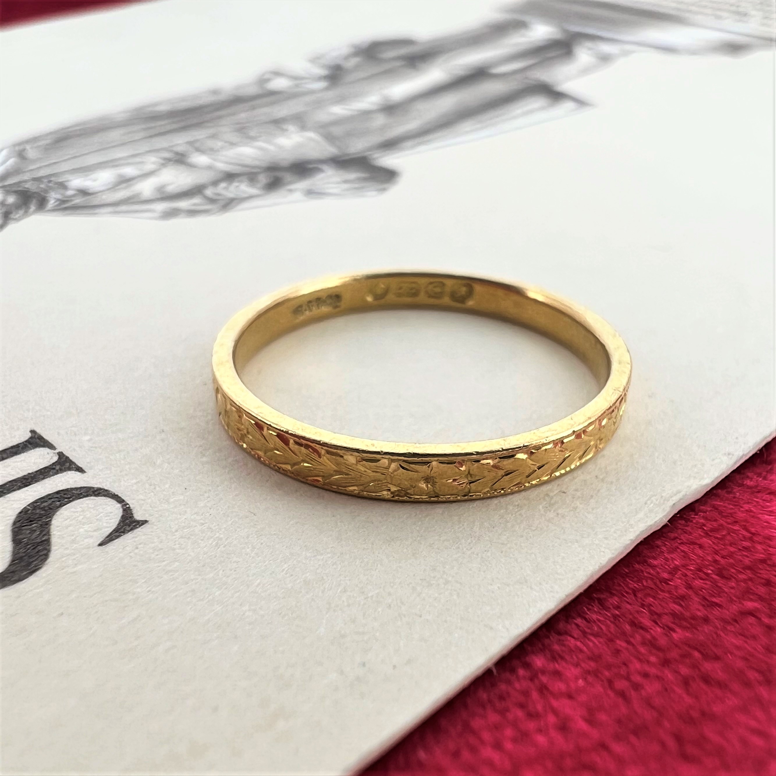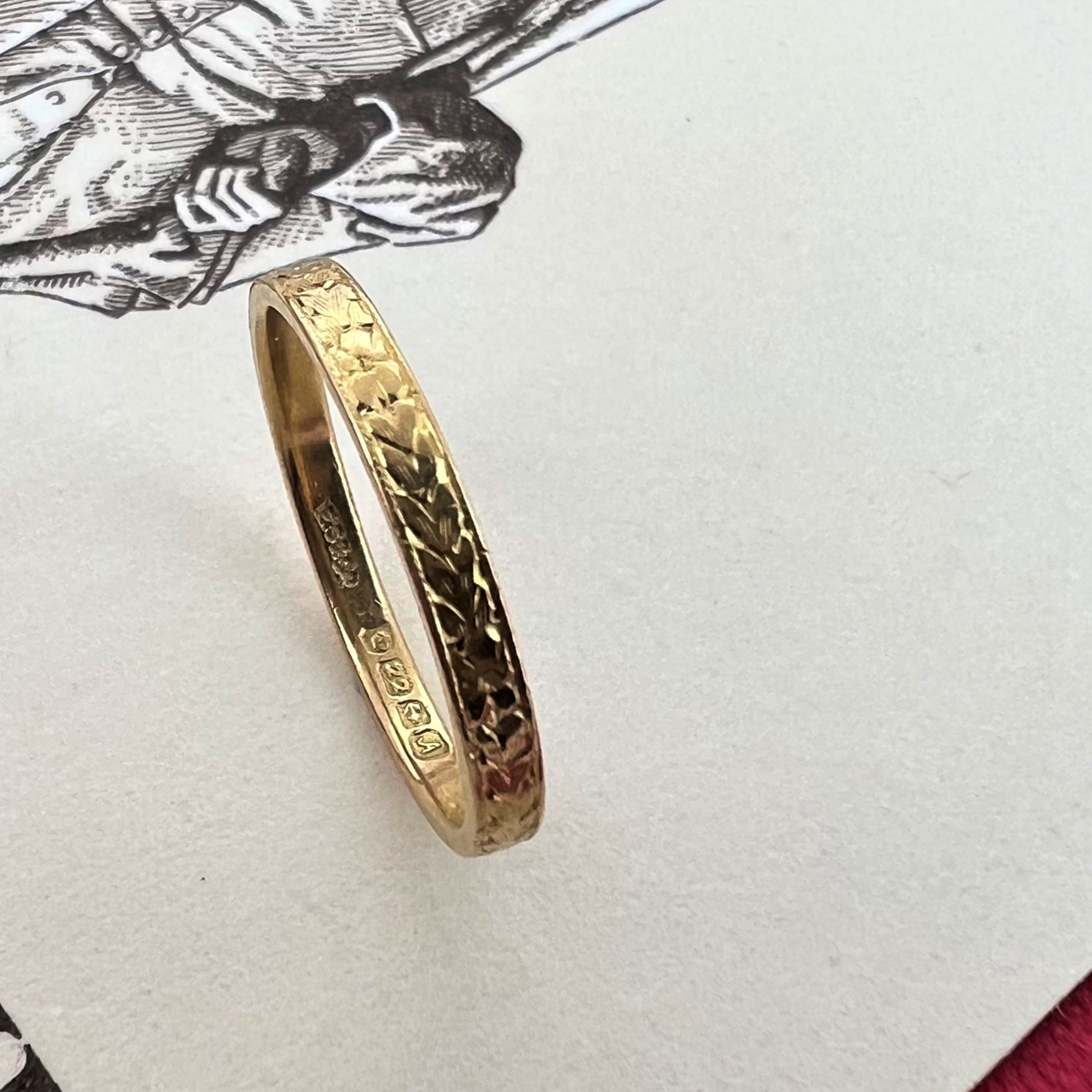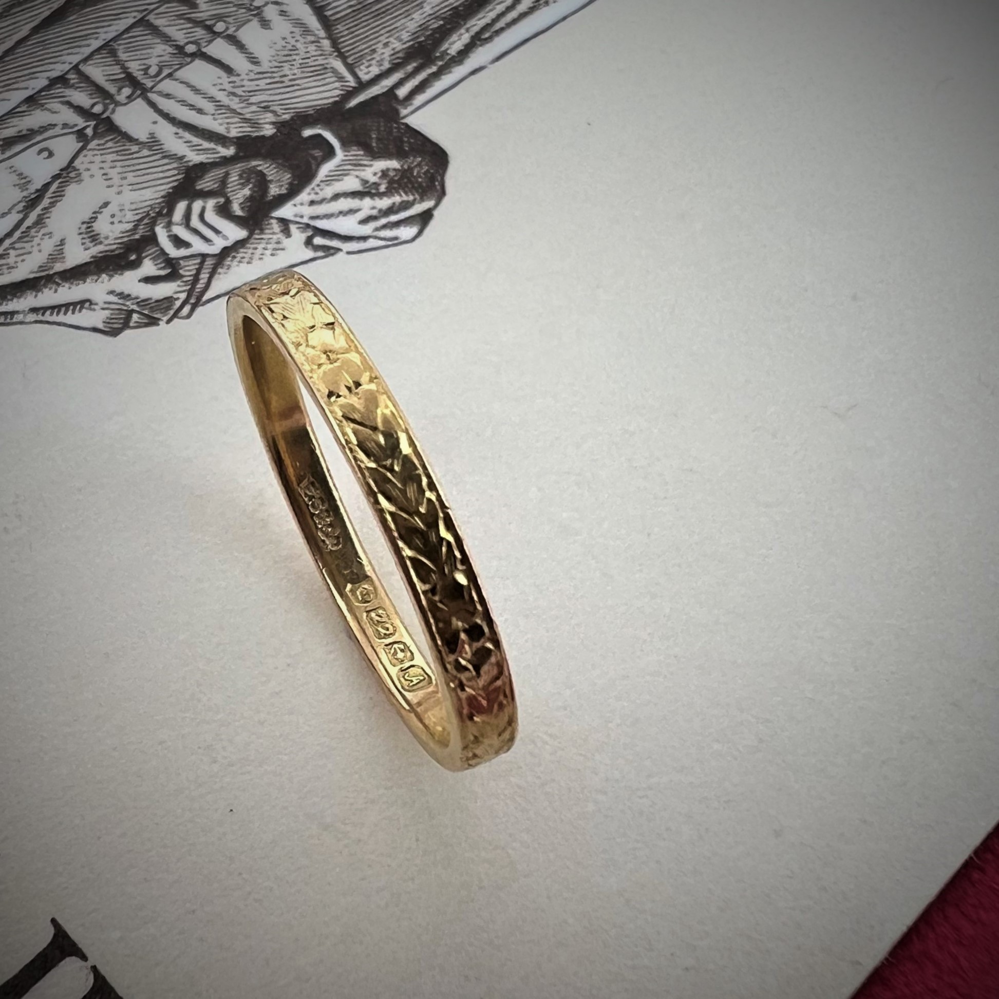 The ring was hallmarked in Birmingham back in 1951 (the year that Lisa's Dad was born) by E S & Co for E Scott and Co of Northampton Street (where Sharna's Dad had his first ever shop).The ring weighs 2.2 grams, is currently a Size M 1/2 and couldn't have been sized due to its pattern - so thank goodness it fits! Well, I could have pushed it up or down a little teeny bit.