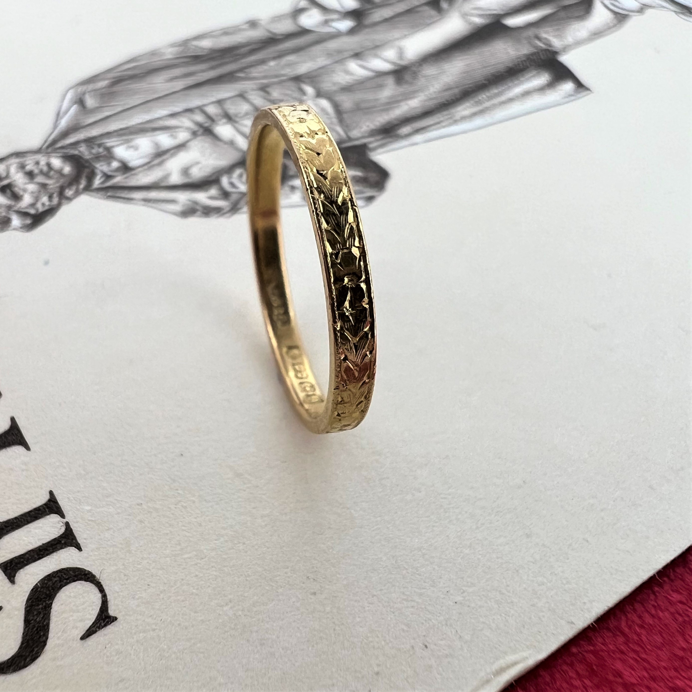 A delicate 2mm Flat Court Wedding Ring patterned with little hearts around the outside of the band and destined for one of the worlds most special humans - Lisa.