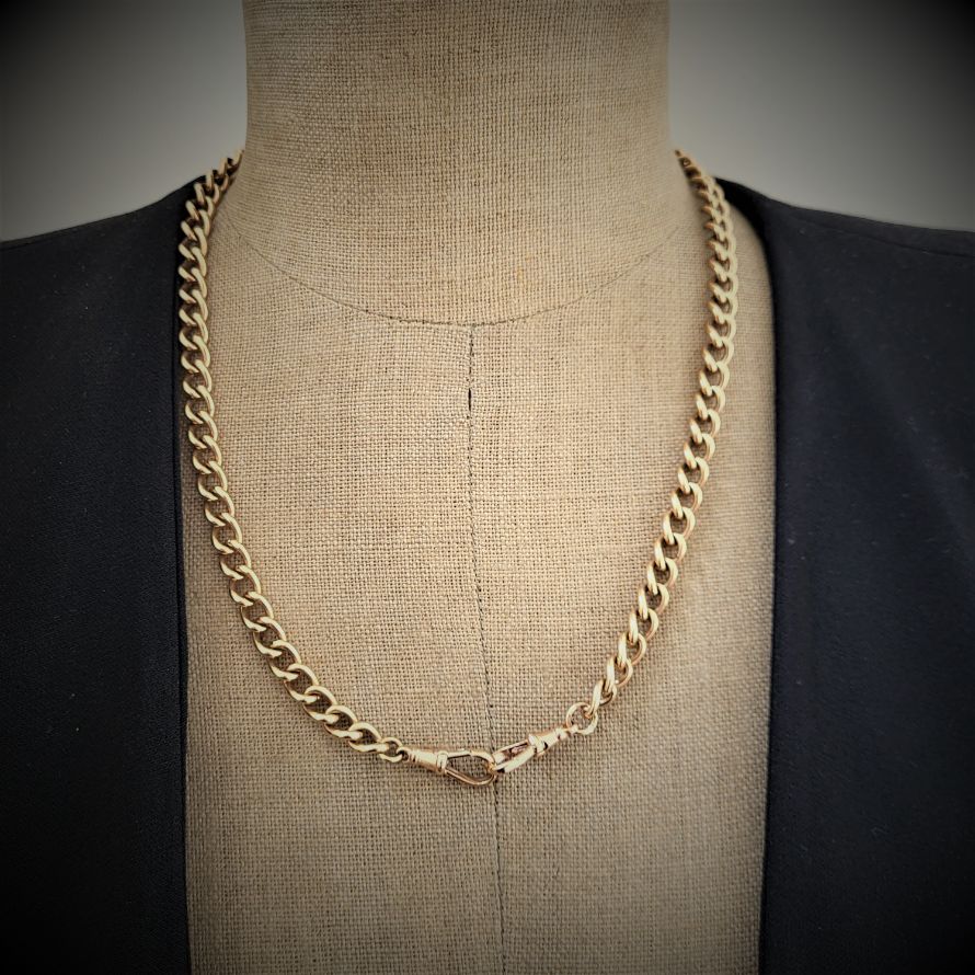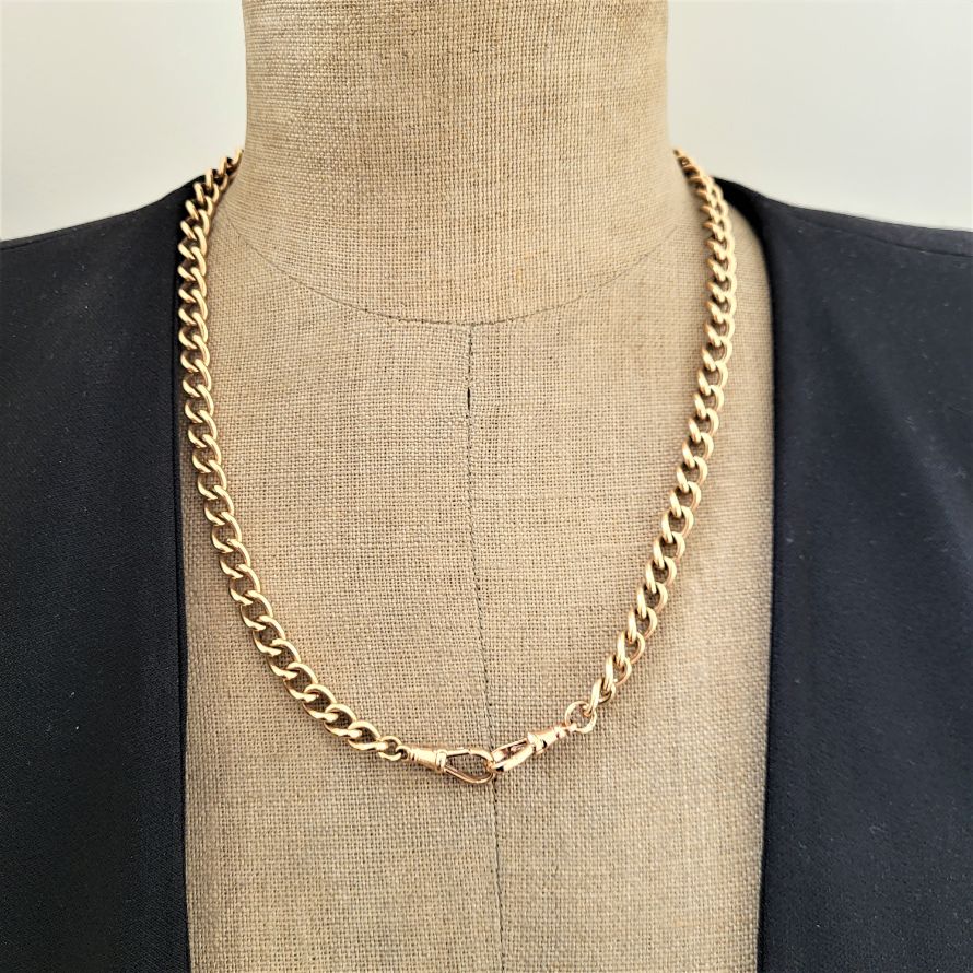 This 9ct rose gold albert chain measures 20 inches in length and weighs 56.9 grams. The two rose gold swivels are both stamped and can be worn at the front or the back. Each of the rounded curb links measures 7mm.