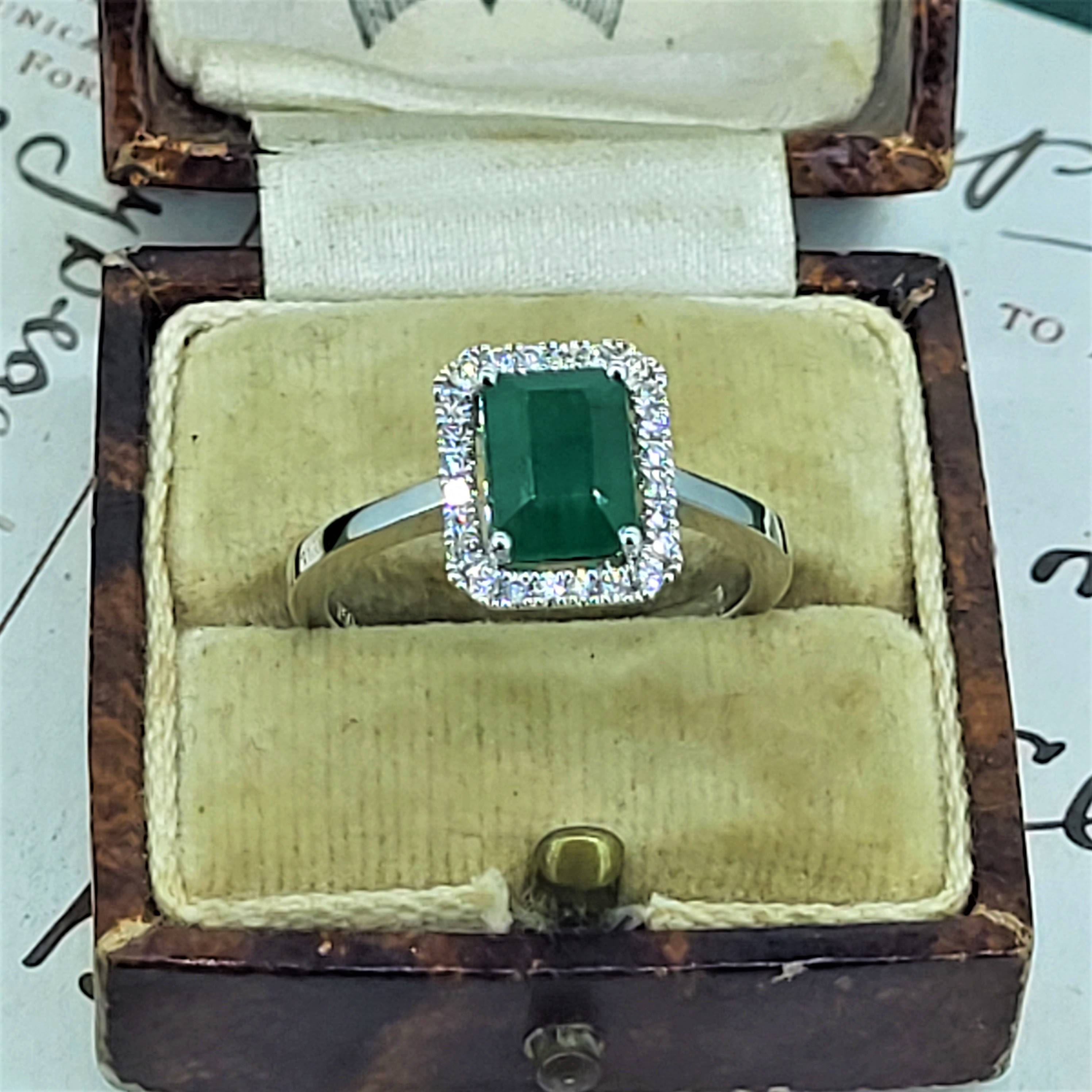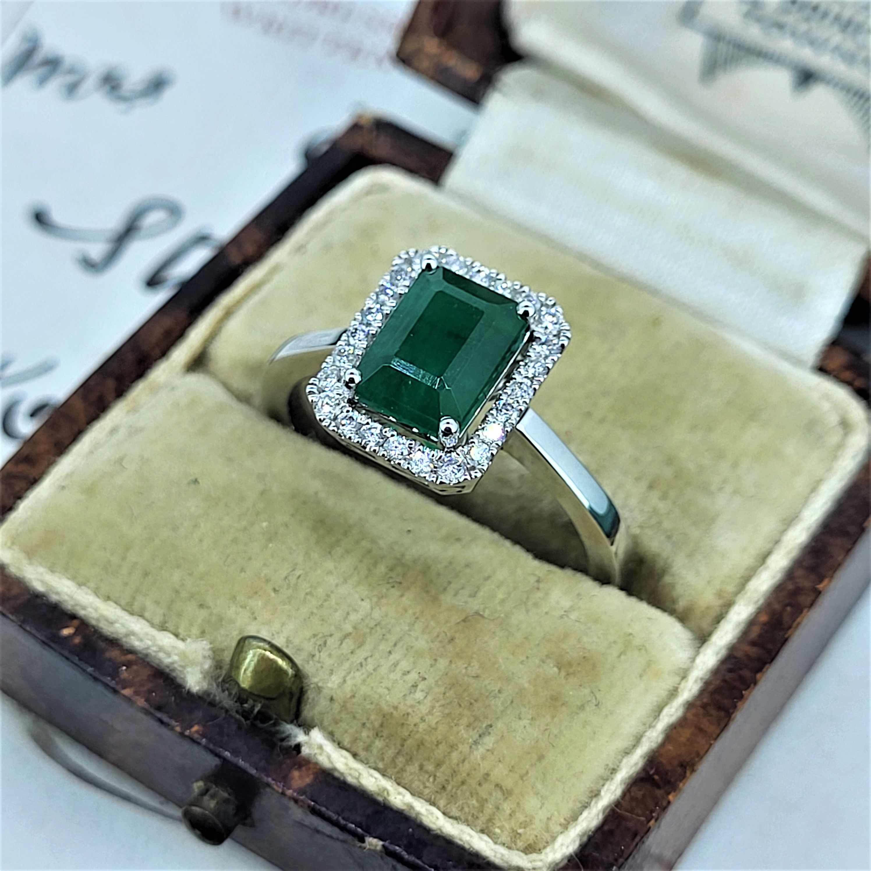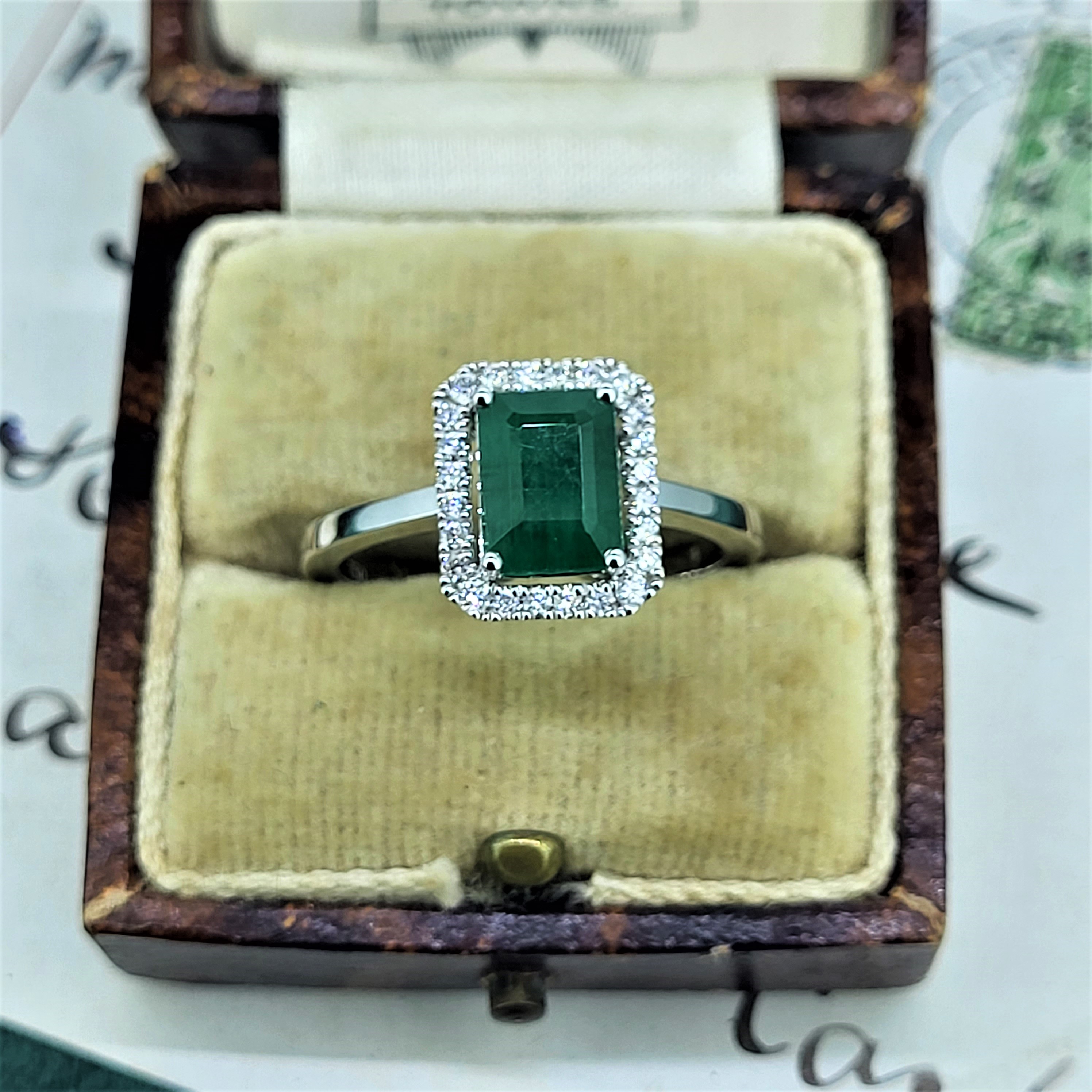 A delightful Emerald and Diamond Halo Ring crafted from 18ct White Gold. This modern design features a stunning verdant green Emerald Cut Emerald which is surrounded by sparkling Round Brilliant Cut Diamonds.