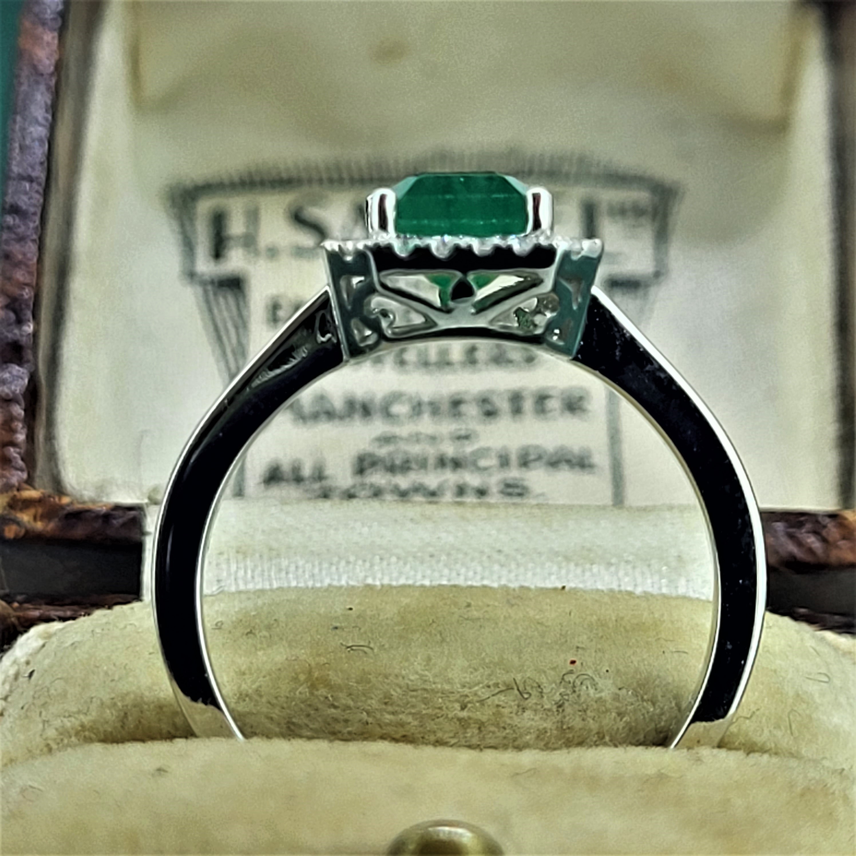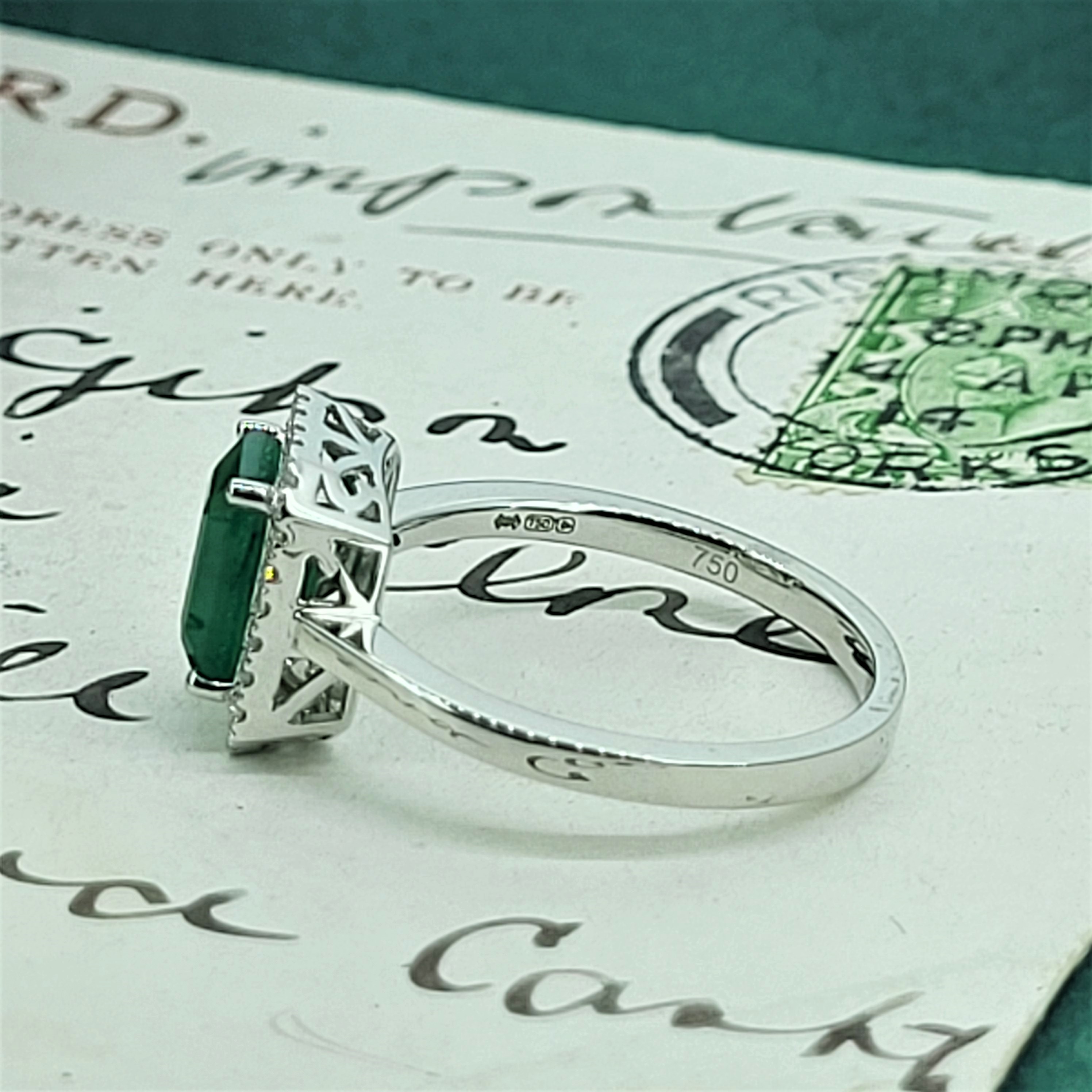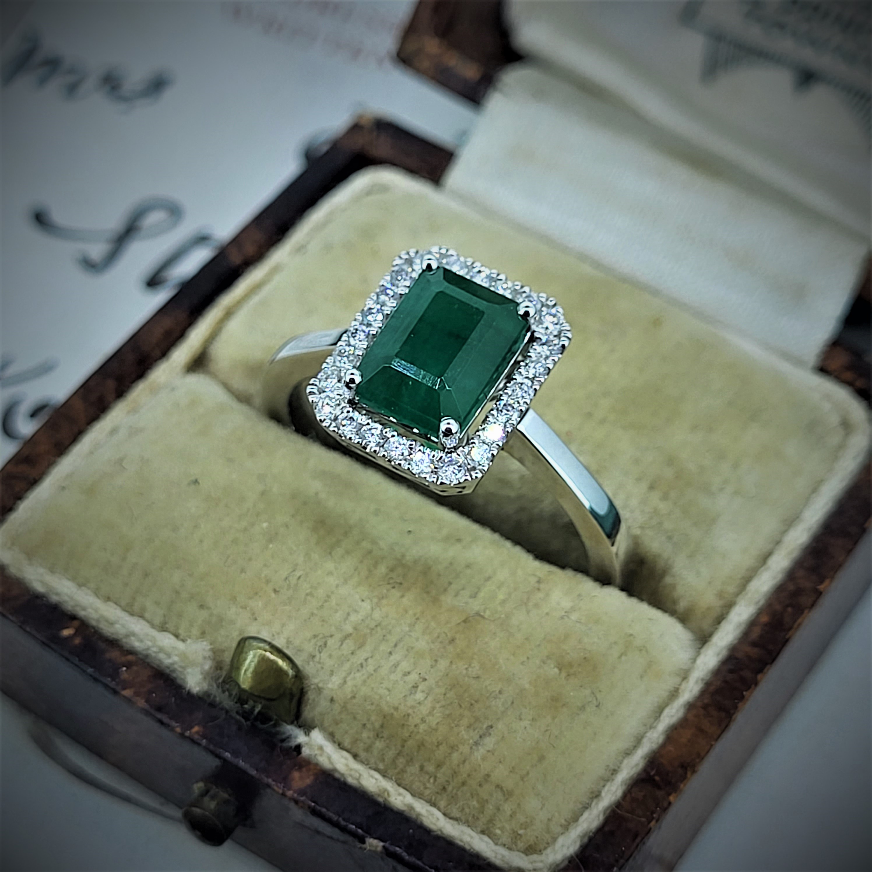 A delightful Emerald and Diamond Halo Ring crafted from 18ct White Gold. This modern design features a stunning verdant green Emerald Cut Emerald which is surrounded by sparkling Round Brilliant Cut Diamonds.