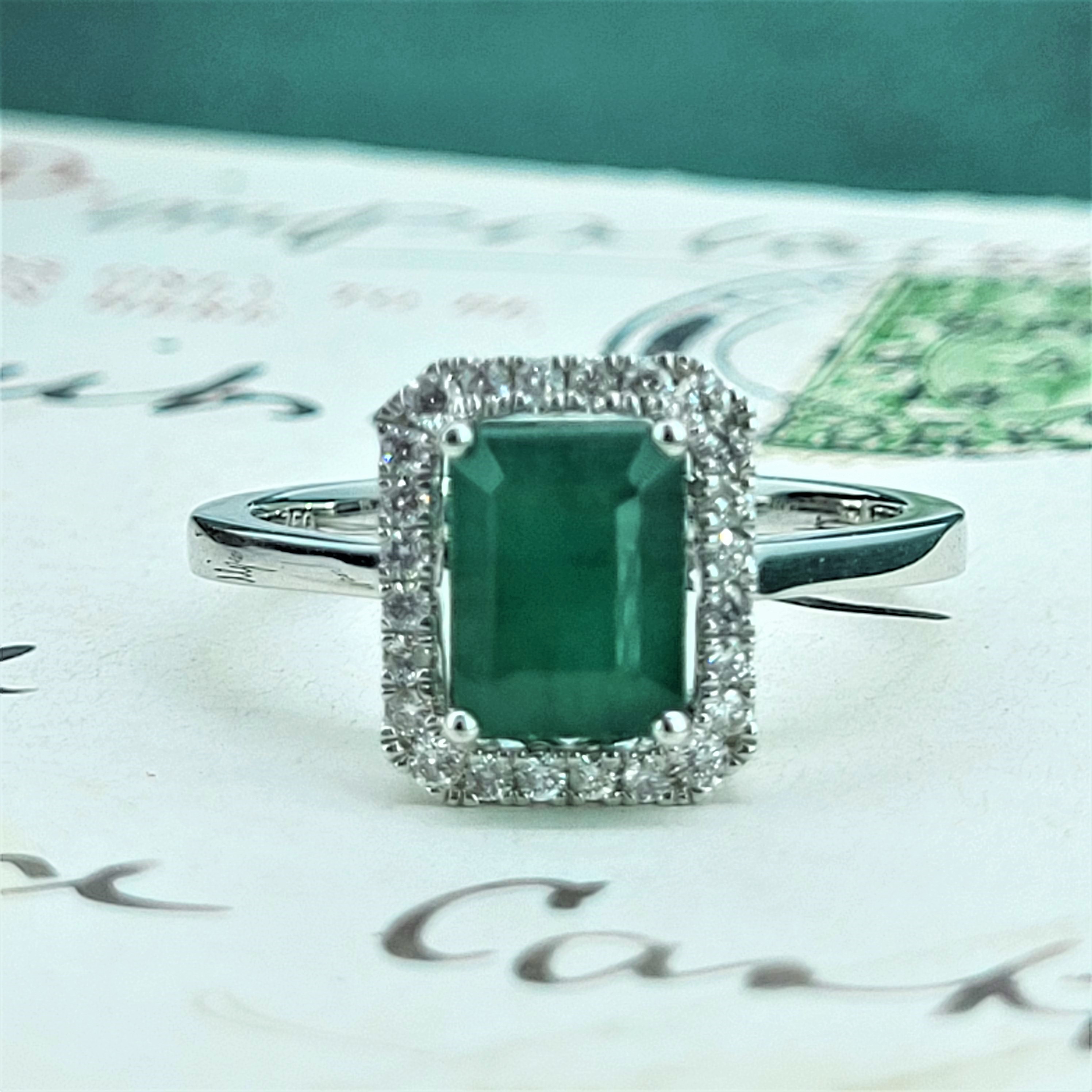 The Emerald measures 8mm by 6mm and weighs an estimated 1.45 carats and the total Diamond weight is 0.20 carats.