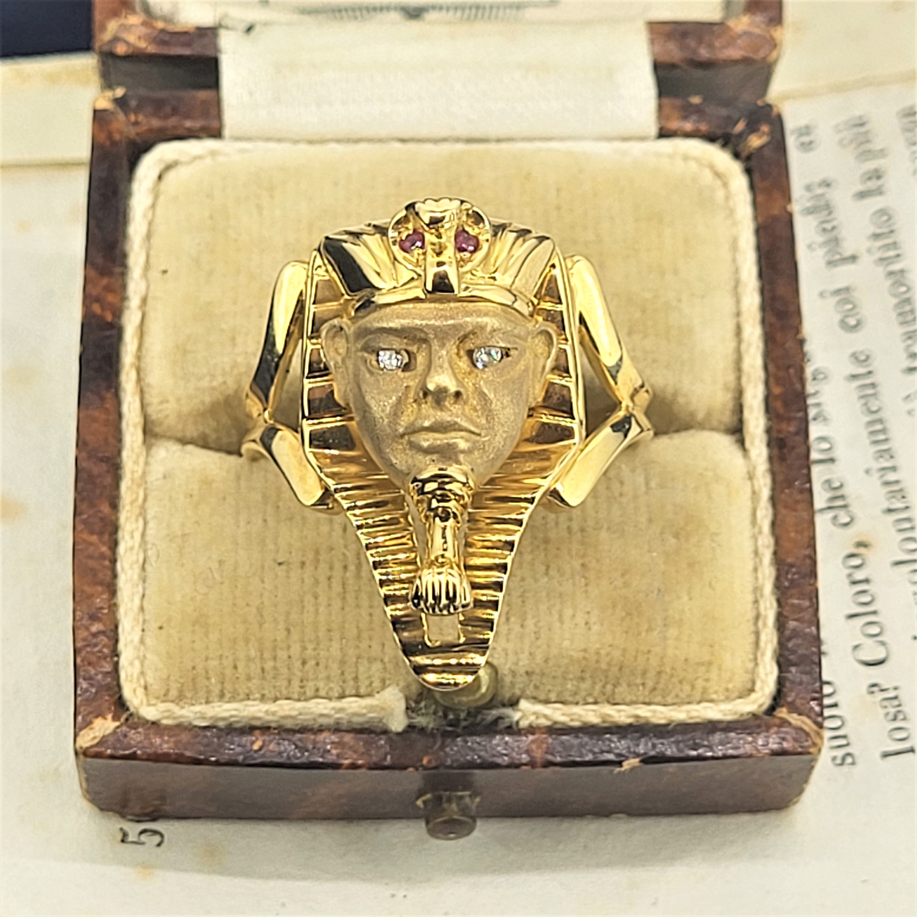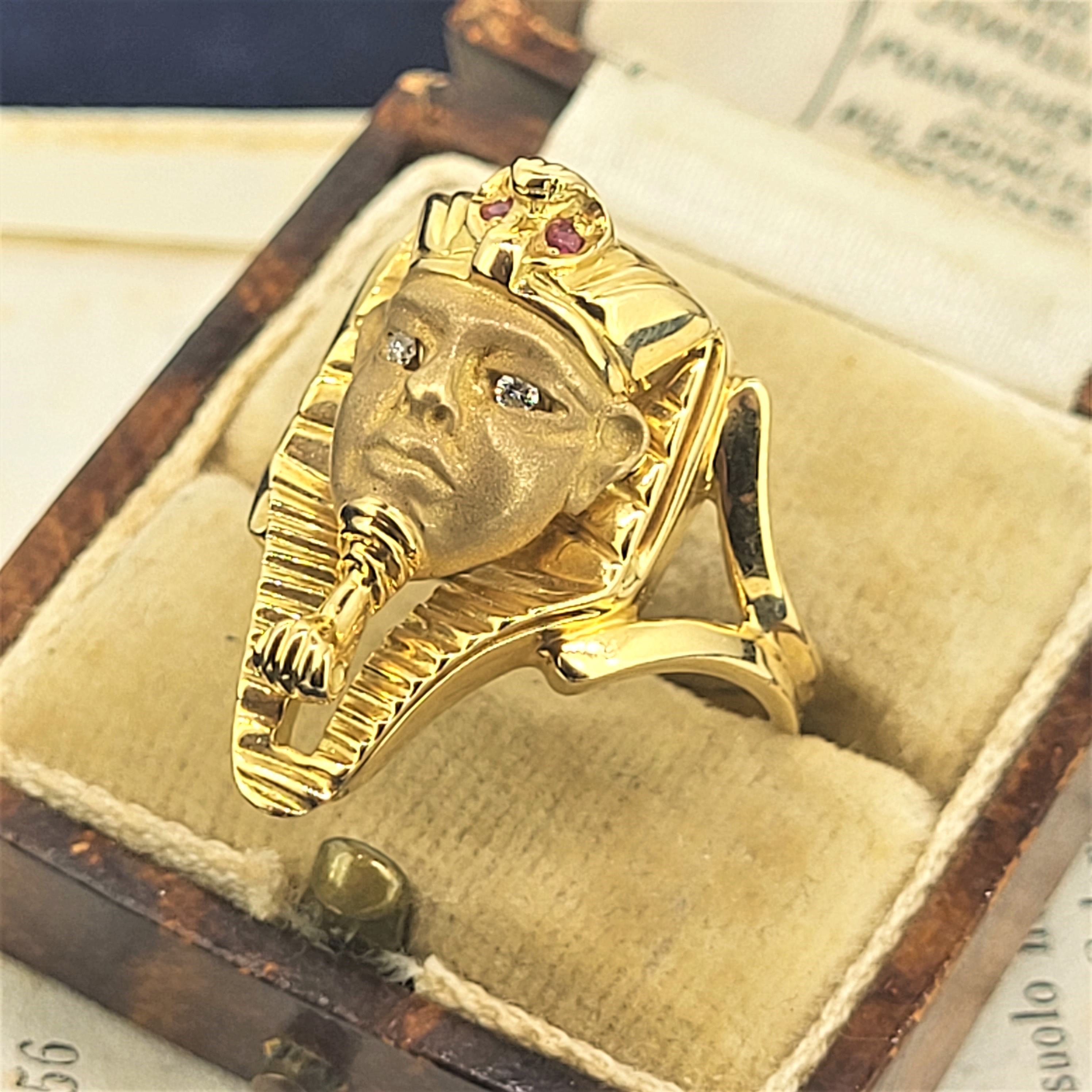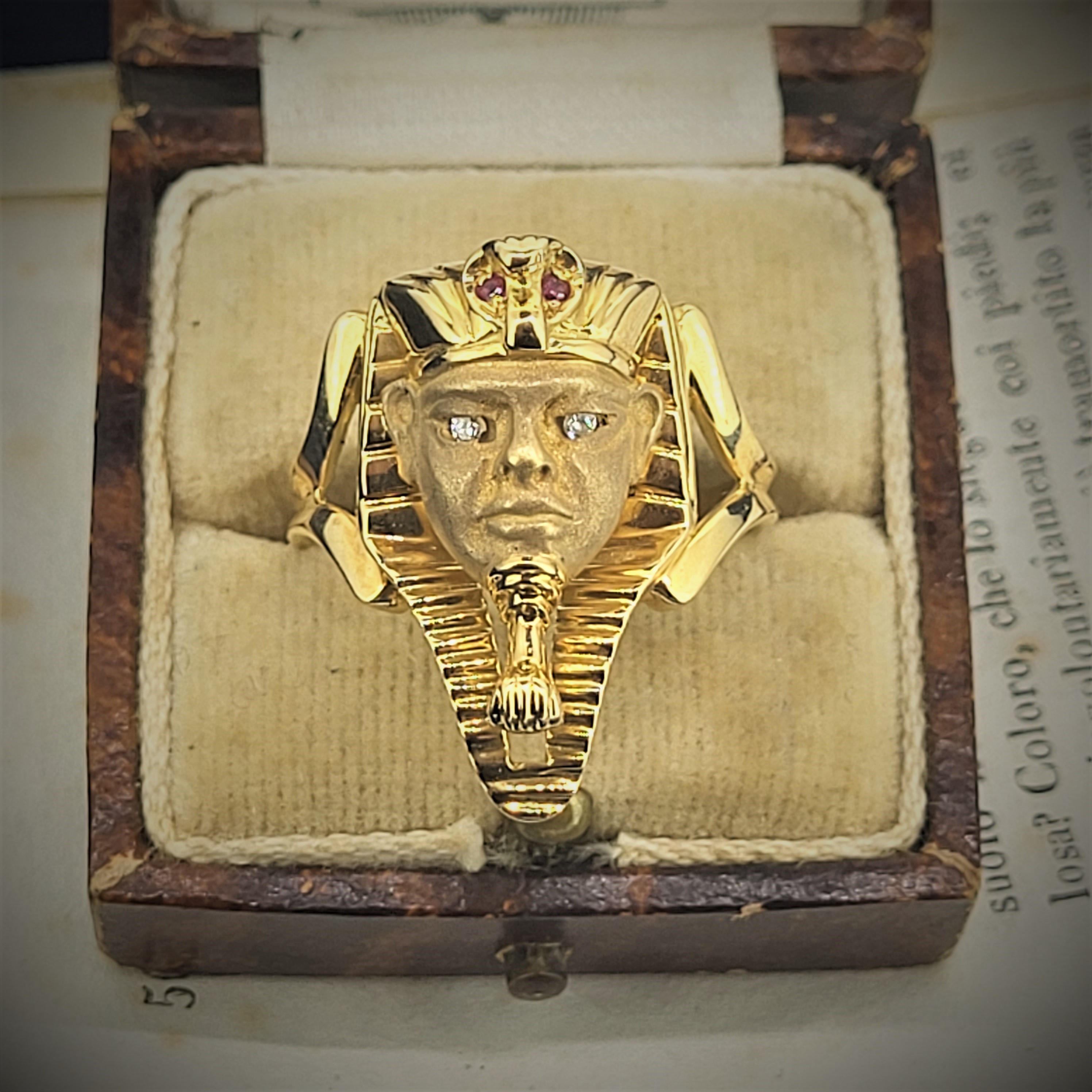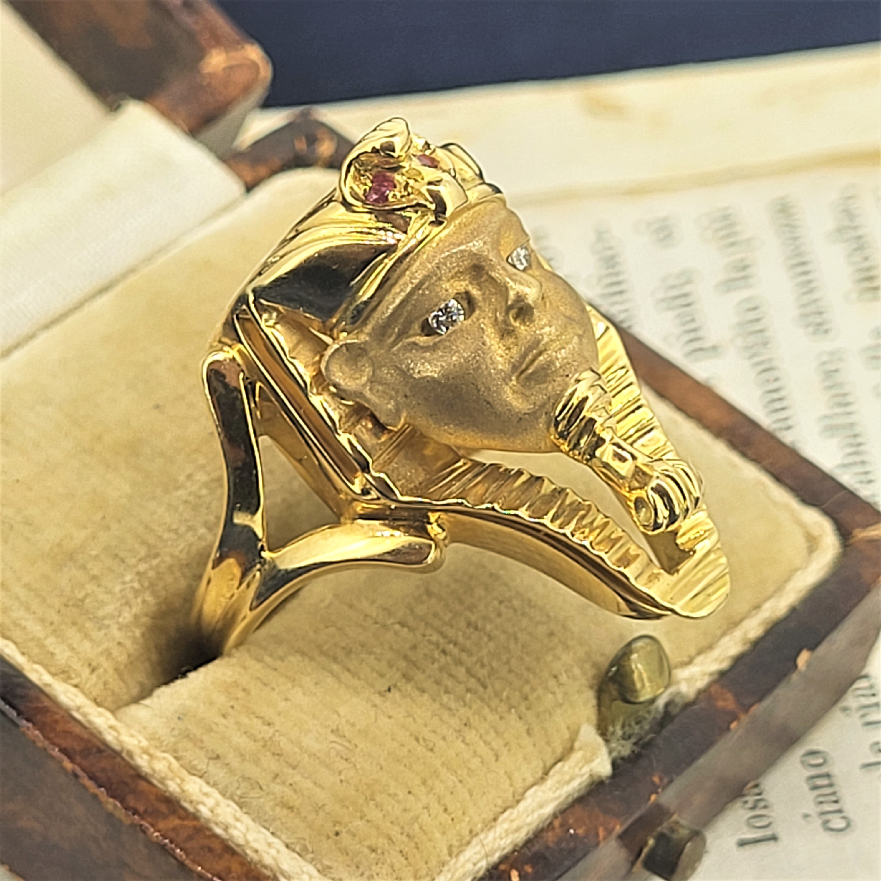 An 18ct Yellow Gold Pharaoh Ring featuring diamond eyes and rubies set in the Nemes headcloth which is topped by the royal insignia of a cobra and vulture.