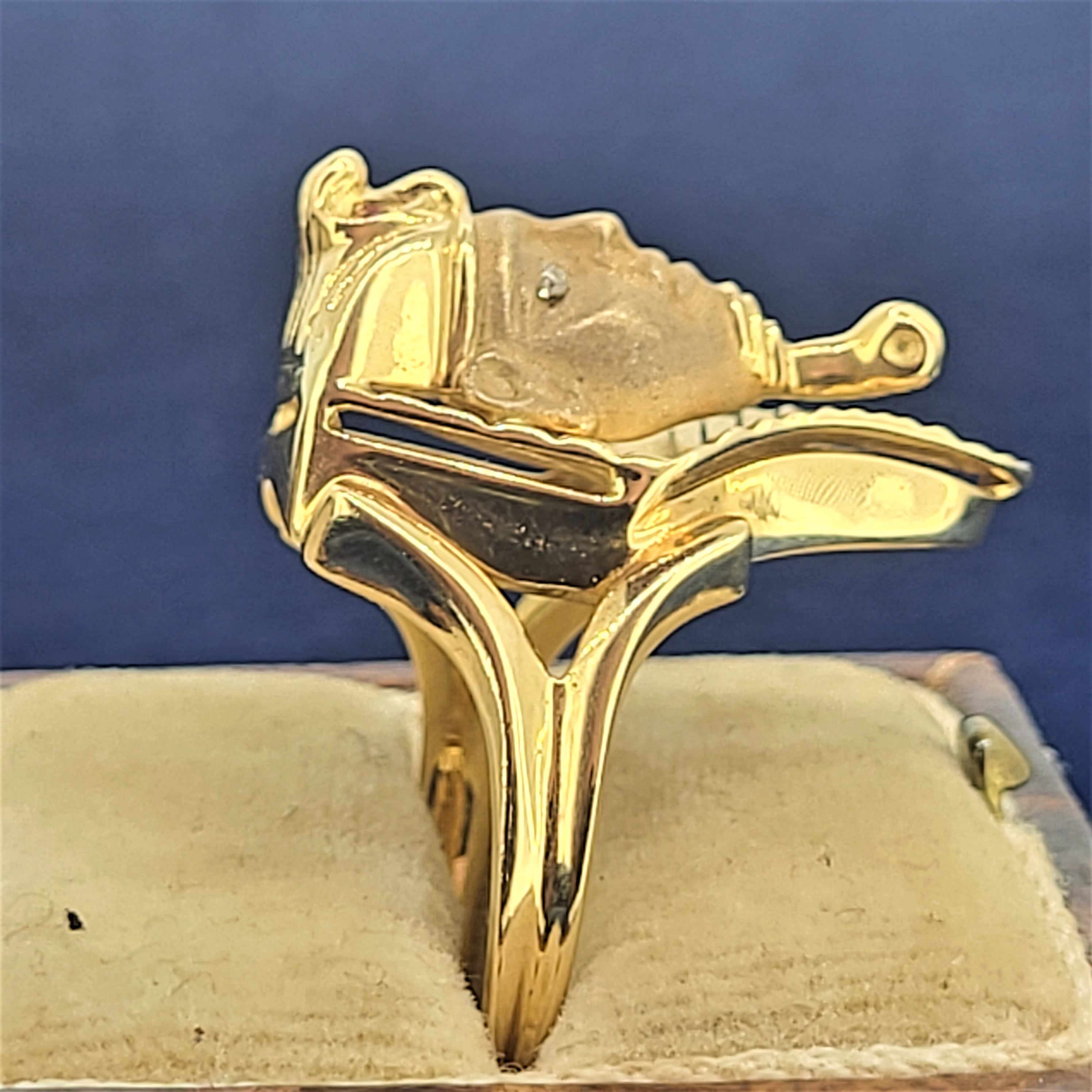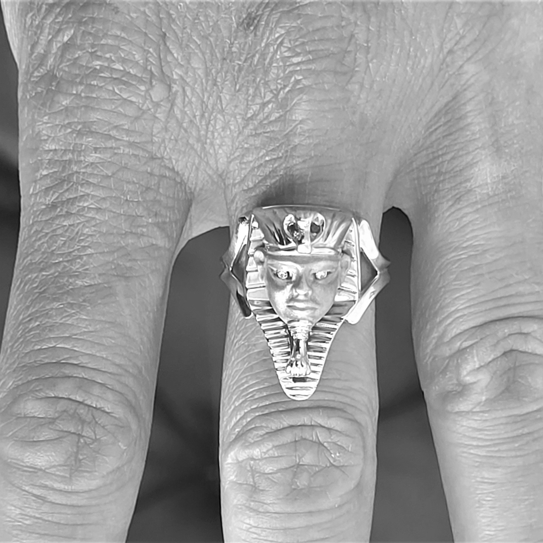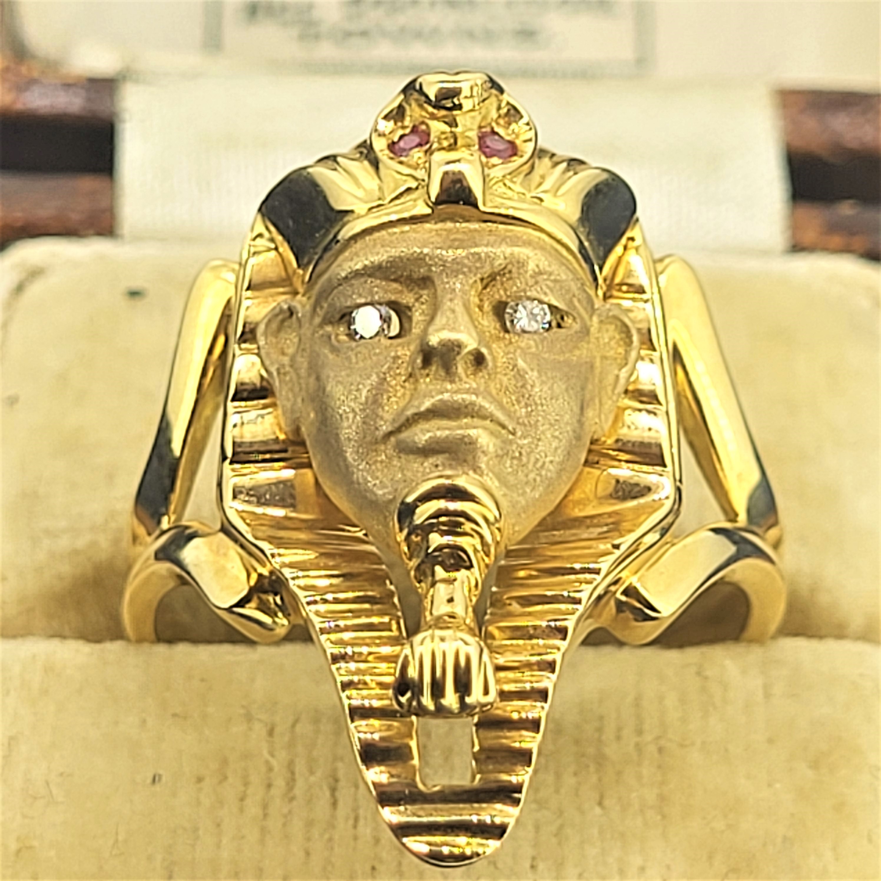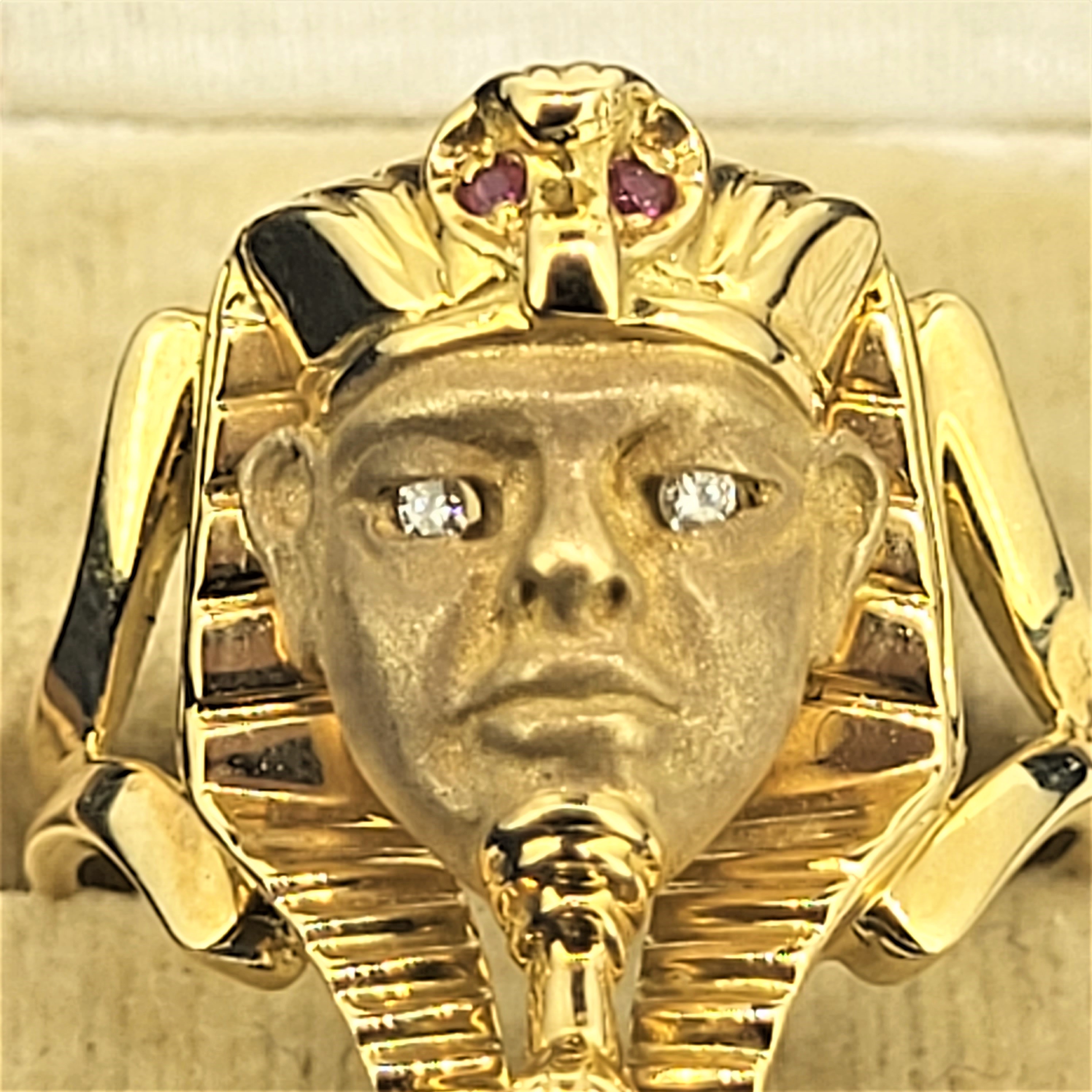 An 18ct Yellow Gold Pharaoh Ring featuring diamond eyes and rubies set in the Nemes headcloth which is topped by the royal insignia of a cobra and vulture.