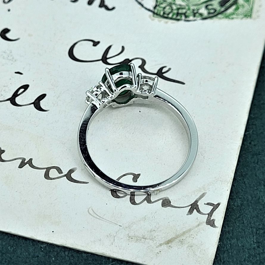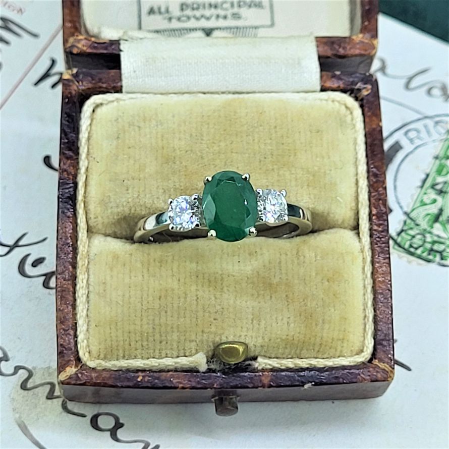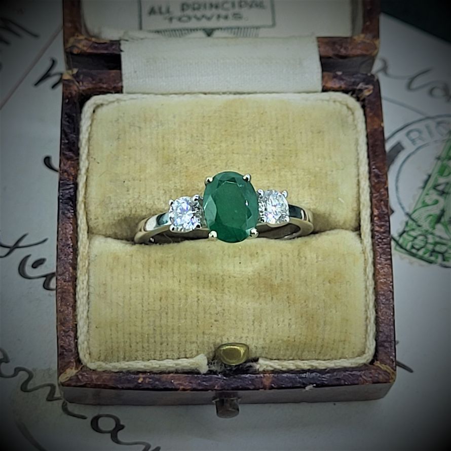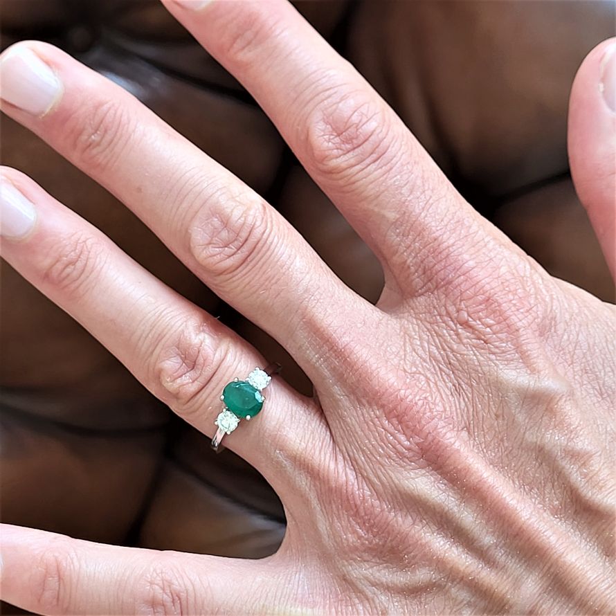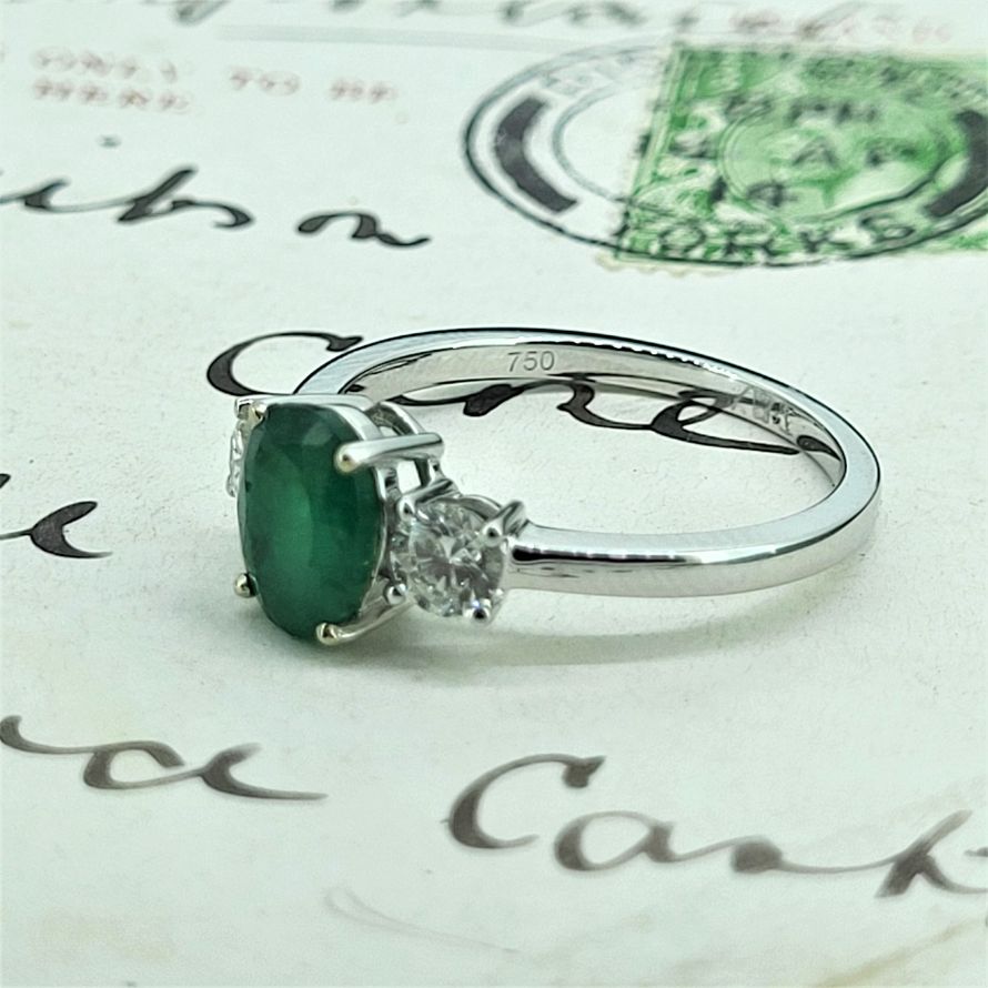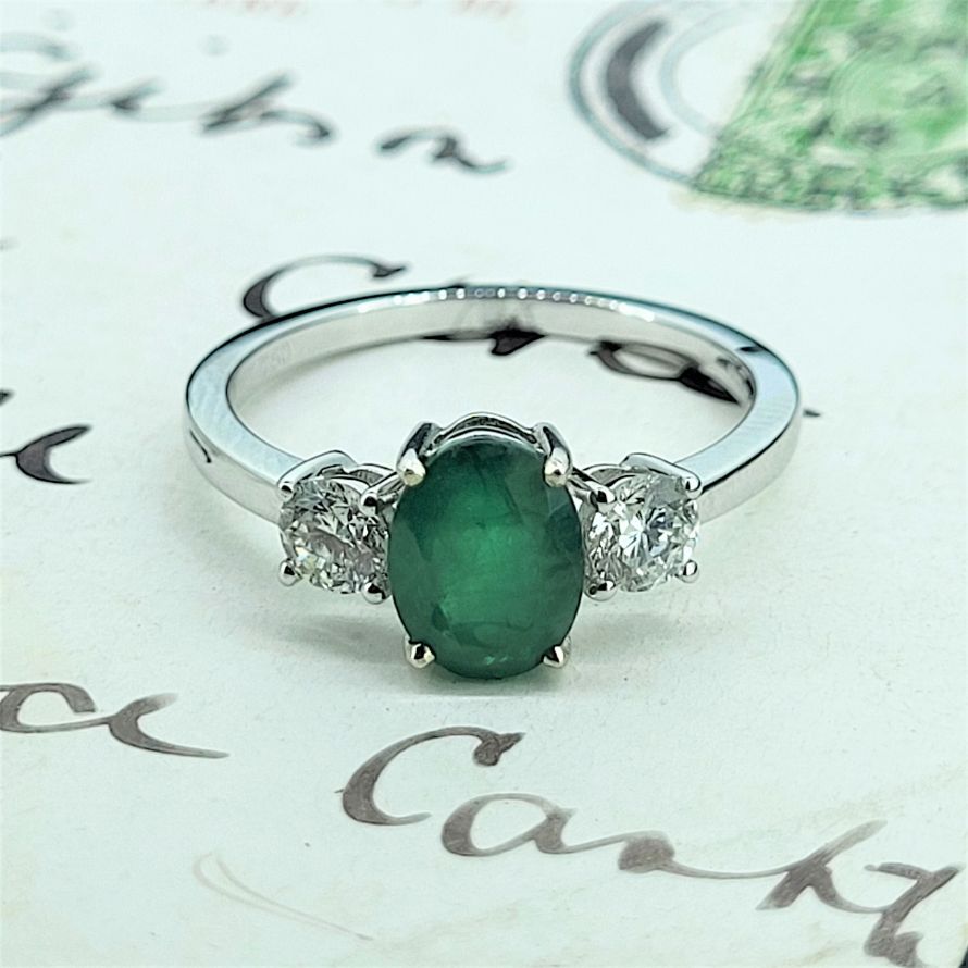 This one is a beauty featuring an oval emerald weighing 1ct exactly and measuring 6mm by 5mm. beautifully positioned between two 0.25ct round brilliant cut diamonds.