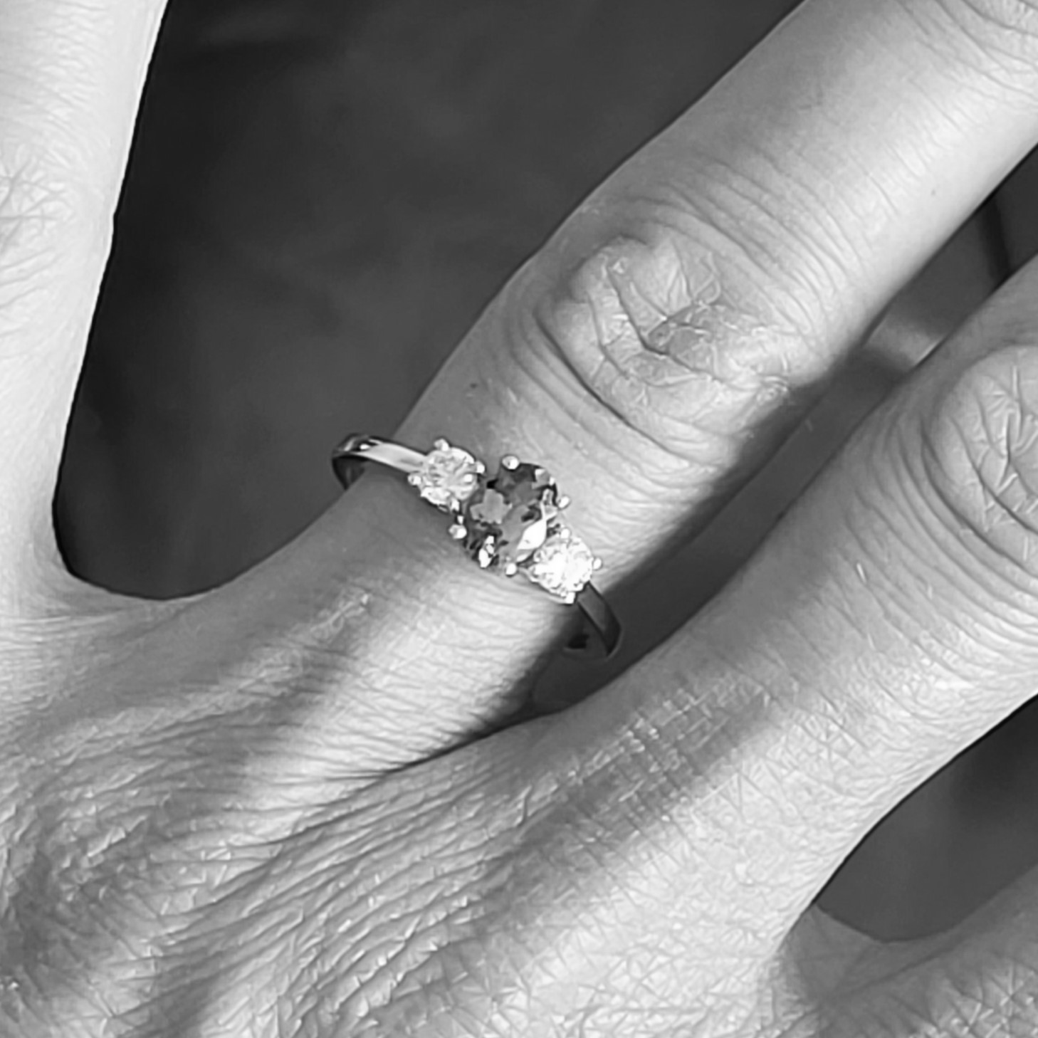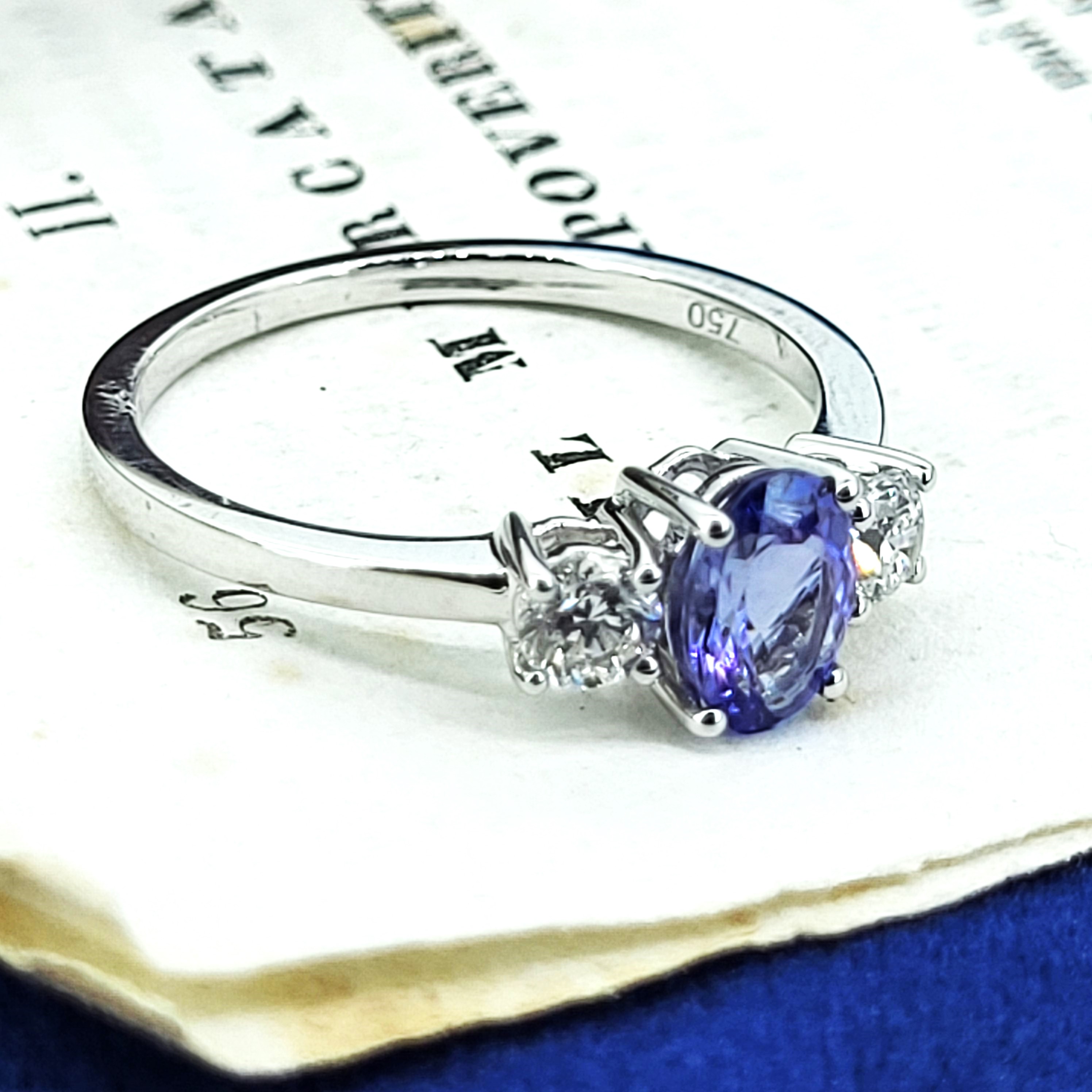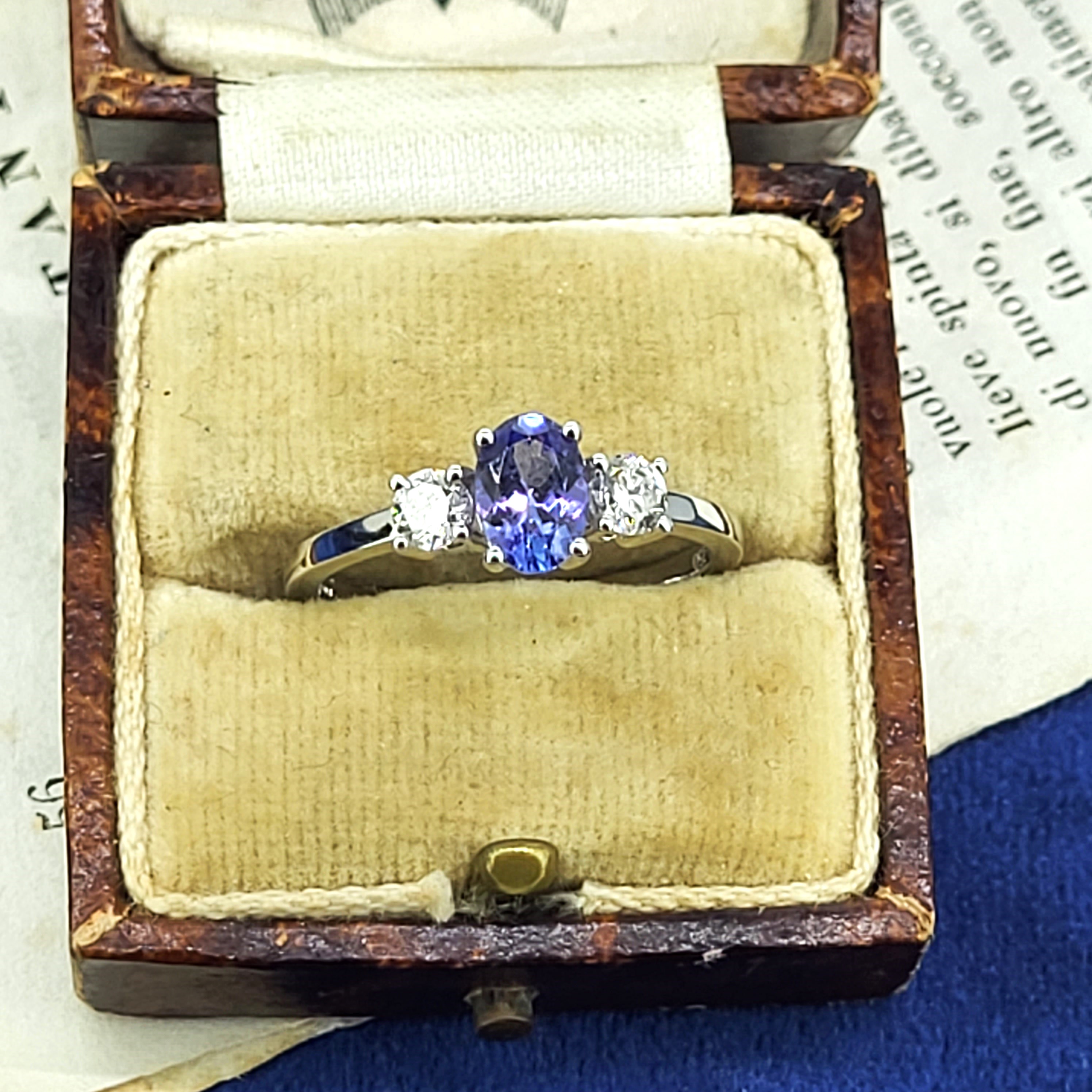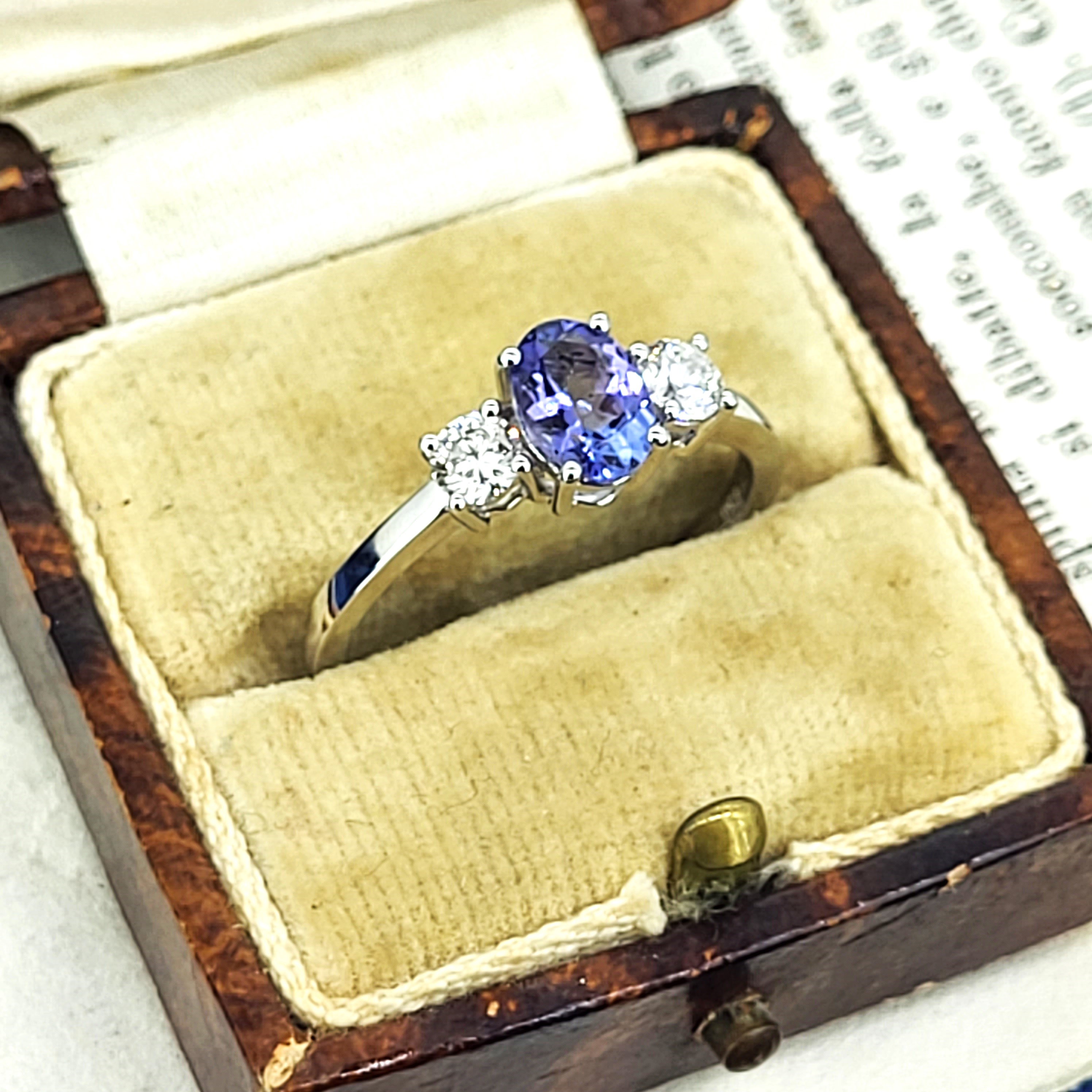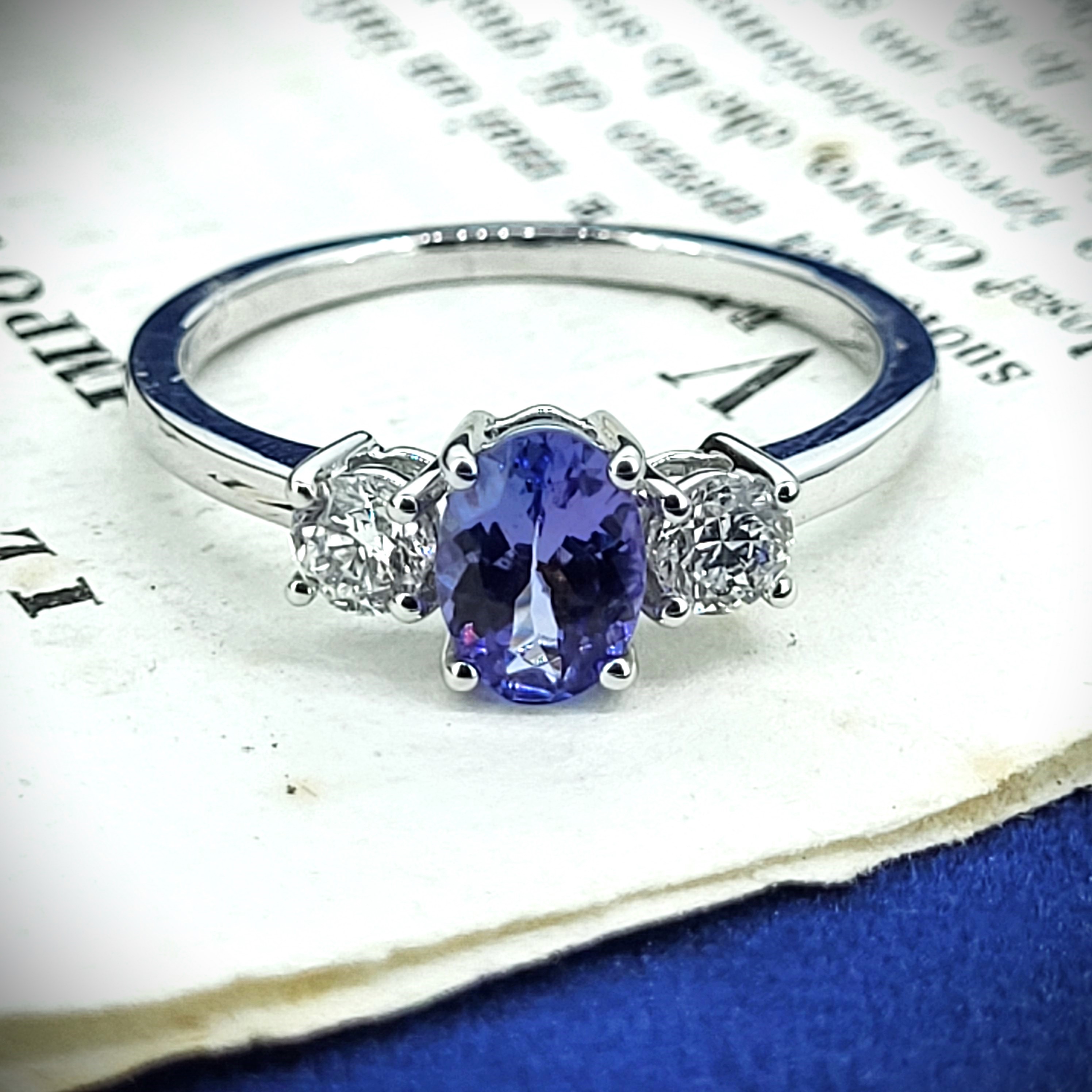 This ring features a lovely Tanzanite measuring 7mm by 5mm, weighing an estimated 0.82cts and the Diamonds either side weigh a total weight of 0.31cts.