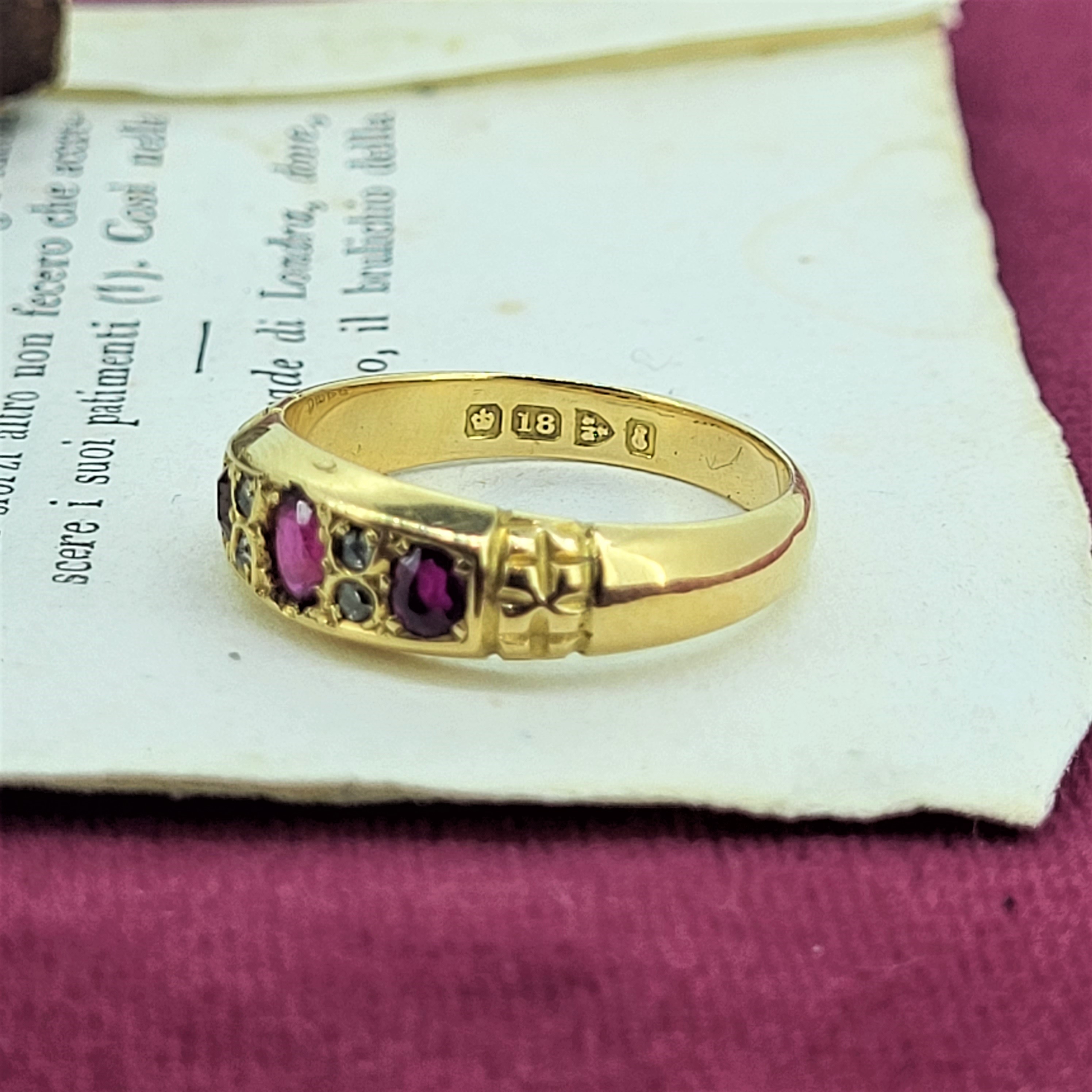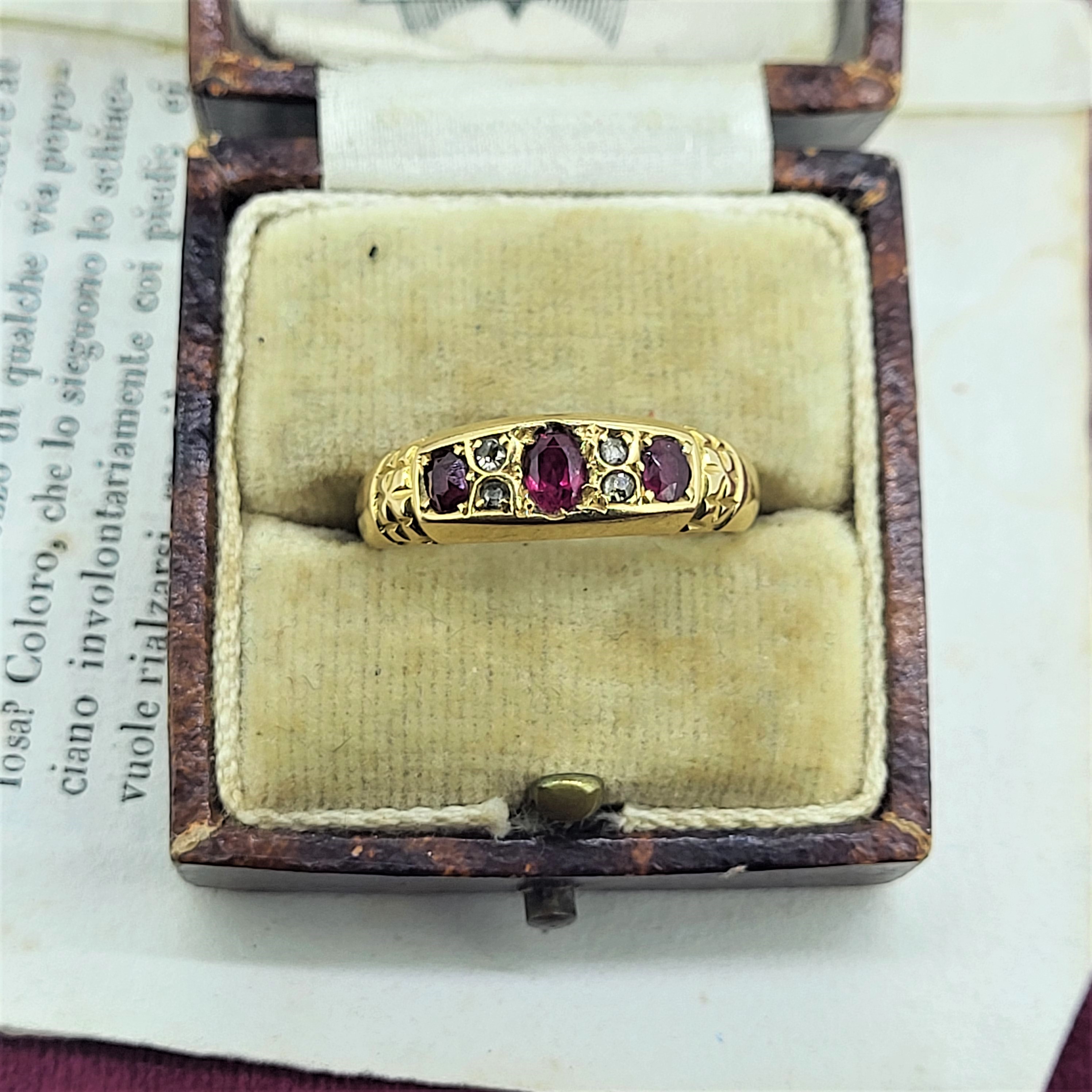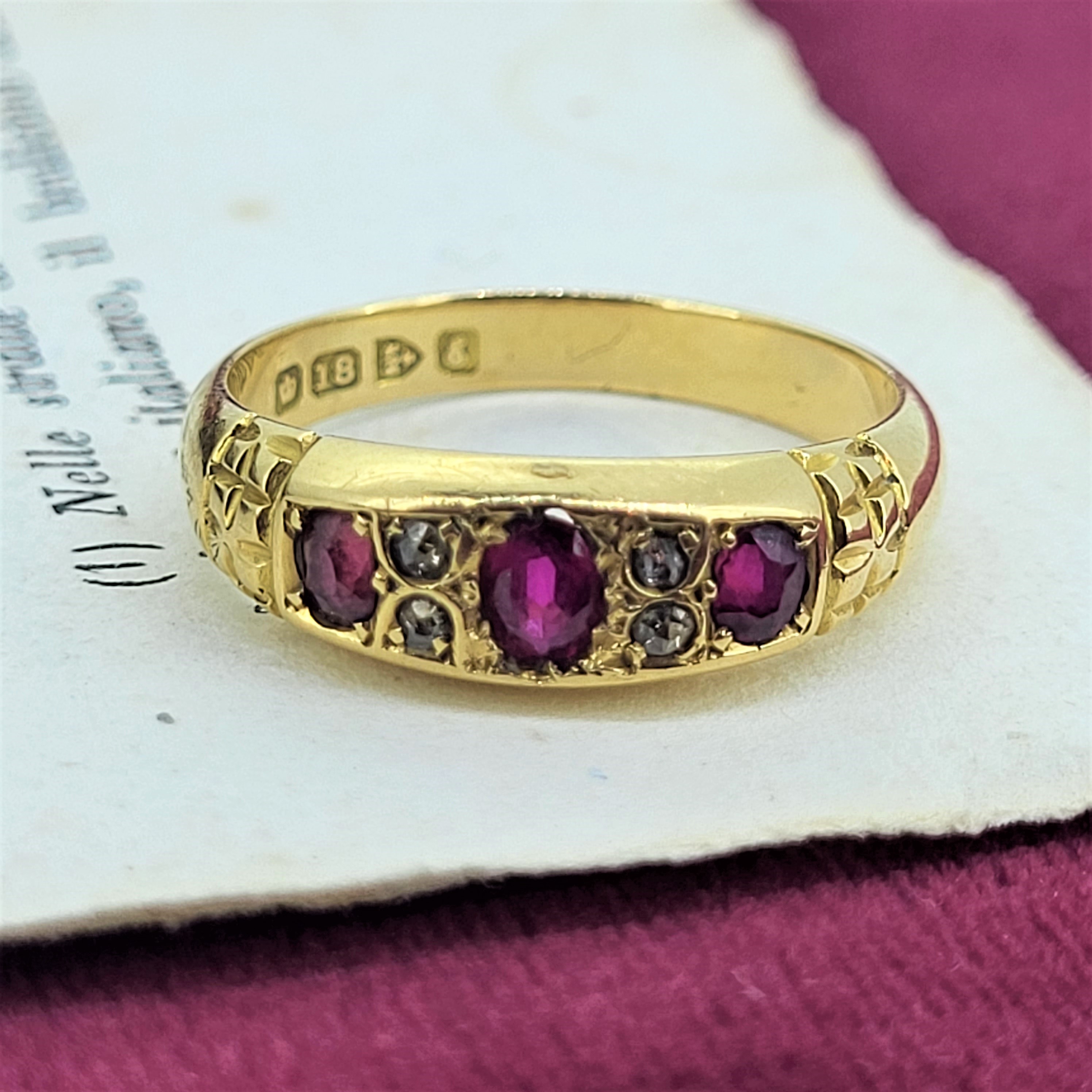 18ct Ruby and Diamond Ring hallmarked in Chester in 1905. The ring features three oval rubies with four contrasting round brilliant diamonds. The ring weighs 3.4 grams, is a Size O and can't be sized due to the placement of the hallmark.
