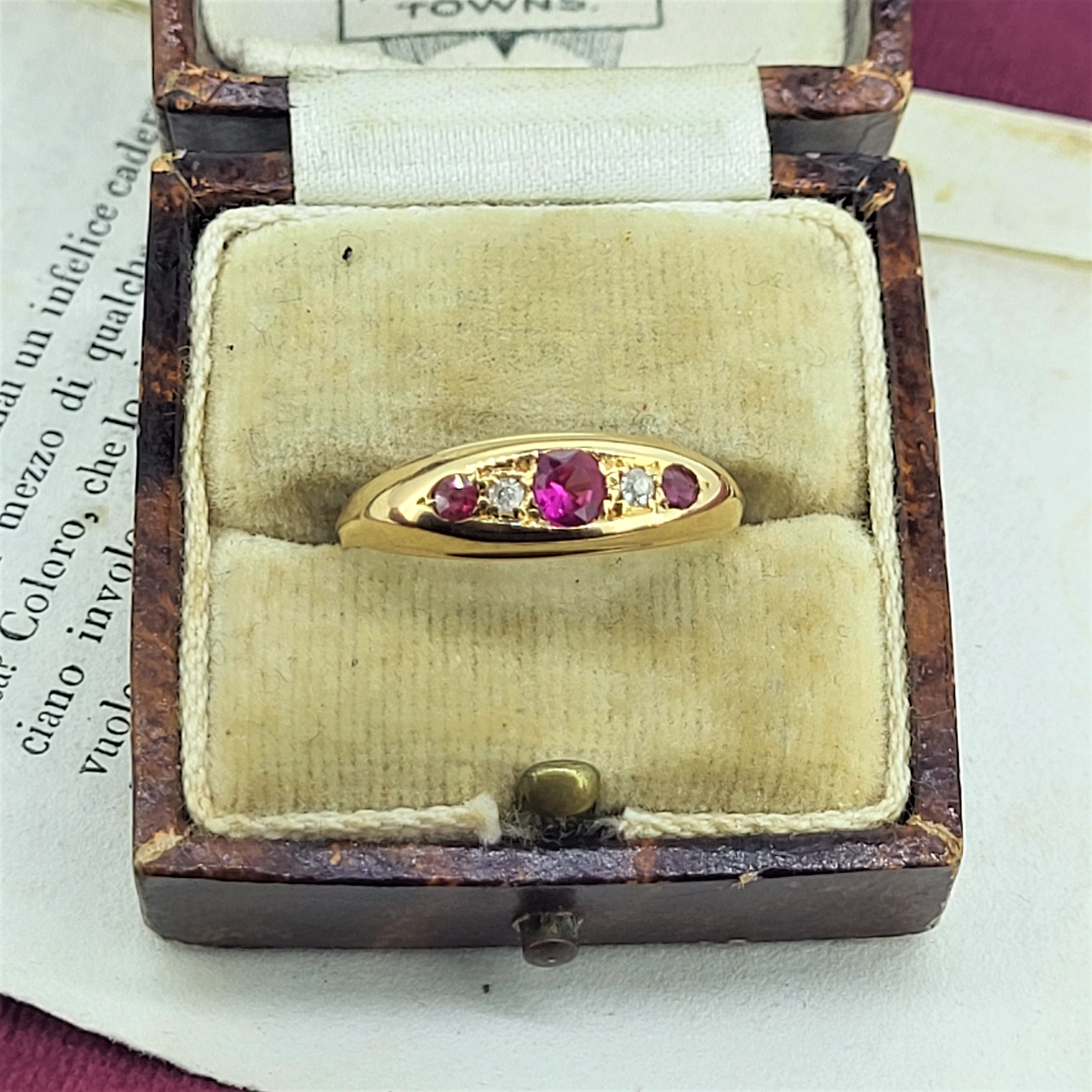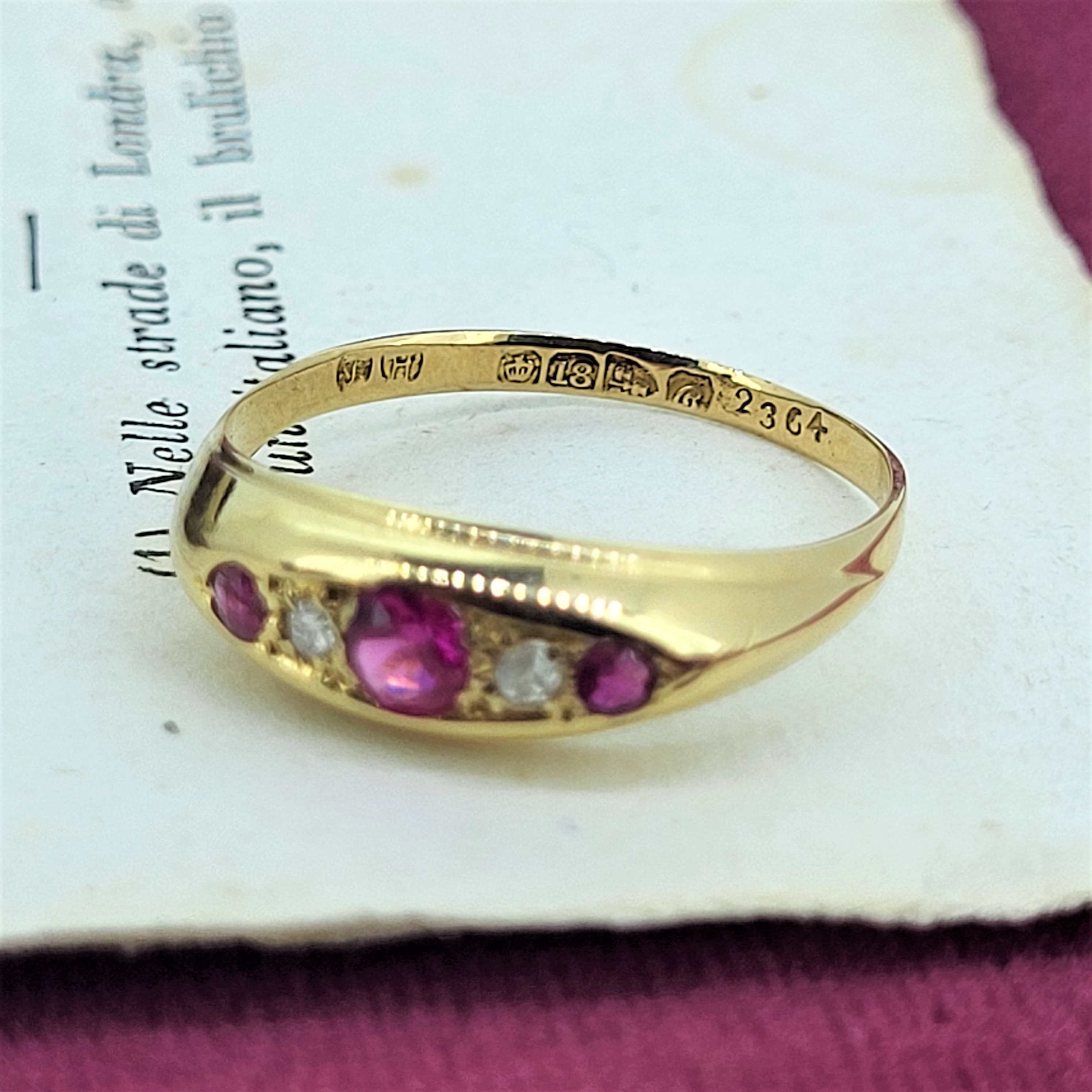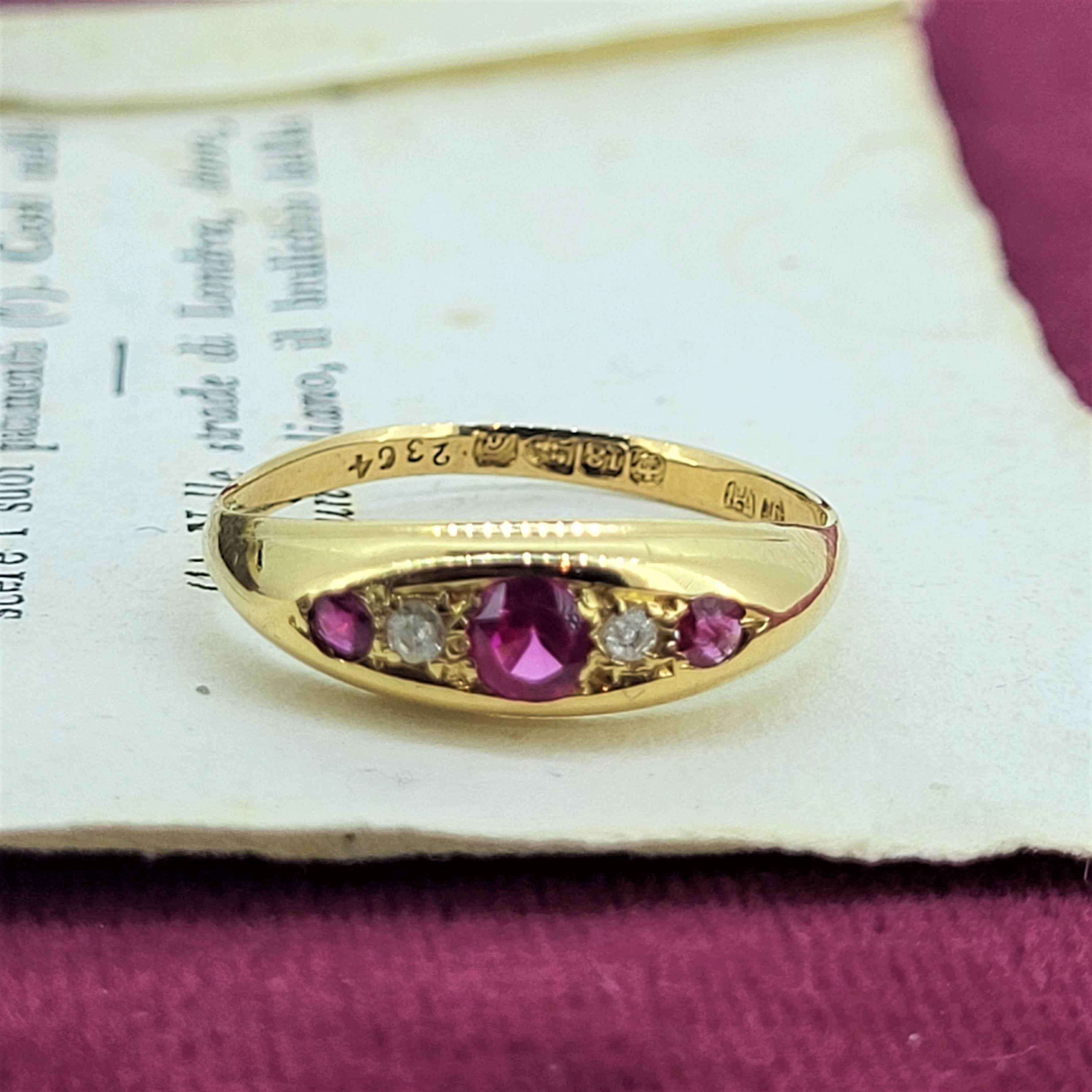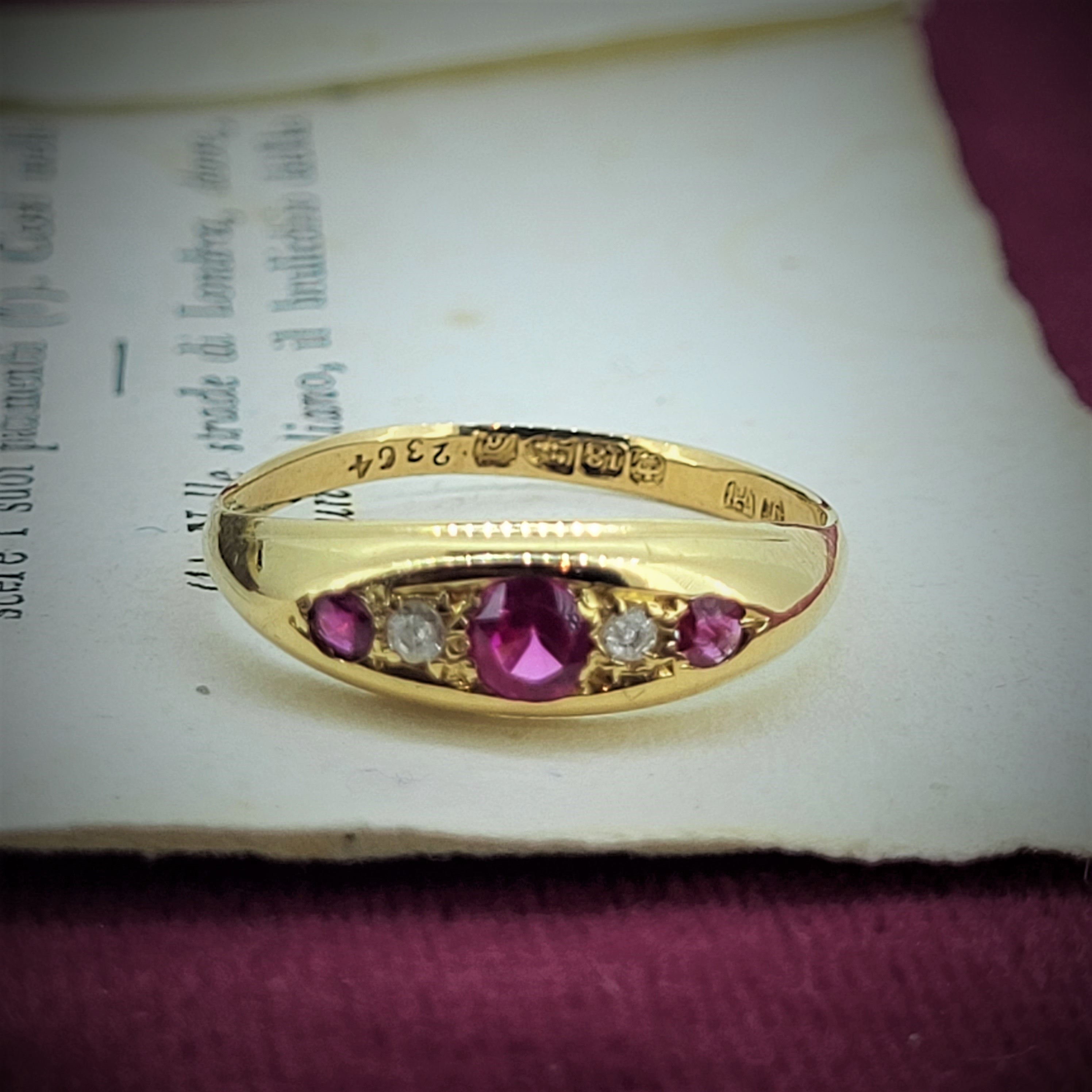 18ct Ruby and Diamond Ring from the Edwardian Era. It was hallmarked Chester in 1903 by J.H for James Harrison who had a workshop on Tenby Lane in Birmingham's Jewellery Quarter. The ring features three rubies and two diamonds that are set in a lovely smooth setting.
