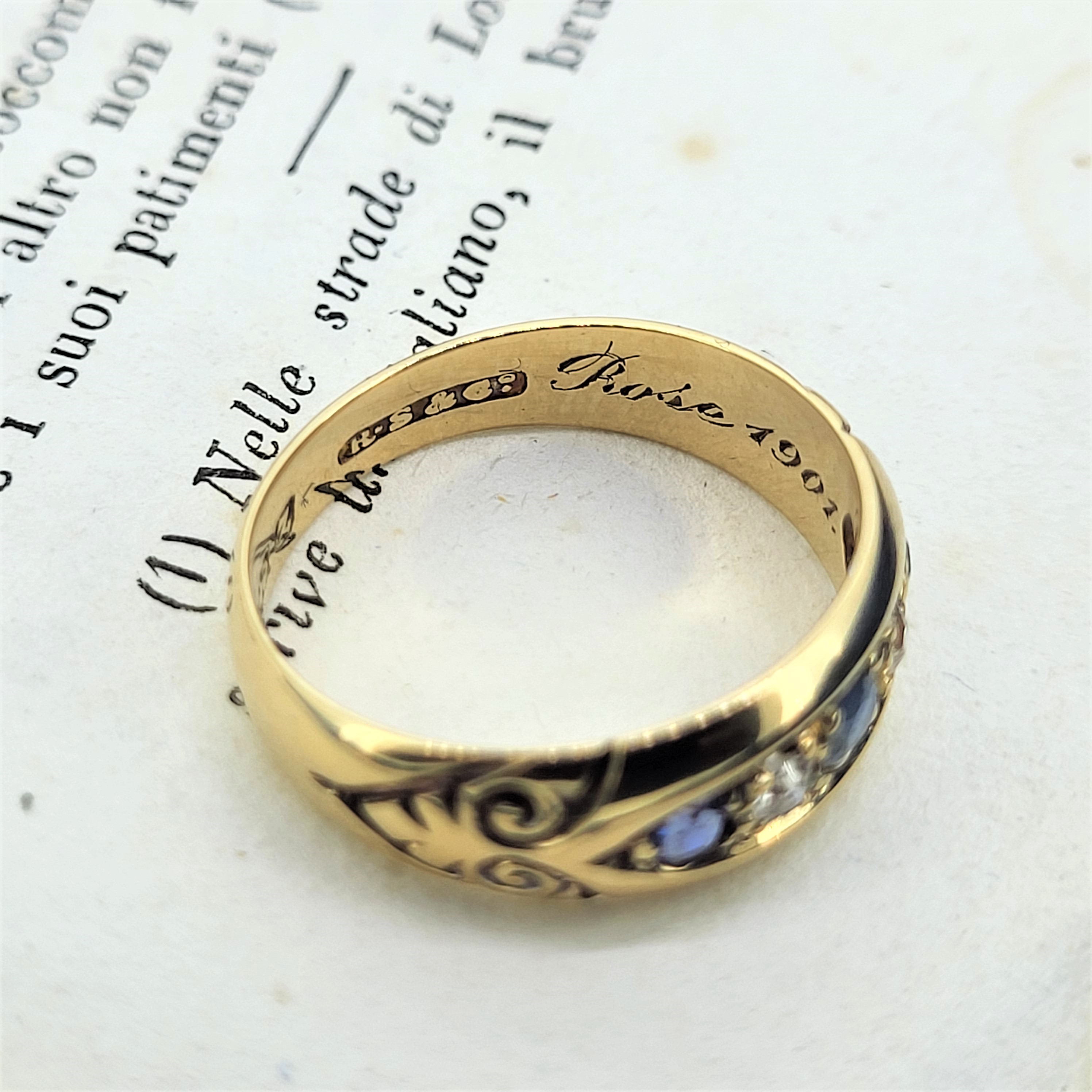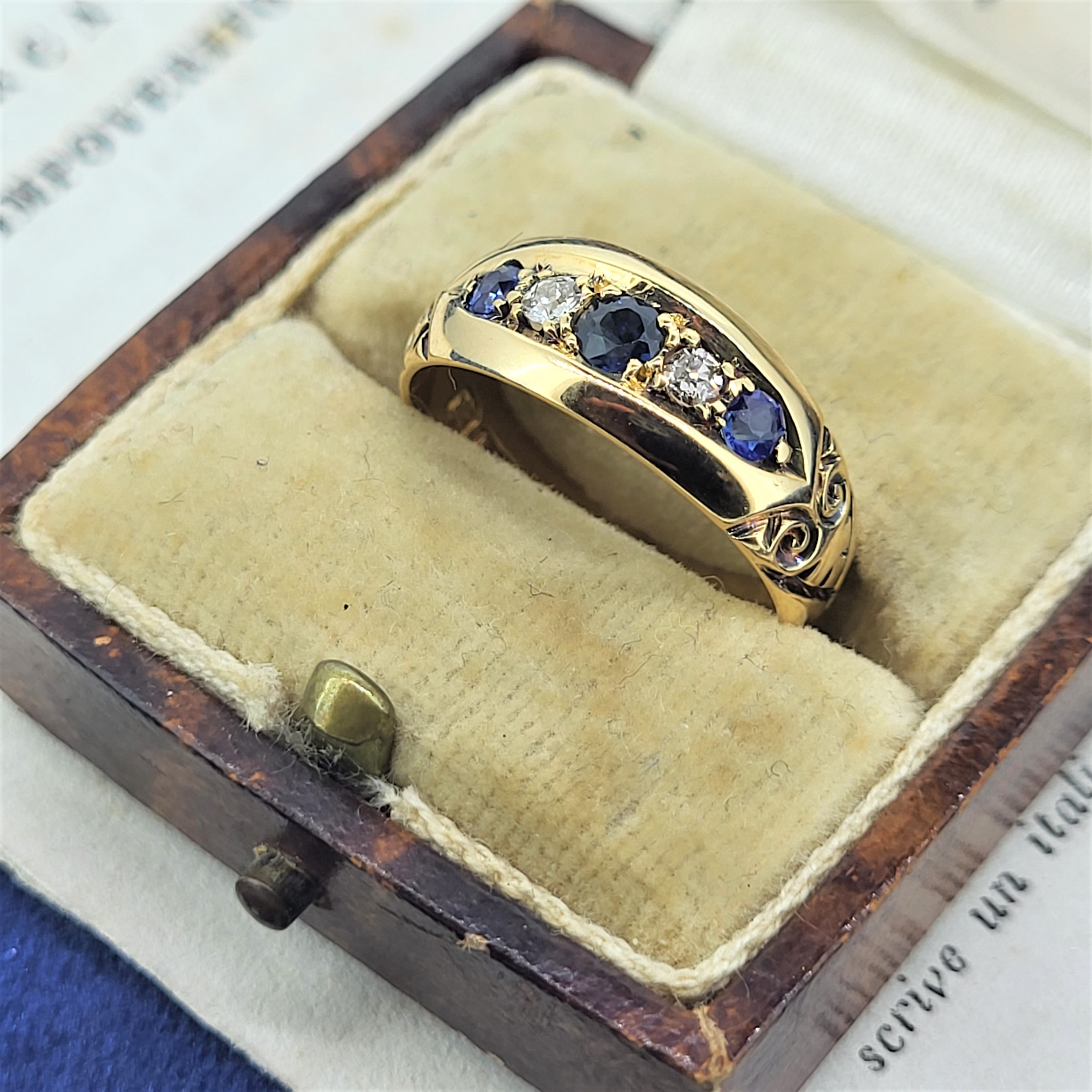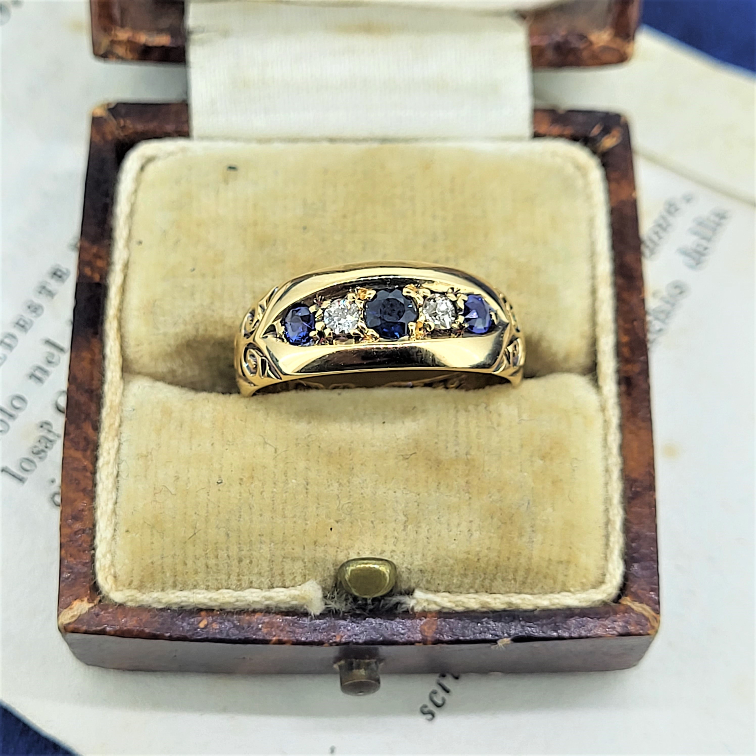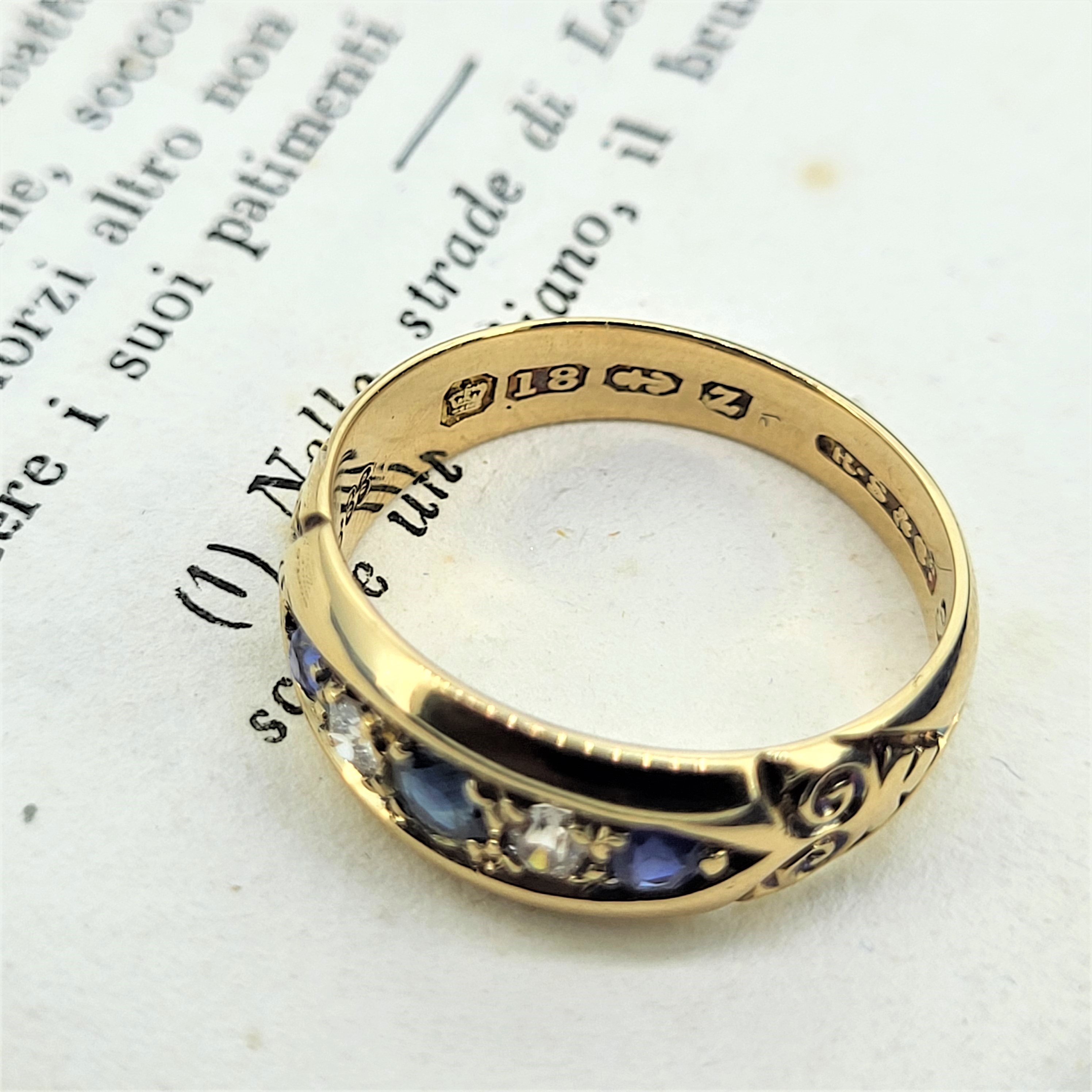 A stunning 18ct Sapphire and Diamond Dress Ring from the Victorian Era. The ring was hallmarked in Birmingham in 1899 by R.S & Co which we unfortunately can't find anymore information on. The setting is nice and smooth and the ring features ornate scroll detail on the shoulders. It is a Size K and can't be sized.