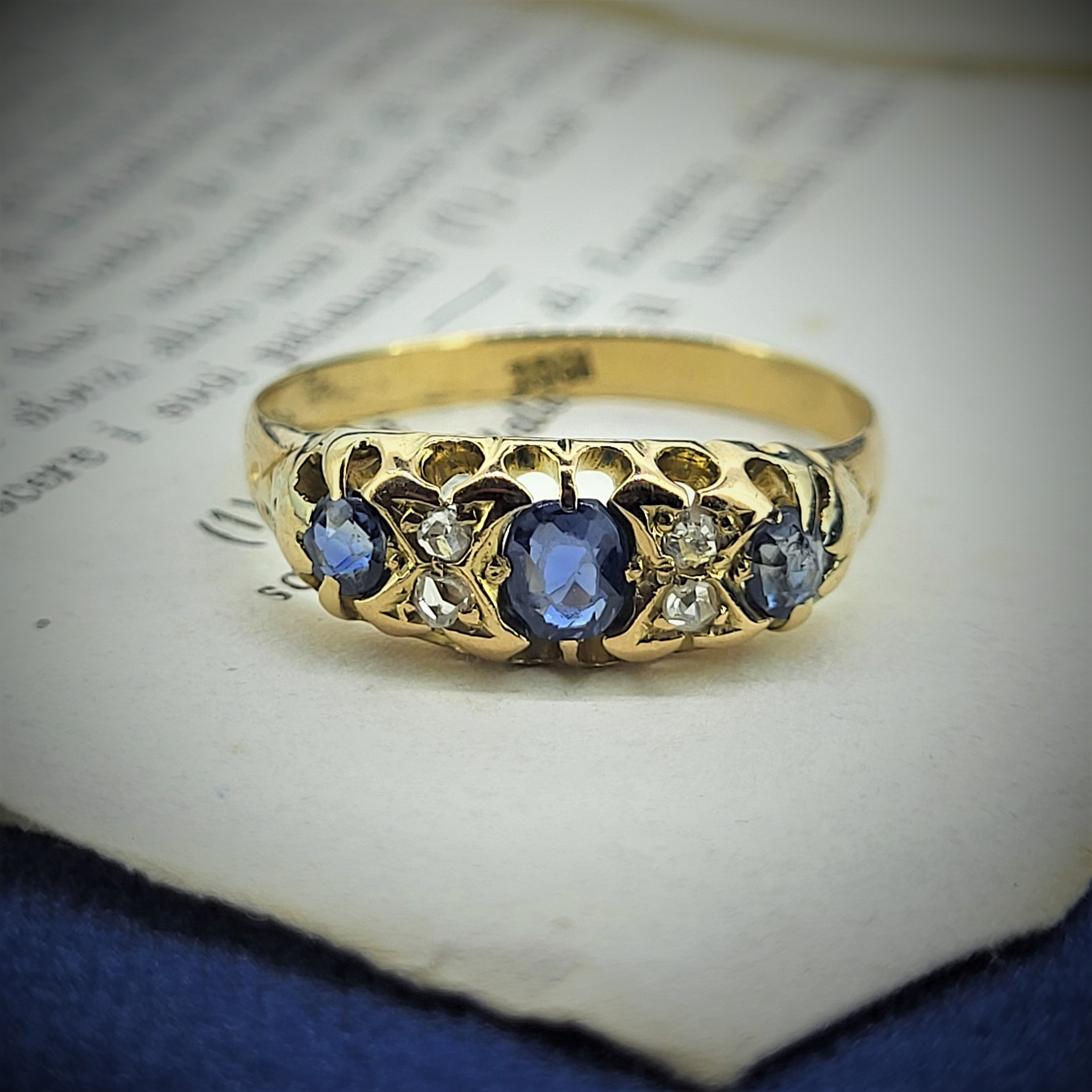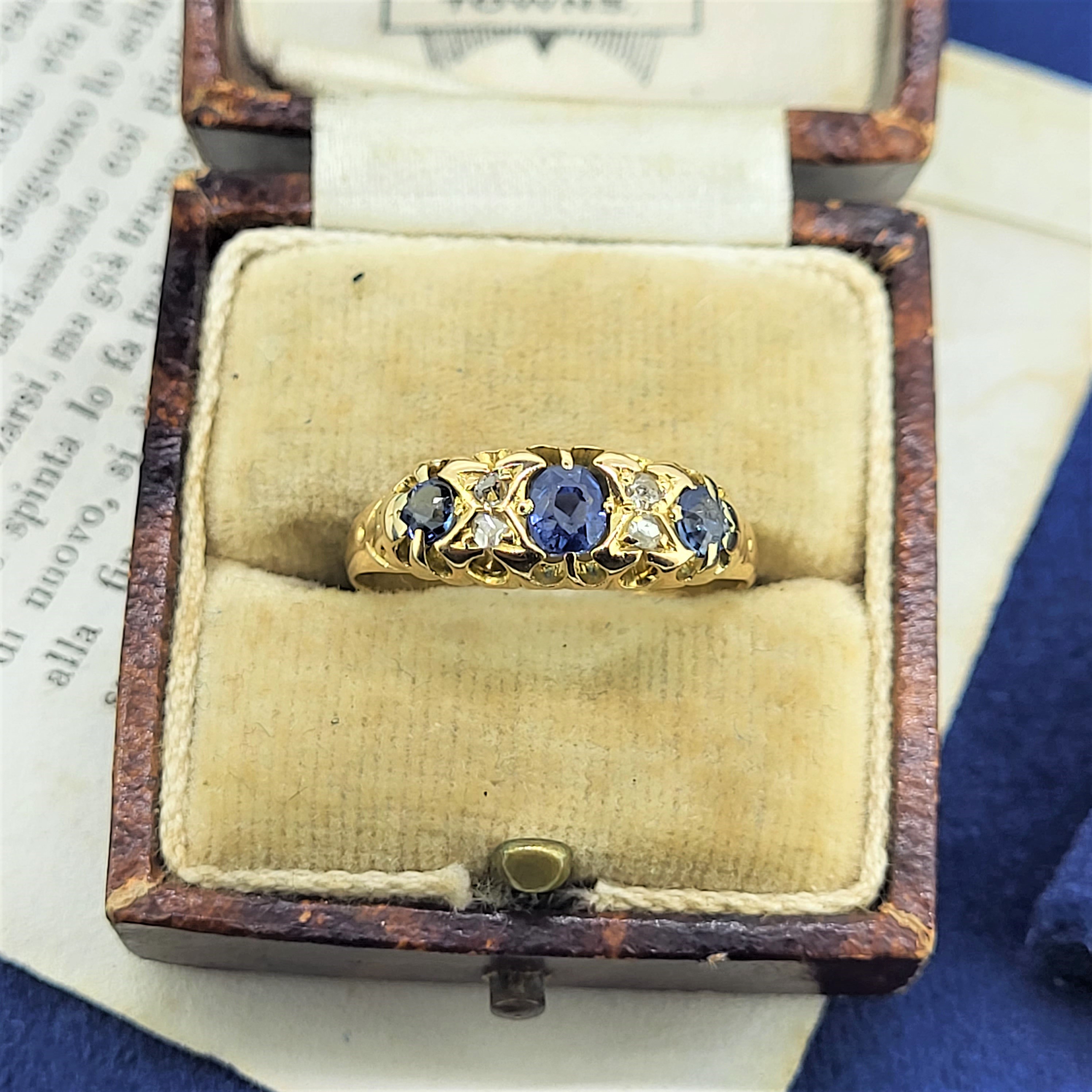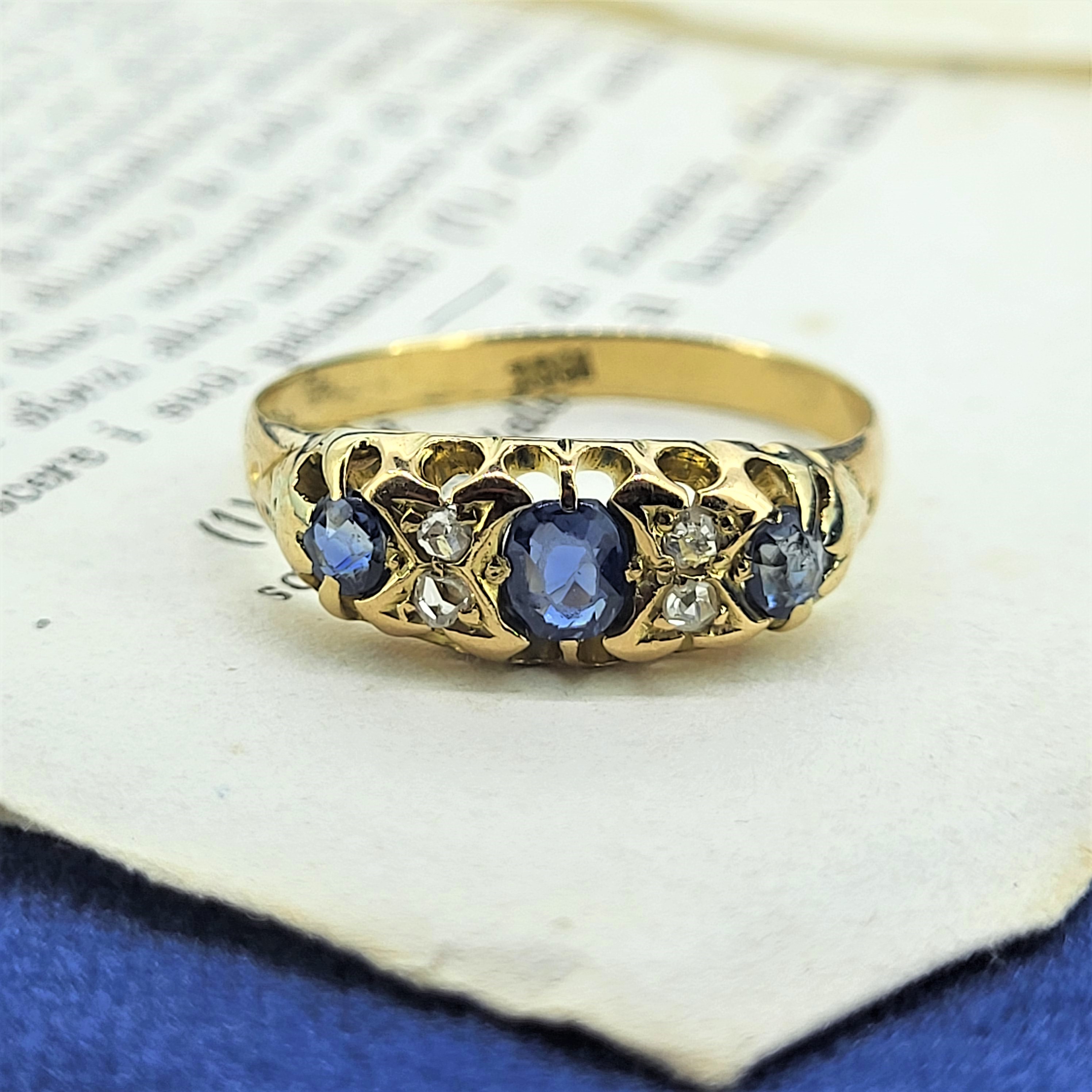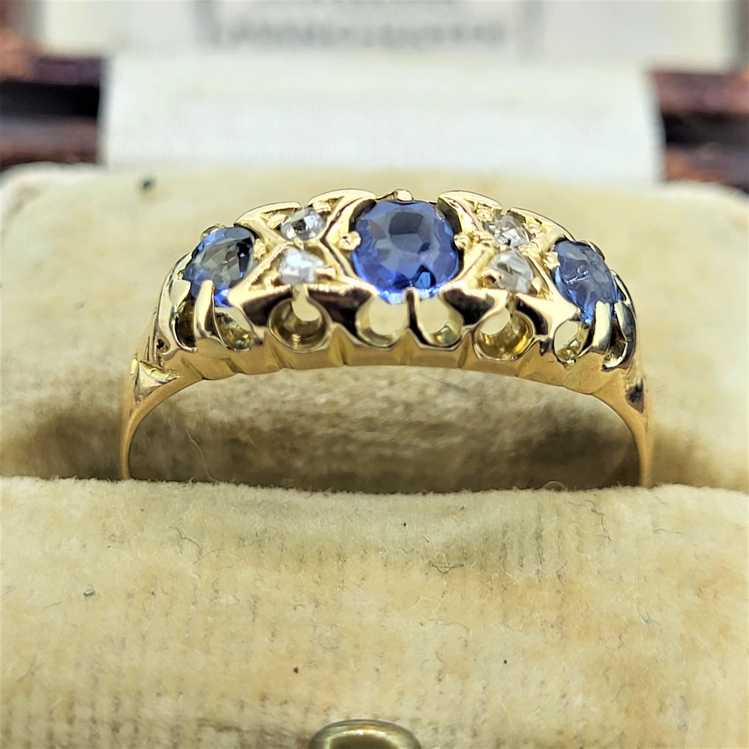 This lovely ring is Stamped 18ct and features Sapphires and Diamonds in a smooth setting. This ring is not hallmarked but was probably produced in the early 1900s. It weighs 3.2 grams, is a Size P and can be sized to fit.All photography is done in-house. These images are not enhanced or airbrushed — what you see is exactly the item you will receive.
