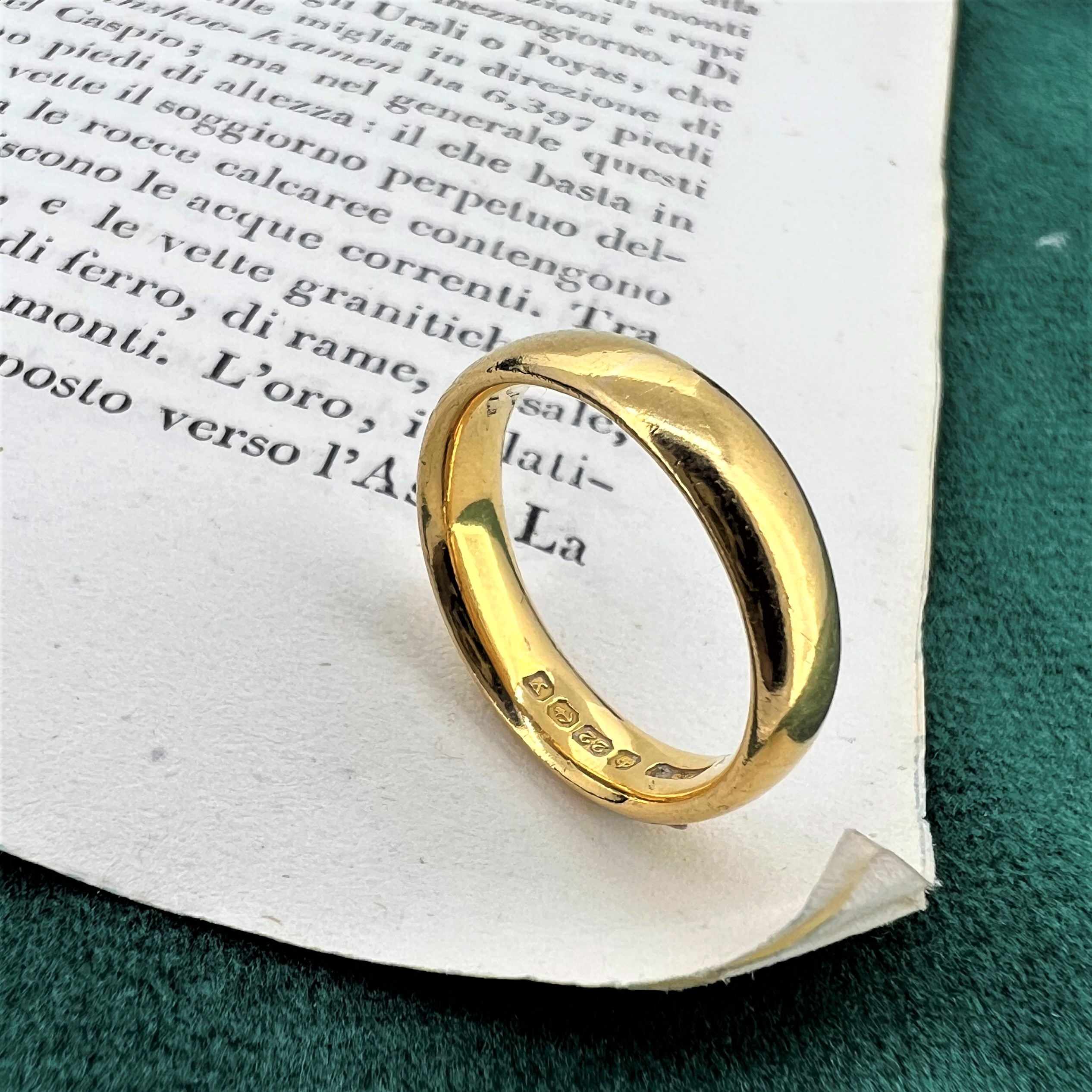 It was hallmarked in Birmingham in 1923 by K B S P for Kinsey Brothers & Patrick of Albion Street.This ring is really smooth on the finger and feels soft on the inside and outside. It weighs 6.2 grams, is a Size K 1/2 and can be sized.