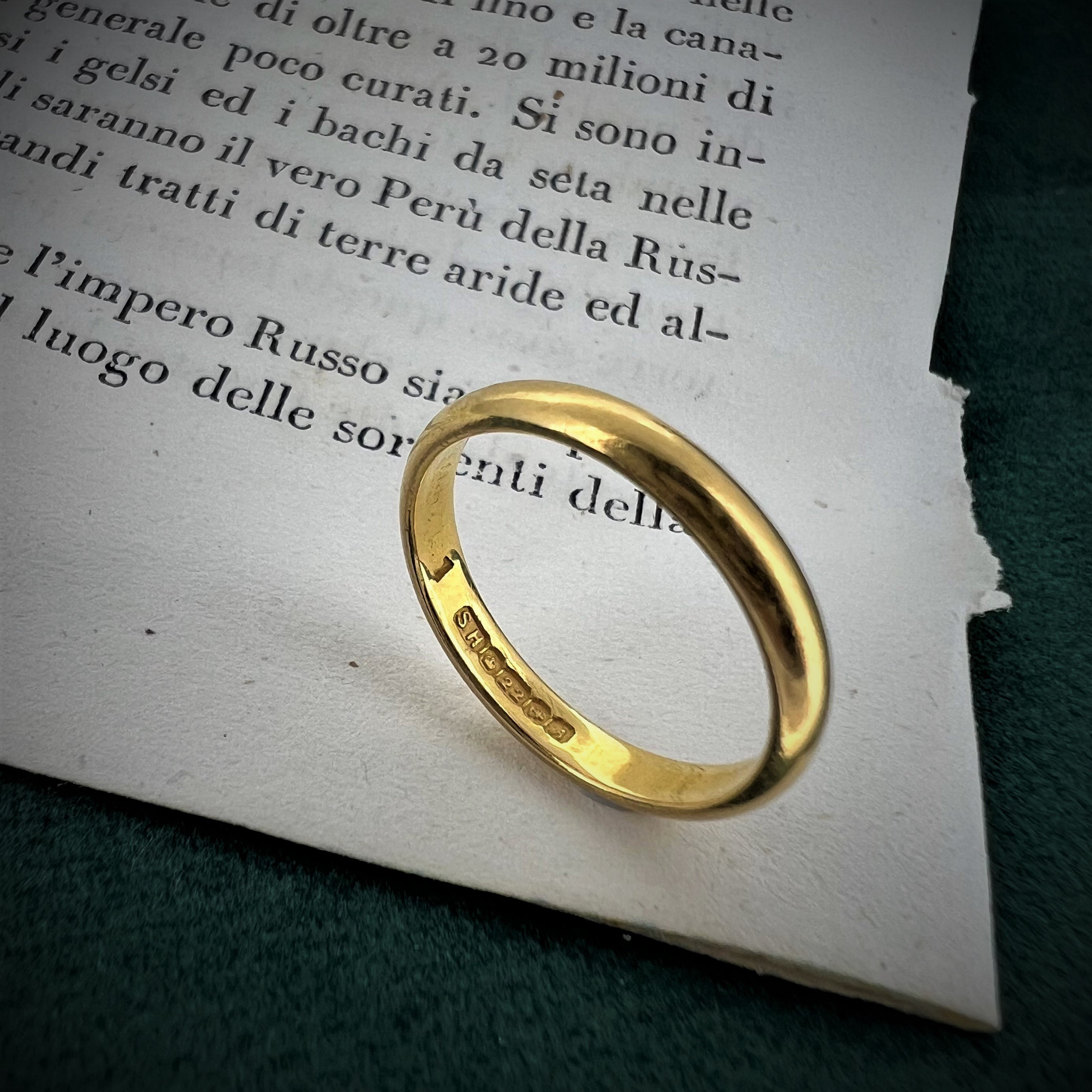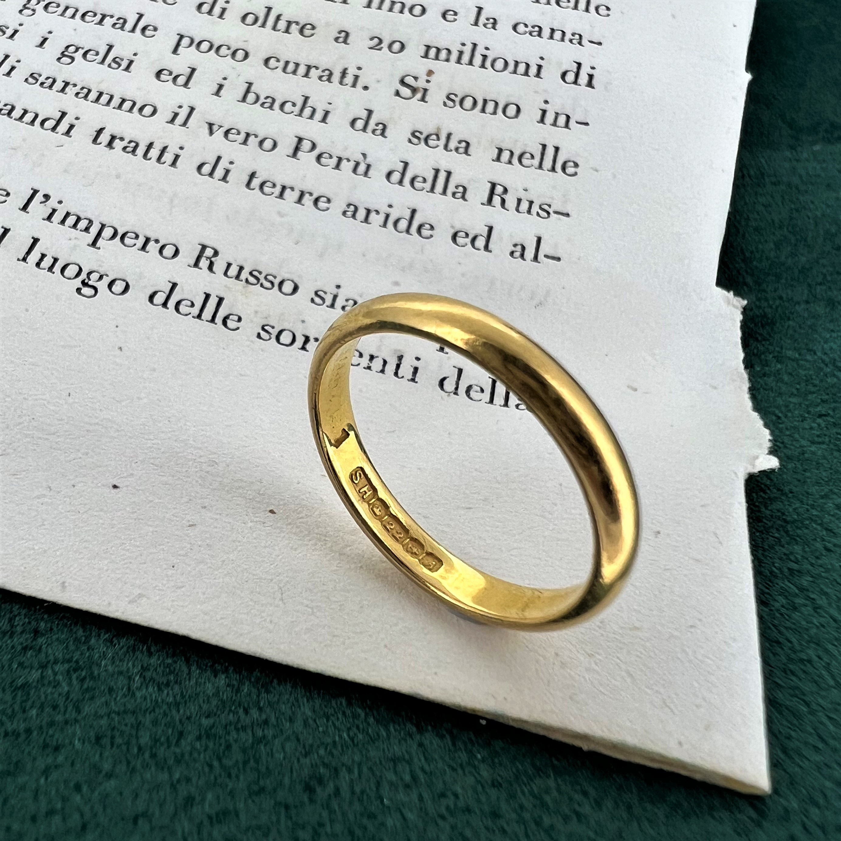 It was hallmarked in Birmingham in 1950 by S.H who we unfortunately have no further details on. It weighs 3.3 grams, is a Size K and can be sized.