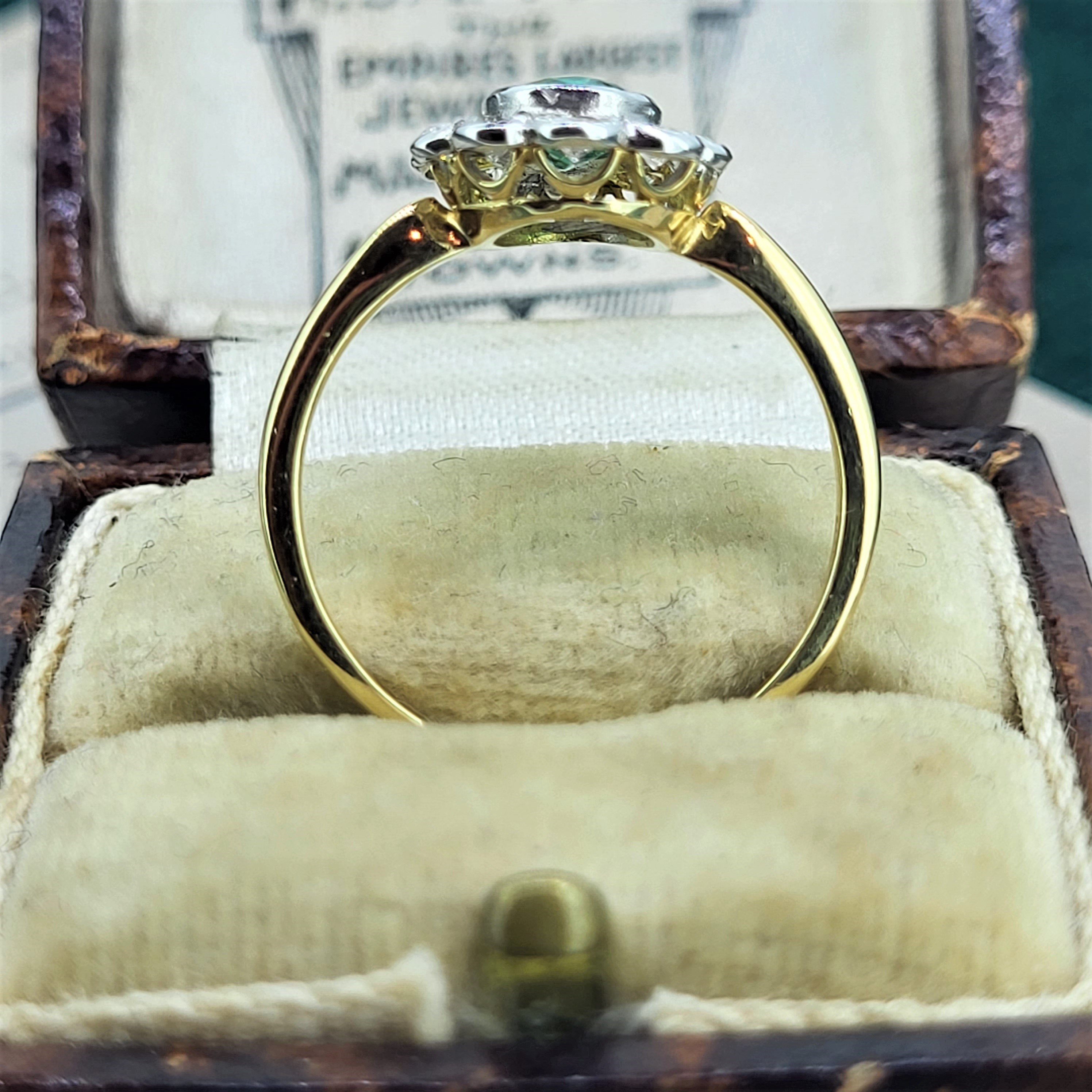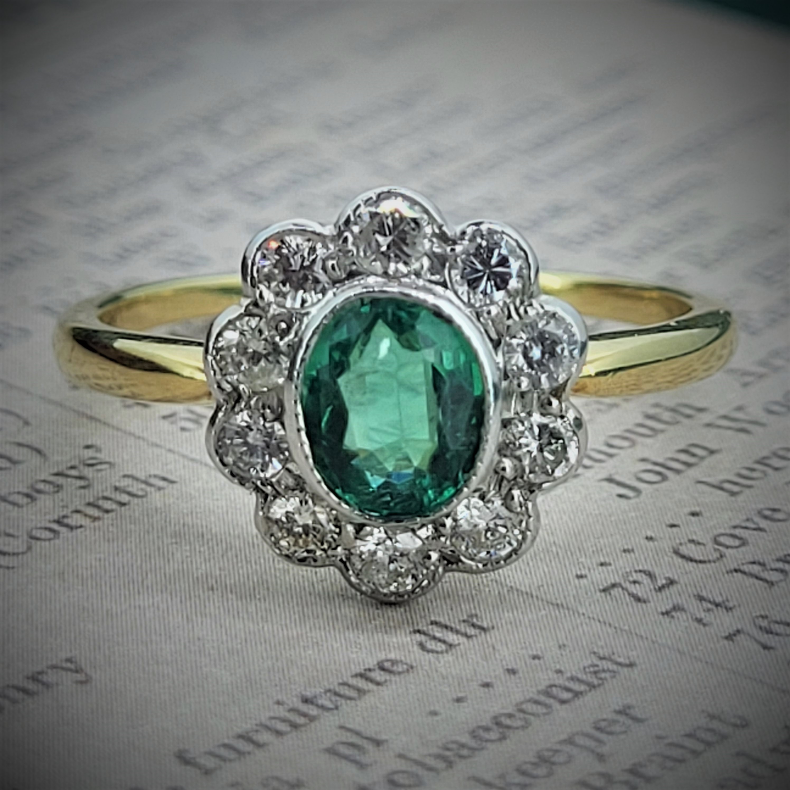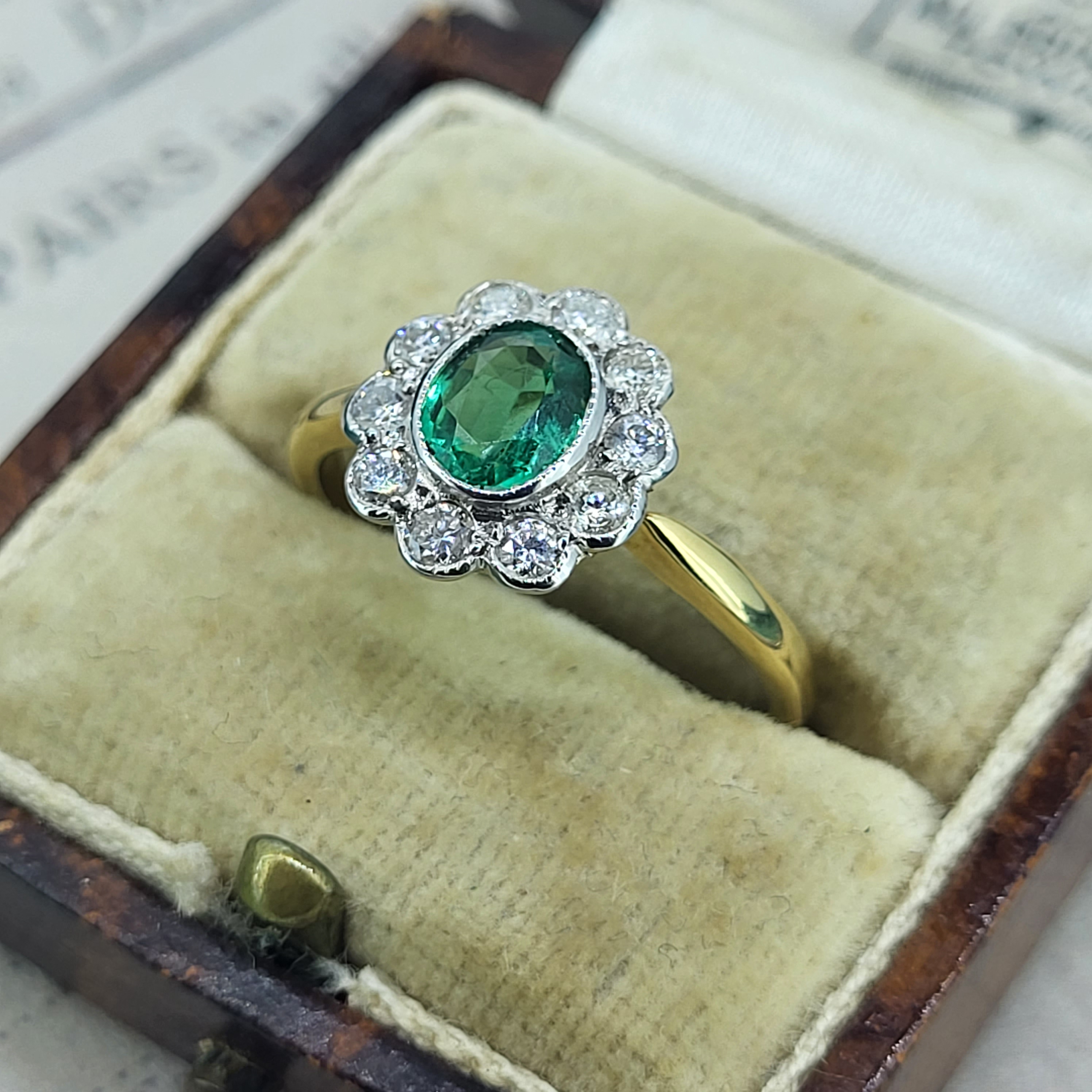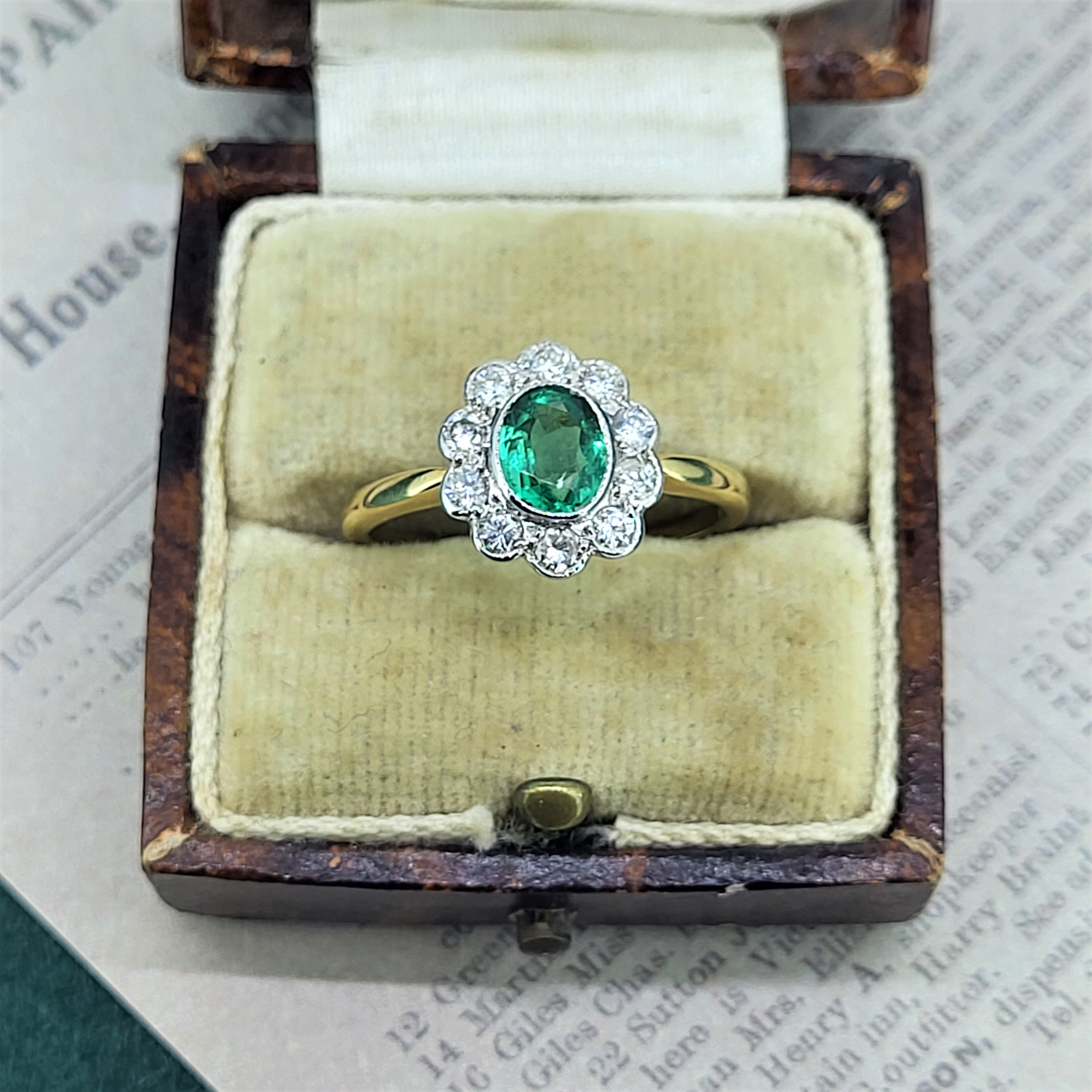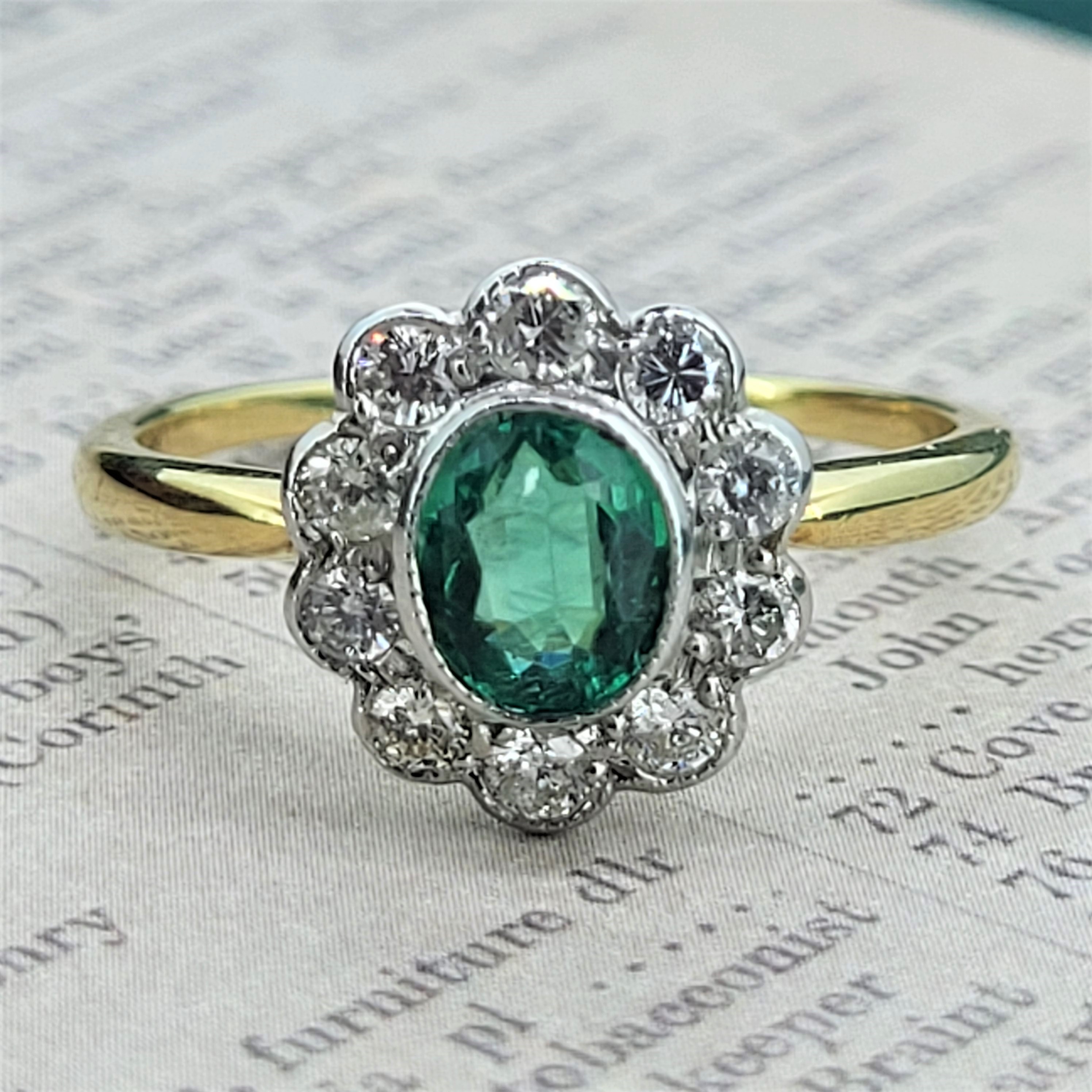 A delightful Emerald and Diamond Ring in a traditional rub-over setting. The Oval Emerald measures 6.5mm by 5.5mm and is a vibrant green which is perfectly contrasted by 0.50cts of bright white round brilliant cut diamonds.