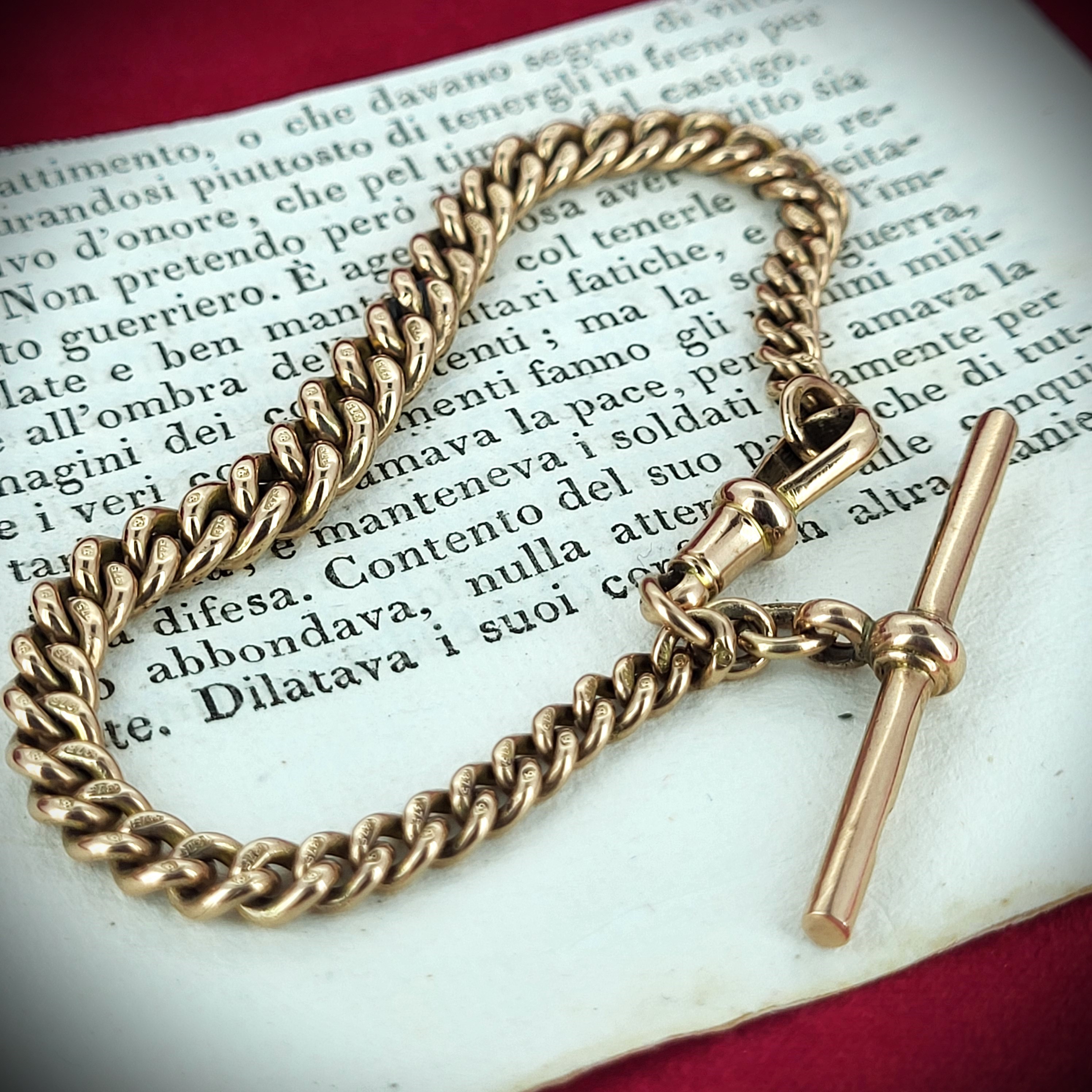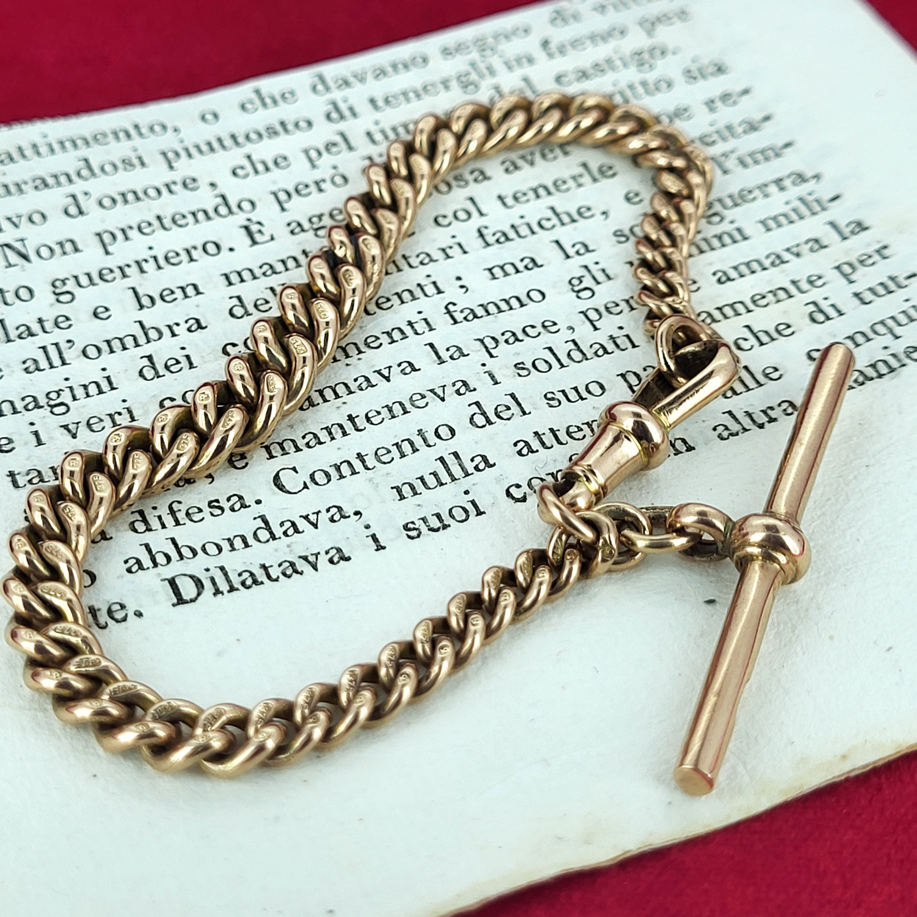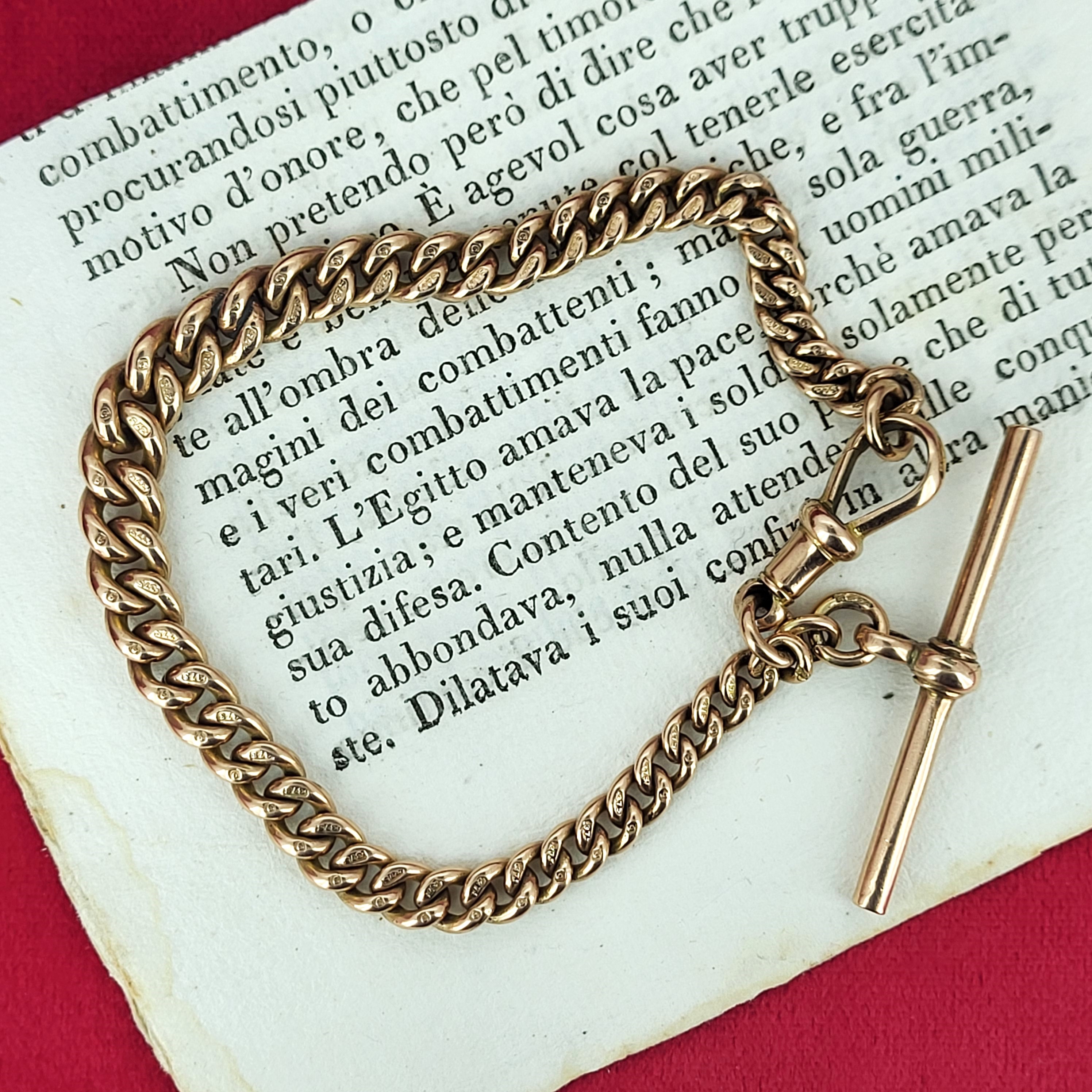 A wonderful Traditional Albert Style Bracelet with tight curb links crafted from 9ct Rose Gold. The bracelet comprises a Swivel fitting and a T-Bar measuring 4cm in length.