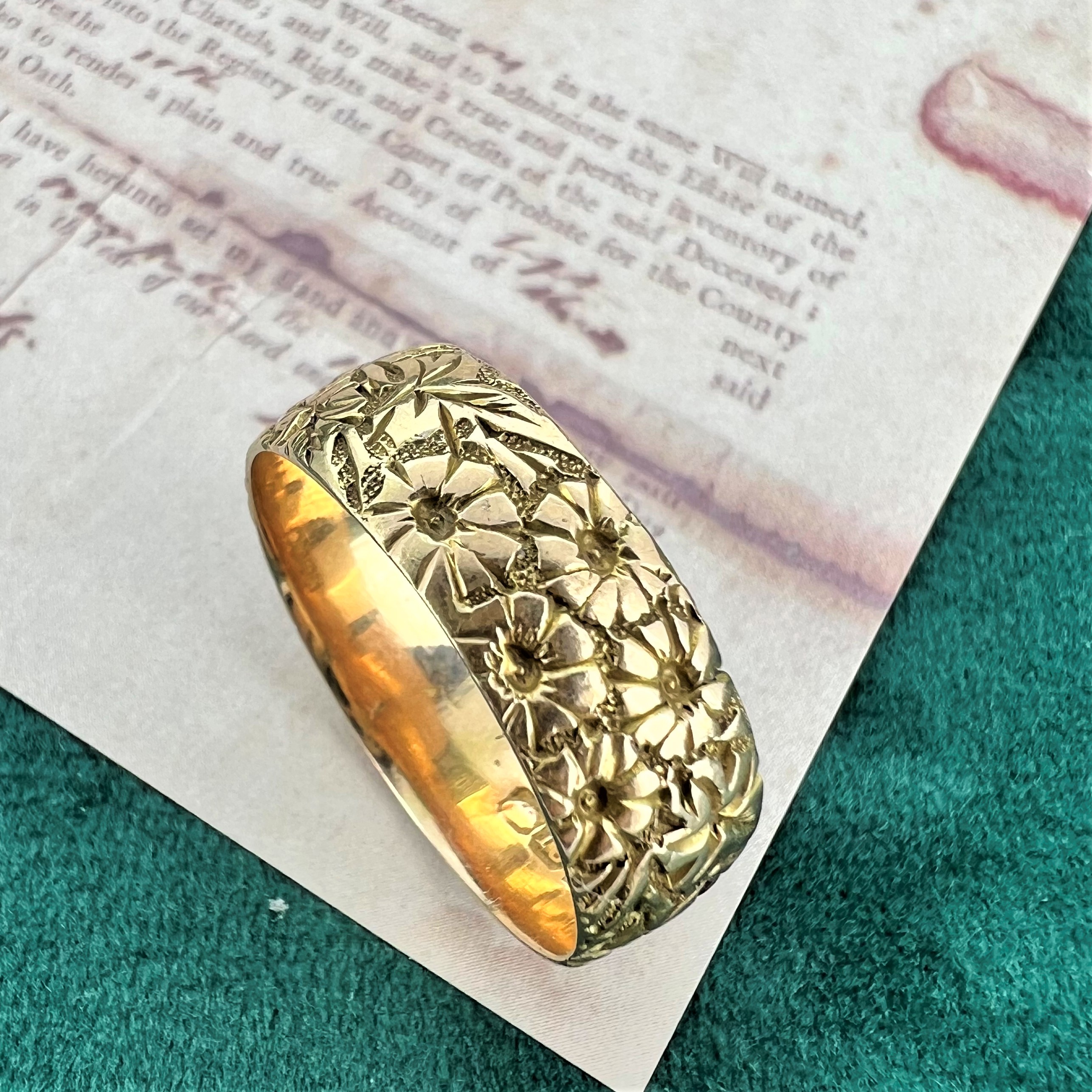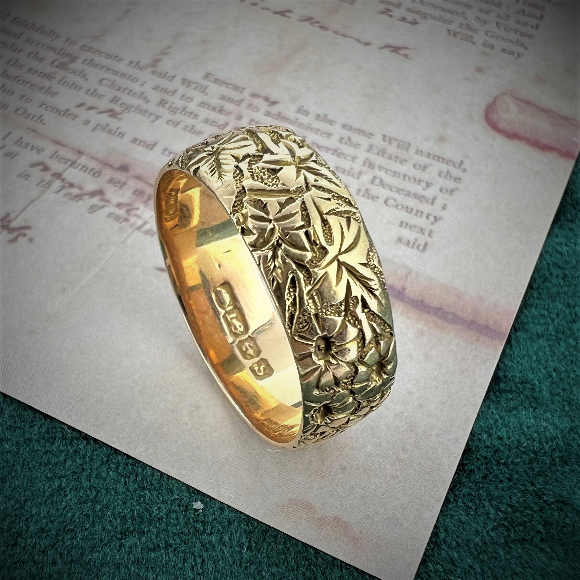 The ring measures 7mm in width and features a hand engraved pattern with flowers and leaves around the entirety of the Wedding Ring. The engraving is still deep and detailed which id surprising due to its age, it really does look stunning.