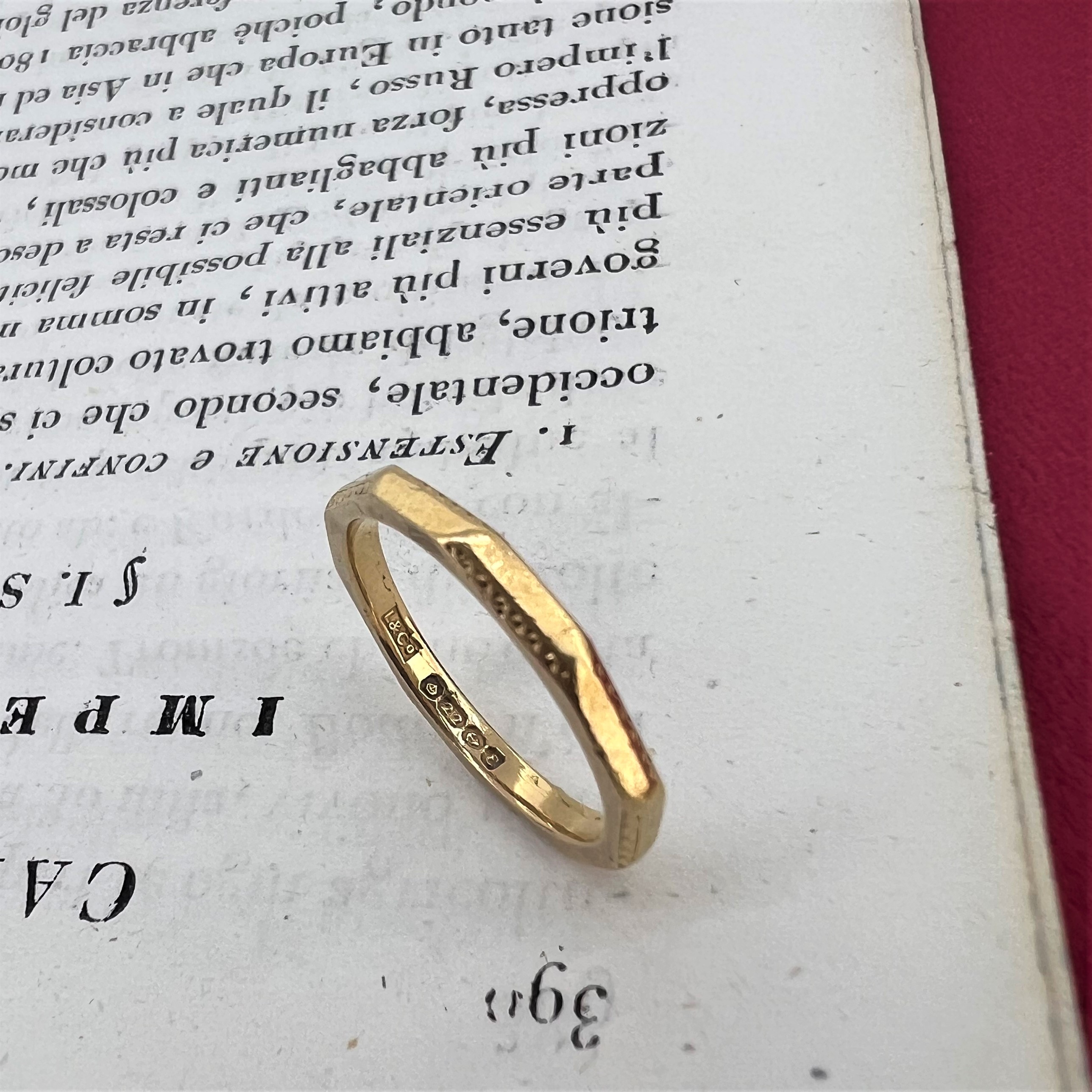 It measures 2mm across the top and is faceted, with a zig-zag engraved pattern on every other facet. There are 10 facets in total. This ring can also be worn as a stacker ring, stackable rings are bands that can fit together seamlessly and many people choose to mark a wedding anniversary by stacking additional bands on their ring finger. As it measures only 2mm it is also the perfect ring to accompany most engagement rings too.