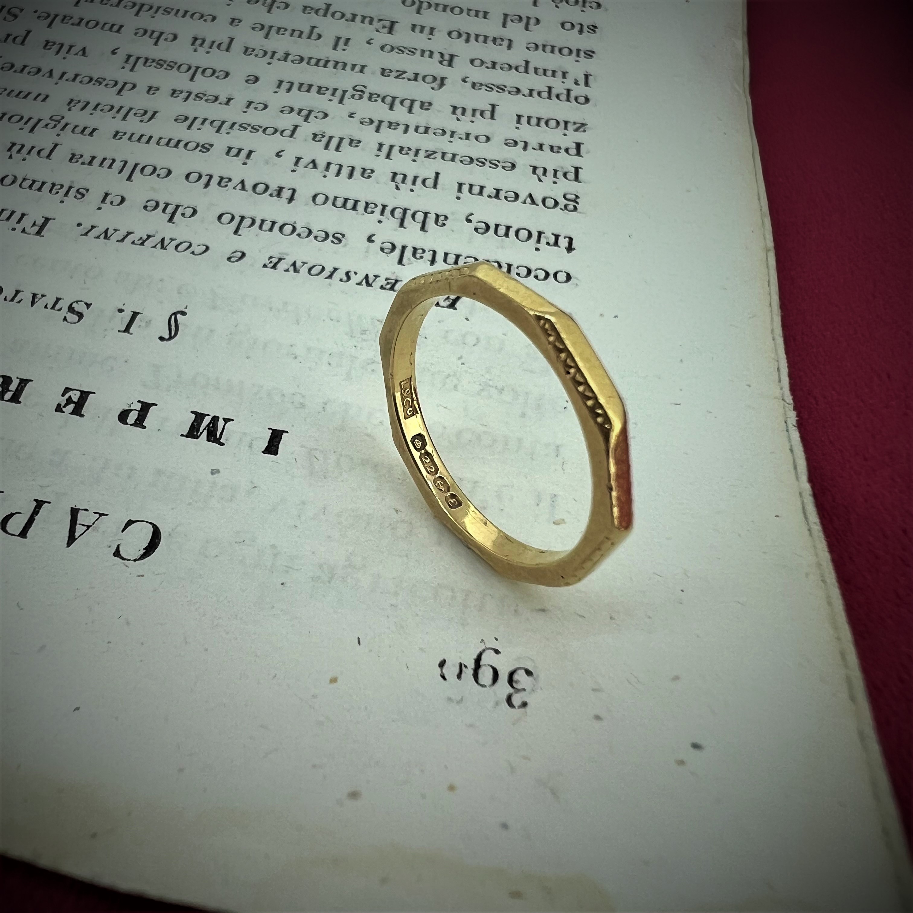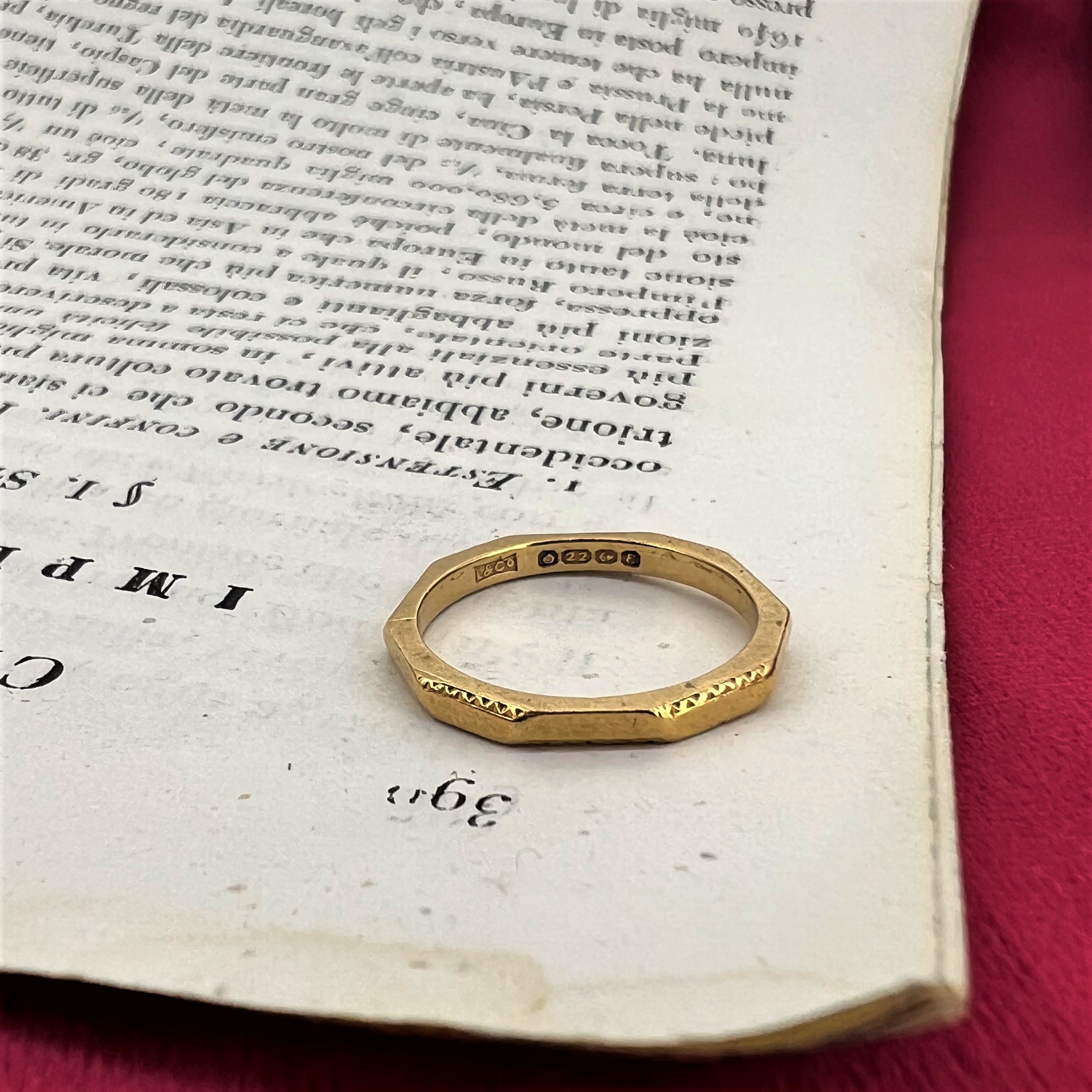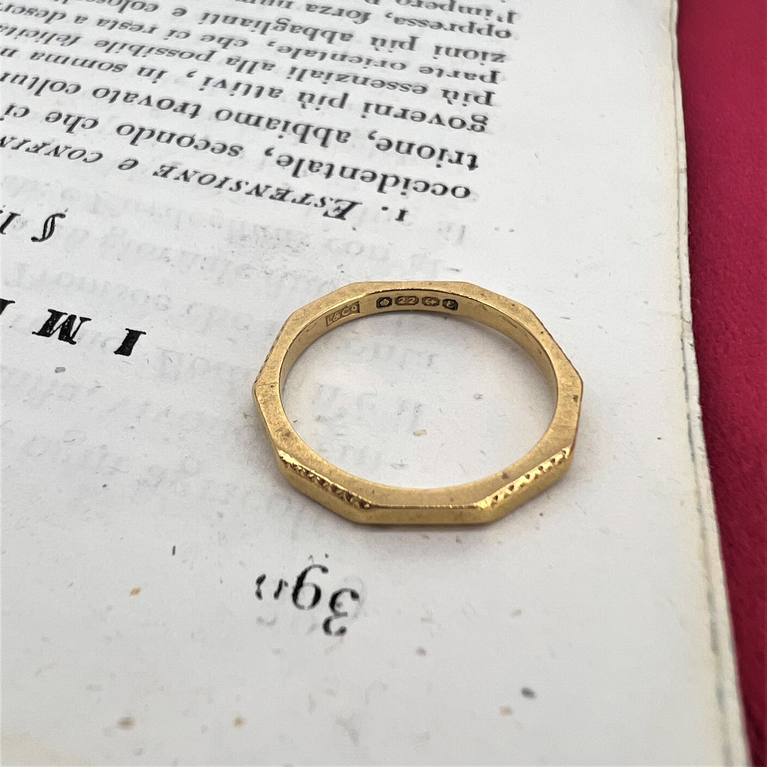 A delicate 2mm Faceted Ladies Wedding Ring crafted from 22ct Gold. The ring was hallmarked in Birmingham in 1954 by L & Co but unfortunately we can't find any further information on the Makers.