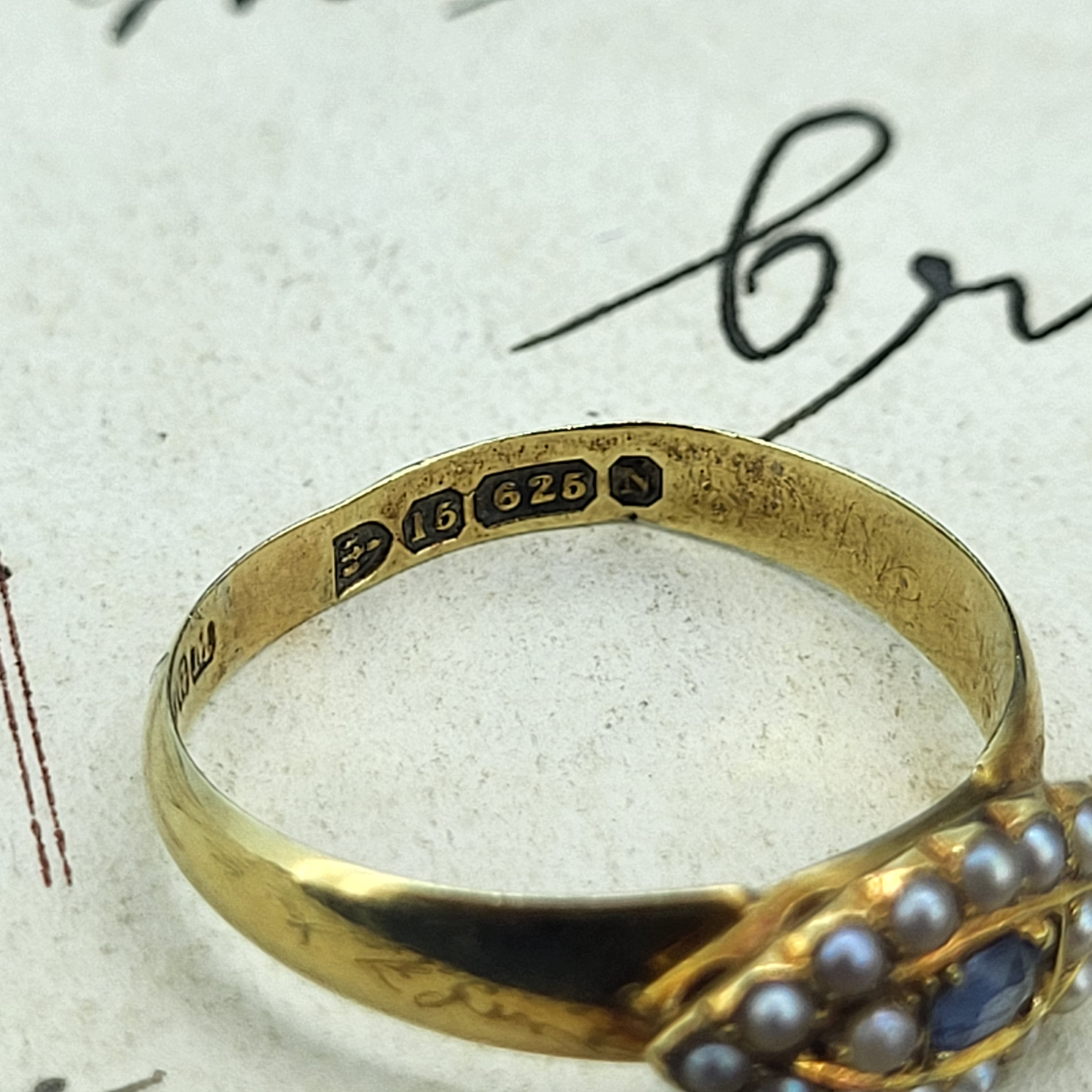 The ring was hallmarked in Chester in 1896 by W G M for W G Matthews who had premises on Hockley Street in Birmingham. They were known as Walter George Matthews and Walter Ernest Matthews and were a Father and Son Partnership.