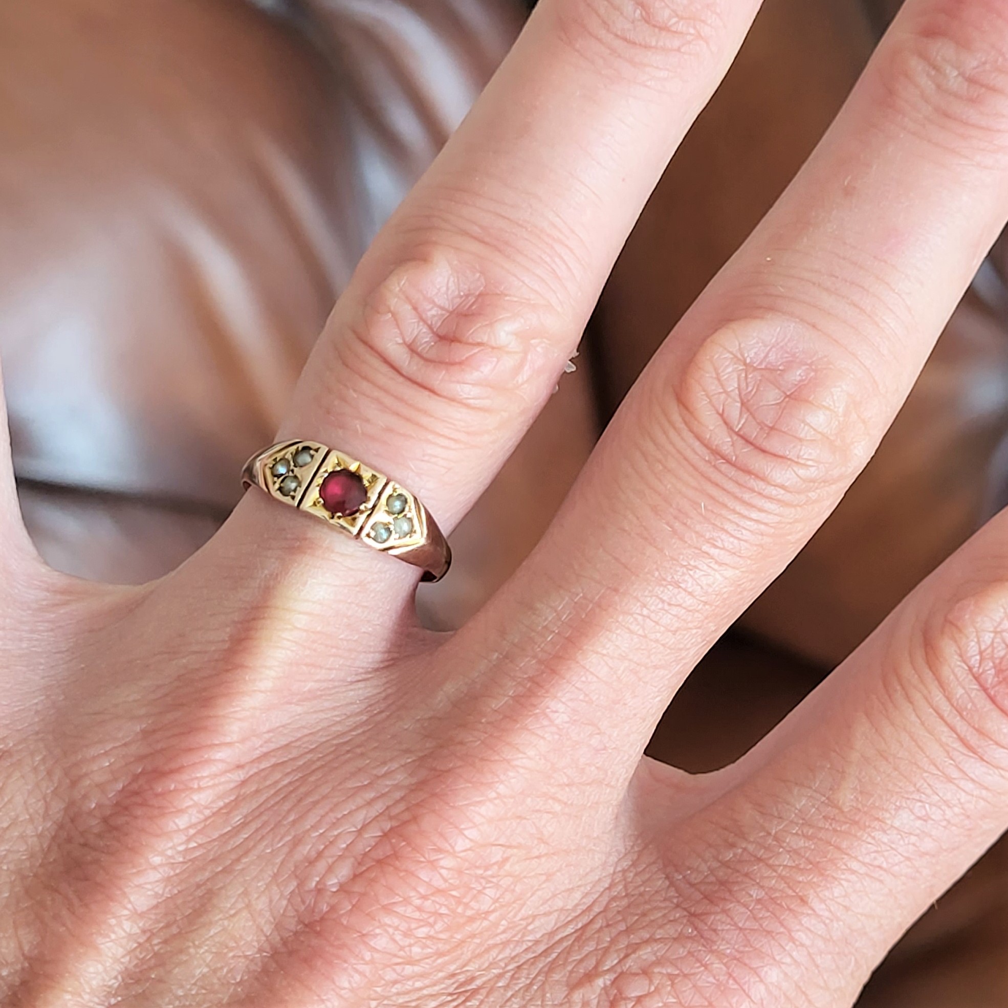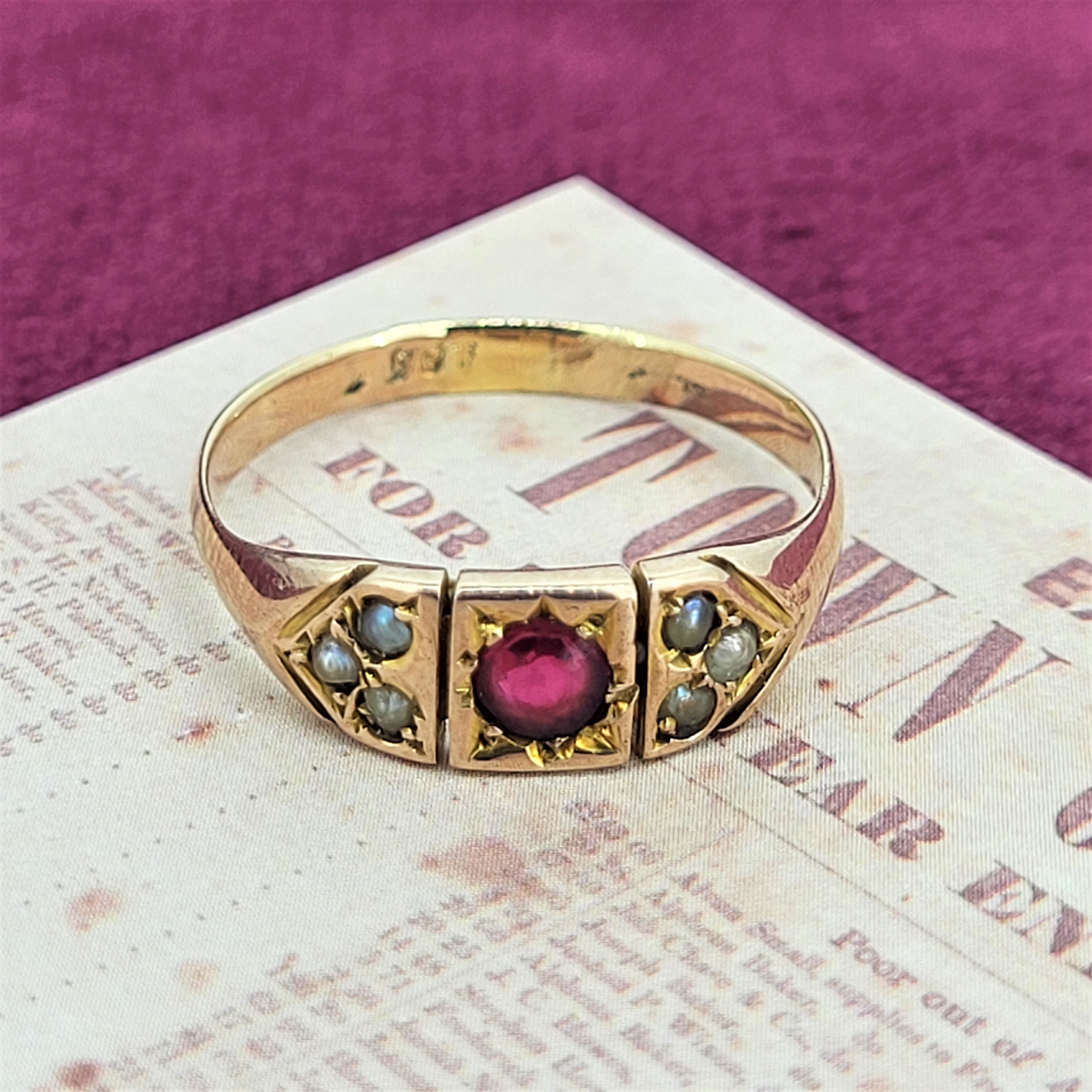A lovely 9ct Yellow Gold Ruby and Seed Pearl Ring. This ring more than likely dates back to the early 1900s but has unfortunately lost its original hallmark due to being sized.