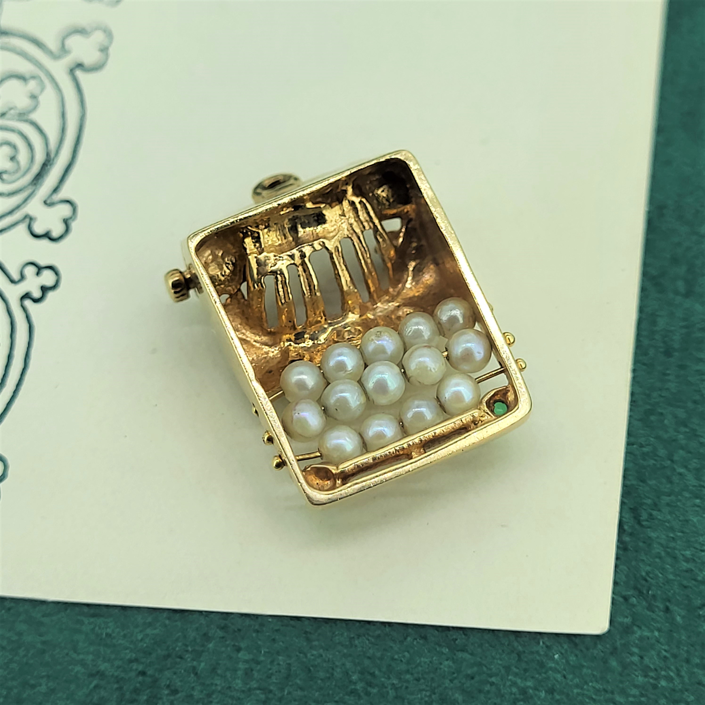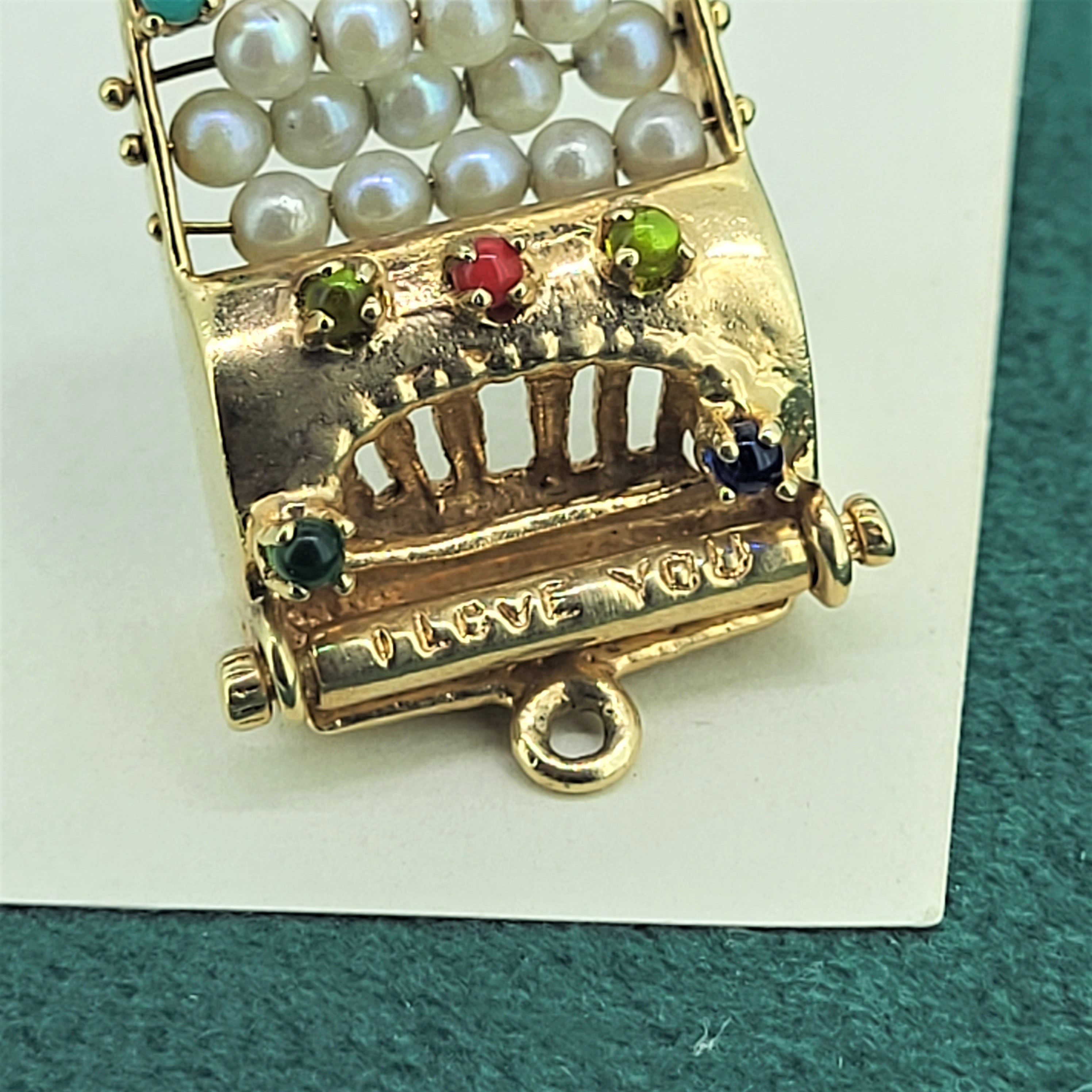 The charm measures 23mm by 17mm and the pearls move! It is also set with peridots, sapphires, turquoise and a ruby.