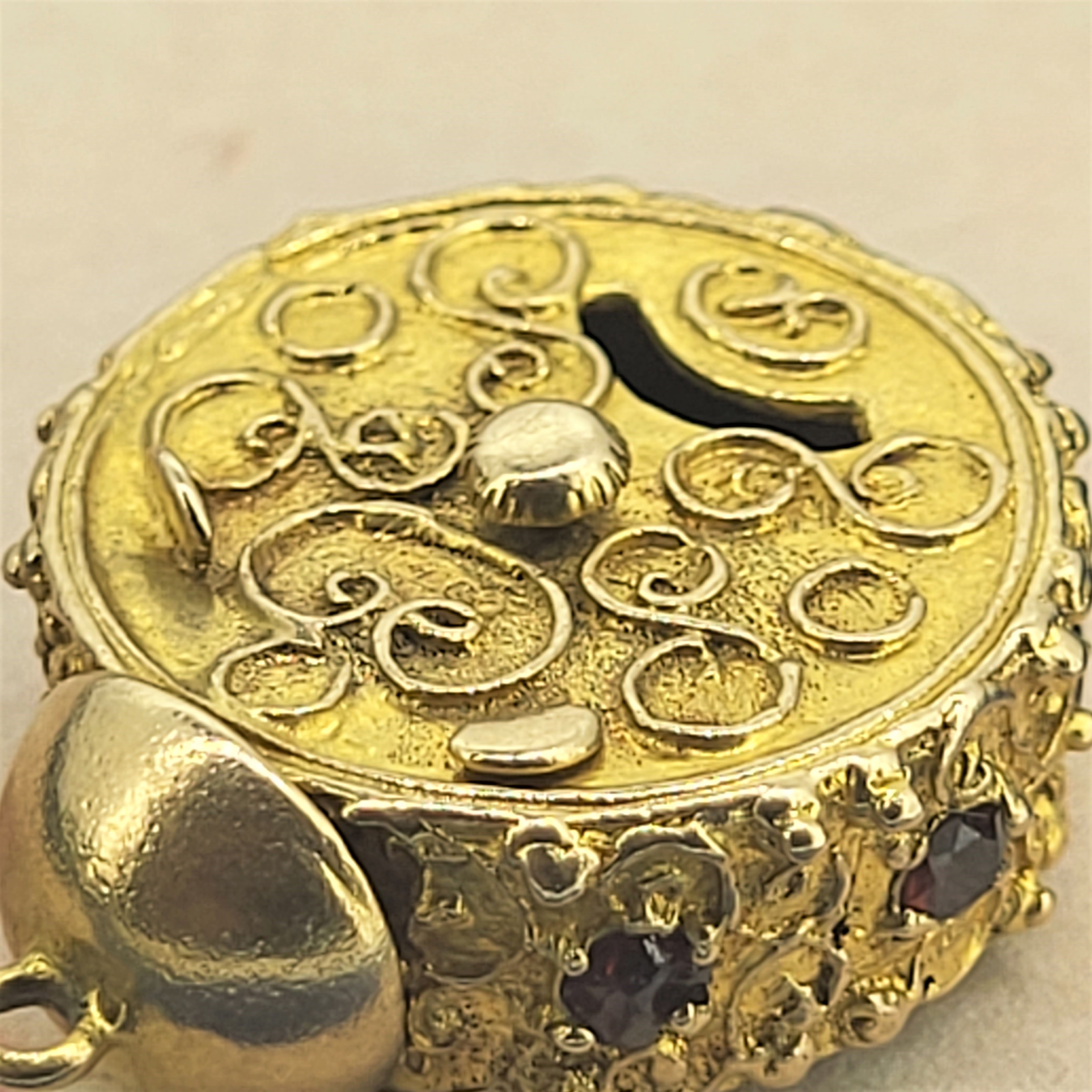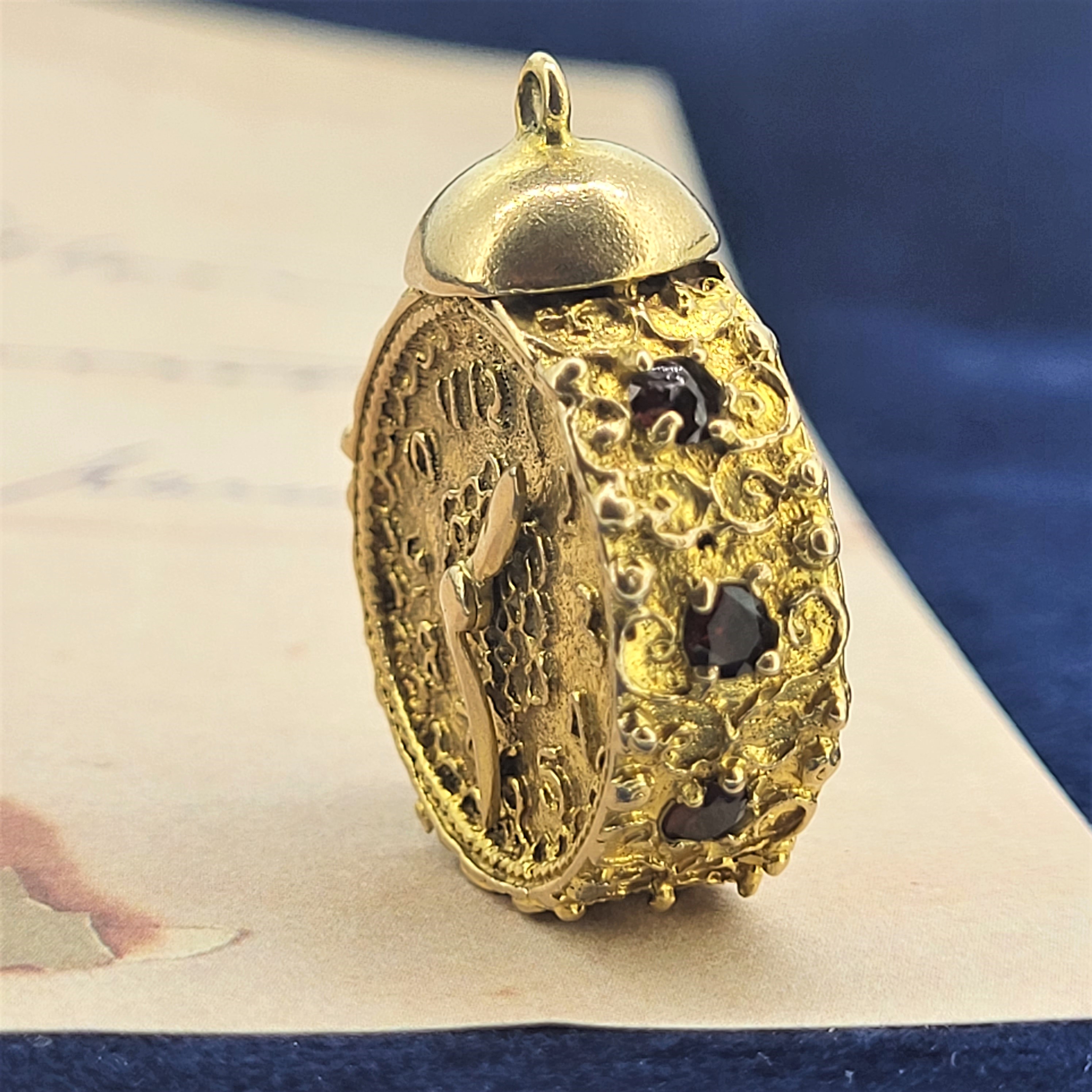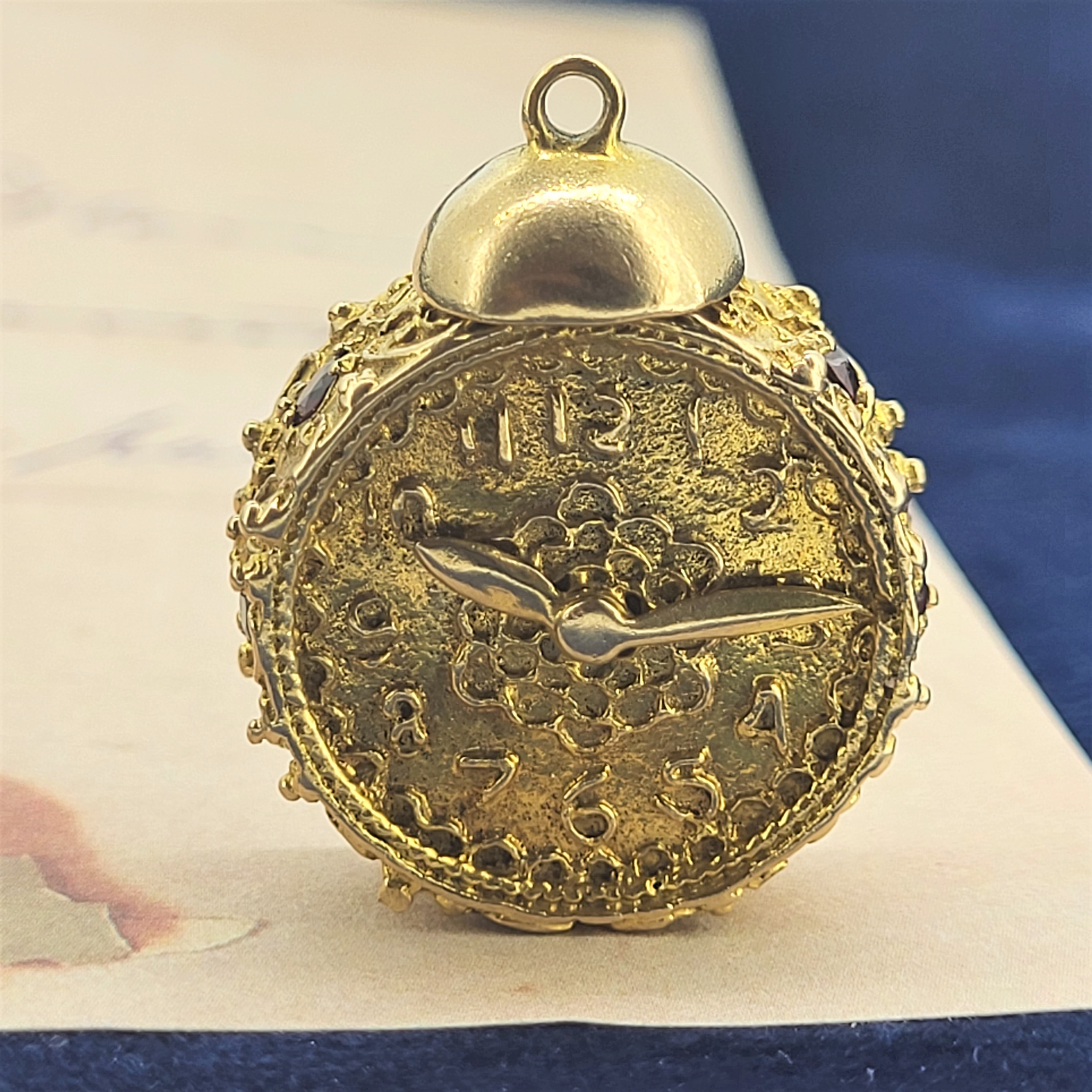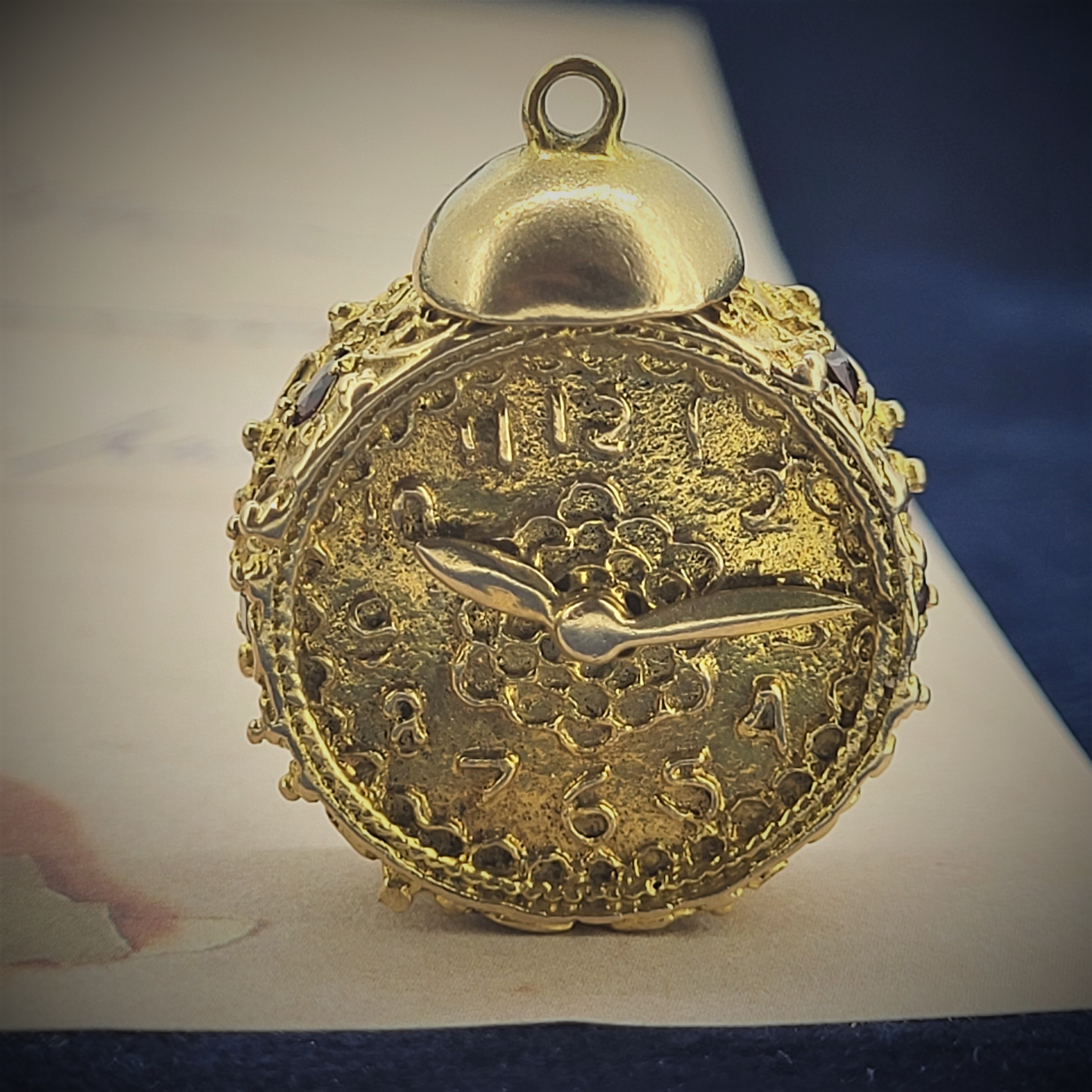 The Clock looks ornate and has six garnets set on the surround. The hands move with a small winder on the back and it is hallmarked just above the winder.